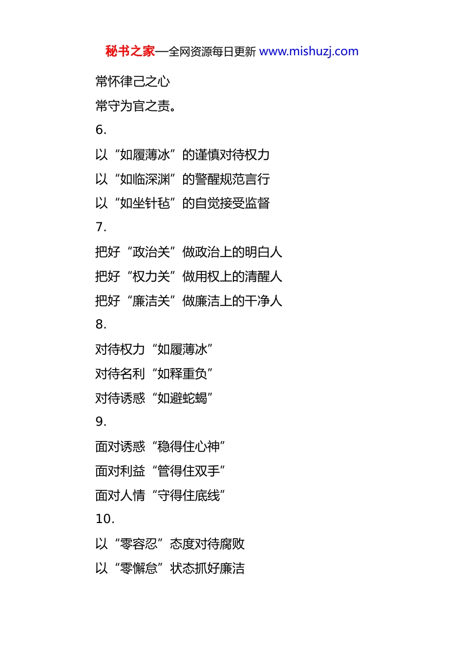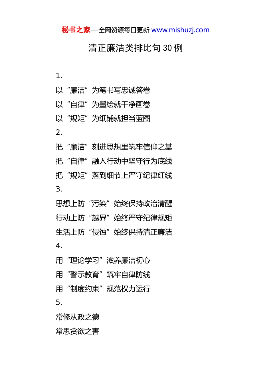 秘书之家—全网资源每日更新 www.mishuzj.com清正廉洁类排比句 30 例 1.以“廉洁”为笔书写忠诚答卷以“自律”为墨绘就干净画卷以“规矩”为纸铺就担当蓝图2.把“廉洁”刻进思想里筑牢信仰之基把“自律”融入行动中坚守行为底线把“规矩”落到细节上严守纪律红线3.思想上防“污染”始终保持政治清醒行动上防“越界”始终严守纪律规矩生活上防“侵蚀”始终保持清正廉洁4.用“理论学习”滋养廉洁初心用“警示教育”筑牢自律防线用“制度约束”规范权力运行5.常修从政之德常思贪欲之害秘书之家—全网资源每日更新 www.mishuzj.com常怀律己之心常守为官之责。6.以“如履薄冰”的谨慎对待权力以“如临深渊”的警醒规范言行以“如坐针毡”的自觉接受监督7.把好“政治关”做政治上的明白人把好“权力关”做用权上的清醒人把好“廉洁关”做廉洁上的干净人8.对待权力“如履薄冰”对待名利“如释重负”对待诱惑“如避蛇蝎”9.面对诱惑“稳得住心神”面对利益“管得住双手”面对人情“守得住底线”10.以“零容忍”态度对待腐败以“零懈怠”状态抓好廉洁秘书之家—全网资源每日更新 www.mishuzj.com以“零失误”要求规范自律。11.不是“选择题”而是“必答题”不是“软任务”而是“硬指标”不是“一阵子”而是“一辈子”12.守牢“思想防线”不为名利所惑守牢“行为底线”不为欲望所困守牢“纪律红线”不为人情所累13.思想上“绷紧弦”行动上“拉满弓”纪律上“兜住底”14.防微杜渐“勿以恶小而为之”谨言慎行“勿以善小而不为”廉洁自律“勿以权小而任性”15.政治上保持“清醒态”经济上保持“干净态”生活上保持“健康态”秘书之家—全网资源每日更新 www.mishuzj.com作风上保持“务实态”。16.以“党章党规”为镜校准思想偏差以“先进典型”为旗激发奋进动力以“反面案例”为鉴敲响警示警钟17.把“廉洁”刻在心上让自律成为本能把“规矩”握在手中让拒腐成为自觉把“责任”扛在肩上让担当成为常态18.廉洁是“政治生命线”一刻也不能放松自律是“作风保障线”一丝也不能马虎规矩是“纪律警戒线”一点也不能逾越19.对待群众“真心实意”对待工作“真抓实干”对待纪律“真严真管”对待自己“真廉真洁”20.用“廉洁文化”浸润心灵用“自律准则”约束行为秘书之家—全网资源每日更新 www.mishuzj.com用“规矩意识”指导实践。21.“抓早”防患于未然“抓小”堵塞漏洞“抓常”形成常态22.把好“入口关”筑牢思想防线把好“过程关”规范权力运行把好“出口关”强化监督问责23.以“零容忍”态度对待腐败以“零懈怠”状态抓好廉洁以“零失误”要求规范自律24.思想上“不跑偏”始终坚定理想信念行动上“不越线”始终严守纪律规矩生活上“不褪色”始终保持清正廉洁25.用“铁的信念”筑牢廉洁防线用“铁的纪律”约束自身行为用“铁的担当”践行初心使命。秘书之家—全网资源每日更新 www.mishuzj.com26.廉洁是“底色”要始终保持自律是“本色”要始终坚守规矩是“亮色”要始终彰显27.面对诱惑“稳得住心神”面对利益“管得住双手”面对人情“守得住底线”28.“心有所畏”敬畏党章党规“言有所戒”不说违规违纪话“行有所止”不做越界出格事29.把“廉洁”写进日常让自律成为习惯把“规矩”融入细节让拒腐成为自觉30.以“初心”为舵把准廉洁方向以“使命”为帆驱动自律航程以“规矩”为锚固定拒腐立场。