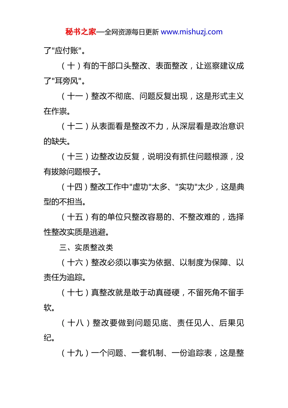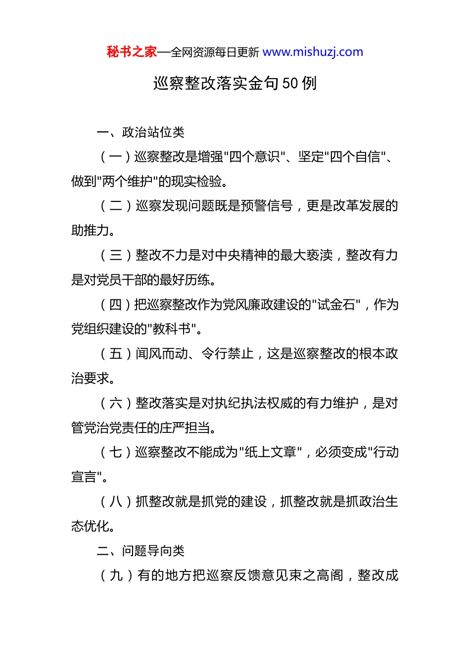 秘书之家—全网资源每日更新 www.mishuzj.com巡察整改落实金句 50 例 一、政治站位类(一)巡察整改是增强"四个意识"、坚定"四个自信"、做到"两个维护"的现实检验。(二)巡察发现问题既是预警信号,更是改革发展的助推力。(三)整改不力是对中央精神的最大亵渎,整改有力是对党员干部的最好历练。(四)把巡察整改作为党风廉政建设的"试金石",作为党组织建设的"教科书"。(五)闻风而动、令行禁止,这是巡察整改的根本政治要求。(六)整改落实是对执纪执法权威的有力维护,是对管党治党责任的庄严担当。(七)巡察整改不能成为"纸上文章",必须变成"行动宣言"。(八)抓整改就是抓党的建设,抓整改就是抓政治生态优化。二、问题导向类(九)有的地方把巡察反馈意见束之高阁,整改成秘书之家—全网资源每日更新 www.mishuzj.com了"应付账"。(十)有的干部口头整改、表面整改,让巡察建议成了"耳旁风"。(十一)整改不彻底、问题反复出现,这是形式主义在作祟。(十二)从表面看是整改不力,从深层看是政治意识的缺失。(十三)边整改边反复,说明没有抓住问题根源,没有拔除问题根子。(十四)整改工作中"虚功"太多、"实功"太少,这是典型的不担当。(十五)有的单位只整改容易的、不整改难的,选择性整改实质是逃避。三、实质整改类(十六)整改必须以事实为依据、以制度为保障、以责任为追踪。(十七)真整改就是敢于动真碰硬,不留死角不留手软。(十八)整改要做到问题见底、责任见人、后果见纪。(十九)一个问题、一套机制、一份追踪表,这是整秘书之家—全网资源每日更新 www.mishuzj.com改落实的"三件套"。(二十)整改的终极目标是让类似问题不再发生,这才是真正意义上的"触及灵魂"。(二十一)把巡察反馈的每一条意见都当作"悬剑",倒逼整改真见效。(二十二)整改工作中,"改"是表,"防"是里;没有防,就没有真正地改。(二十三)让群众成为整改的见证人和评判者,这样的整改最有生命力。四、制度建设类(二十四)整改的最高层次是制度创新,最终指向是权力约束。(二十五)一项整改、一份制度、一个机制,让巡察成果制度化、长效化。(二十六)建章立制不能"补牢",必须"未雨绸缪",抓好源头预防。(二十七)让制度长牙齿、让规则有分量,整改才能行稳致远。(二十八)整改制度要接地气、有操作性,不能成为"镜子"(只能看,看不透)。(二十九)制度设计要考虑日常可操作、困难可应秘书之家—全网资源每日更新 www.mishuzj.com对、风险可防控。(三十)把整改成果制度化,让规范成为自觉、让制度成为习惯。五、责任落实类(三十一)整改有期限但责任无期限,这是抓实整改的不二法则。(三十二)谁分管谁负责、谁主管谁落实,建立"菜单式"责任清单。(三十三)整改工作要做到有账可查、有人可问、有责可追。(三十四)追踪问责不能软,让整改不力的人"有所畏"。(三十五)把整改情况纳入党风廉政建设责任制考核,体现实实在在的约束。(三十六)为了落实而落实,这样的整改经不起检验;为了见效而整改,这样的成果才能长存。六、纵深推进类(三十七)一轮巡察、一份收获,让整改成为常态、让完善成为自觉。(三十八)整改工作不能"一阵风",要打好"持久战"。(三十九)从个案整改到系统整改,从被动整改到主秘书之家—全网资源每日更新 www.mishuzj.com动完善。(四十)举一反三、防患未然,用一个问题的整改撬动一个领域的优化。(四十一)定期"回头看",确保整改成果不反弹、质量不打折。七、作风转变类(四十二)整改过程就是干部思想认识的再教育、能力素质的新锤炼。(四十三)把巡察整改作为转变作风、树立新风的契机。(四十四)整改不是被动应对,而是主动把党风廉政建设推向深入。(四十五)每一次整改都是与消极现象的对标,都是与优秀传统的对话。八、格局升华类(四十六)巡察整改是优化政治生态的重要举措,是激励干事创业的有力保障。(四十七)抓好整改工作,既是对党忠诚的表现,也是对群众负责的体现。(四十八)整改落实彰显的是制度自信,传递的是发展信心,释放的是改革活力。秘书之家—全网资源每日更新 www.mishuzj.com(四十九)...