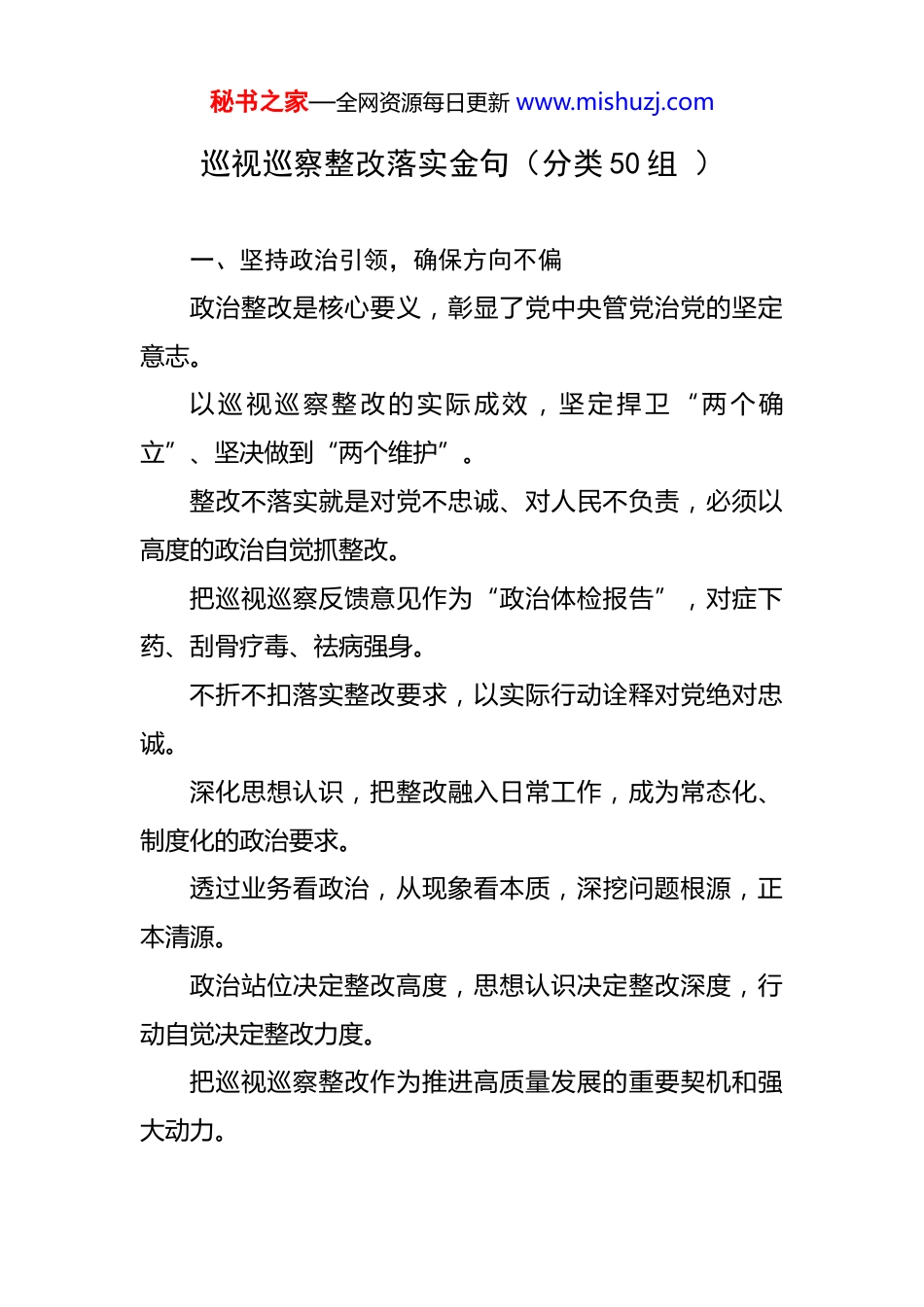 秘书之家—全网资源每日更新 www.mishuzj.com巡视巡察整改落实金句(分类 50 组 )一、坚持政治引领,确保方向不偏政治整改是核心要义,彰显了党中央管党治党的坚定意志。以巡视巡察整改的实际成效,坚定捍卫“两个确立”、坚决做到“两个维护”。整改不落实就是对党不忠诚、对人民不负责,必须以高度的政治自觉抓整改。把巡视巡察反馈意见作为“政治体检报告”,对症下药、刮骨疗毒、祛病强身。不折不扣落实整改要求,以实际行动诠释对党绝对忠诚。深化思想认识,把整改融入日常工作,成为常态化、制度化的政治要求。透过业务看政治,从现象看本质,深挖问题根源,正本清源。政治站位决定整改高度,思想认识决定整改深度,行动自觉决定整改力度。把巡视巡察整改作为推进高质量发展的重要契机和强大动力。秘书之家—全网资源每日更新 www.mishuzj.com用好巡视巡察成果,推动全面从严治党向纵深发展,净化优化政治生态。二、压实责任链条,强化担当作为党委(党组)负主体责任,书记是第一责任人,班子成员“一岗双责”。以上率下,示范引领,层层传导压力,压紧压实责任,形成整改合力。把压力传导到位,把责任落实到人,把整改抓实抓细抓出成效。知责于心、担责于身、履责于行,做到守土有责、守土尽责、守土负责。对整改敷衍塞责、虚假应付、不作为慢作为的,严肃追责问责,绝不姑息。以钉钉子精神抓整改,不见成效不撒手,不达目的不罢休。在解决具体问题中提升政治能力,在落实整改任务中彰显忠诚担当。构建上下联动、齐抓共管、协同高效的整改工作格局。以强烈的政治担当和刀刃向内的勇气推进整改,敢于动真碰硬。秘书之家—全网资源每日更新 www.mishuzj.com把巡视巡察整改与日常监督、深化改革、完善制度紧密结合起来,一体推进。三、坚持问题导向,深化标本兼治聚焦问题不散光,深挖根源不回避,全面整改不留白,务求整改彻底。对账销号,立行立改,件件有着落,事事有回音,确保问题不反弹。既要治已病,更要防未病,着力构建堵塞漏洞、解决问题的长效机制。真查真改、严查严改,不搞选择性整改,不留任何死角盲区。把整改的着力点放到解决人民群众急难愁盼问题上,办好民生实事。以小切口推动大变革,以点上突破带动面上提升,实现系统治理。系统集成,协同高效,推动各类监督贯通融合,提升监督治理效能。深化体制机制改革,从源头上堵塞漏洞,从根本上解决深层次问题。问题不解决不撒手,整改不到位不罢休,切实做到真改实改。秘书之家—全网资源每日更新 www.mishuzj.com把巡视巡察整改作为自我净化、自我完善、自我革新、自我提高的过程。四、务求整改实效,广泛接受监督用数据说话,凭事实检验,以成效取信于民,提升群众满意度。让群众看到变化、感到实惠、得到满意,才是真整改、实整改。把“当下改”与“长久立”结合起来,实现由点及面、由表及里、举一反三。开门整改,主动接受群众监督,让整改过程更加公开透明、阳光运行。以人民为中心的整改理念,确保整改成果最大限度惠及全体人民。不搞花架子,不玩文字游戏,实打实地解决问题,力戒形式主义。坚决杜绝纸上整改、数字整改、虚假整改,严防形式主义和官僚主义。整改成果是硬指标,群众口碑是真检验,党性原则是根本保障。把整改工作纳入考核评价体系,与干部选拔任用、评先评优挂钩。秘书之家—全网资源每日更新 www.mishuzj.com用实际行动回应群众关切,用整改成效赢得群众信任和支持。五、深化成果运用,推动事业发展以巡促改、以巡促建、以巡促治,全面提升国家治理体系和治理能力现代化水平。把整改成果转化为推动改革发展的强大动力和生动实践。推动管党治党责任全面覆盖、层层落实、落地见效,构建良好政治生态。把巡视巡察的“后半篇文章”做深做实做细,发挥监督治本功效。纪律的尺子,作风的镜子,监督的利剑,整改的成效,党性的磨砺。巩固扩大巡视巡察战果,持续净化政治生态,激浊扬清。将整改成果固化为制度优势,转化为治理效能,提升治理水平。以高质量整改推动各项事业高质量发展,开创发展新局面。巡视巡察利剑高悬,整改落实久久为功,全面从严治党永远在路上。