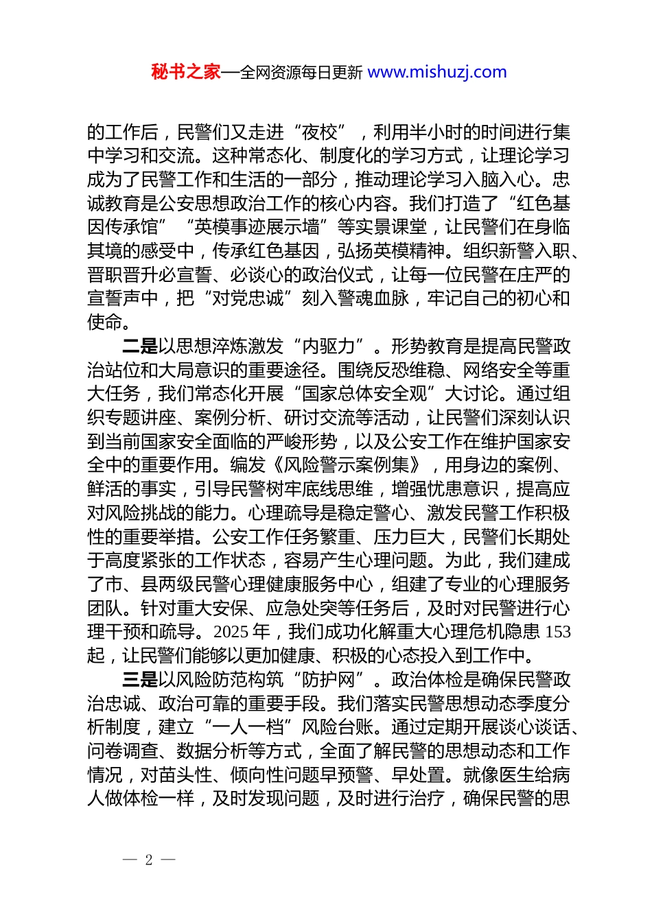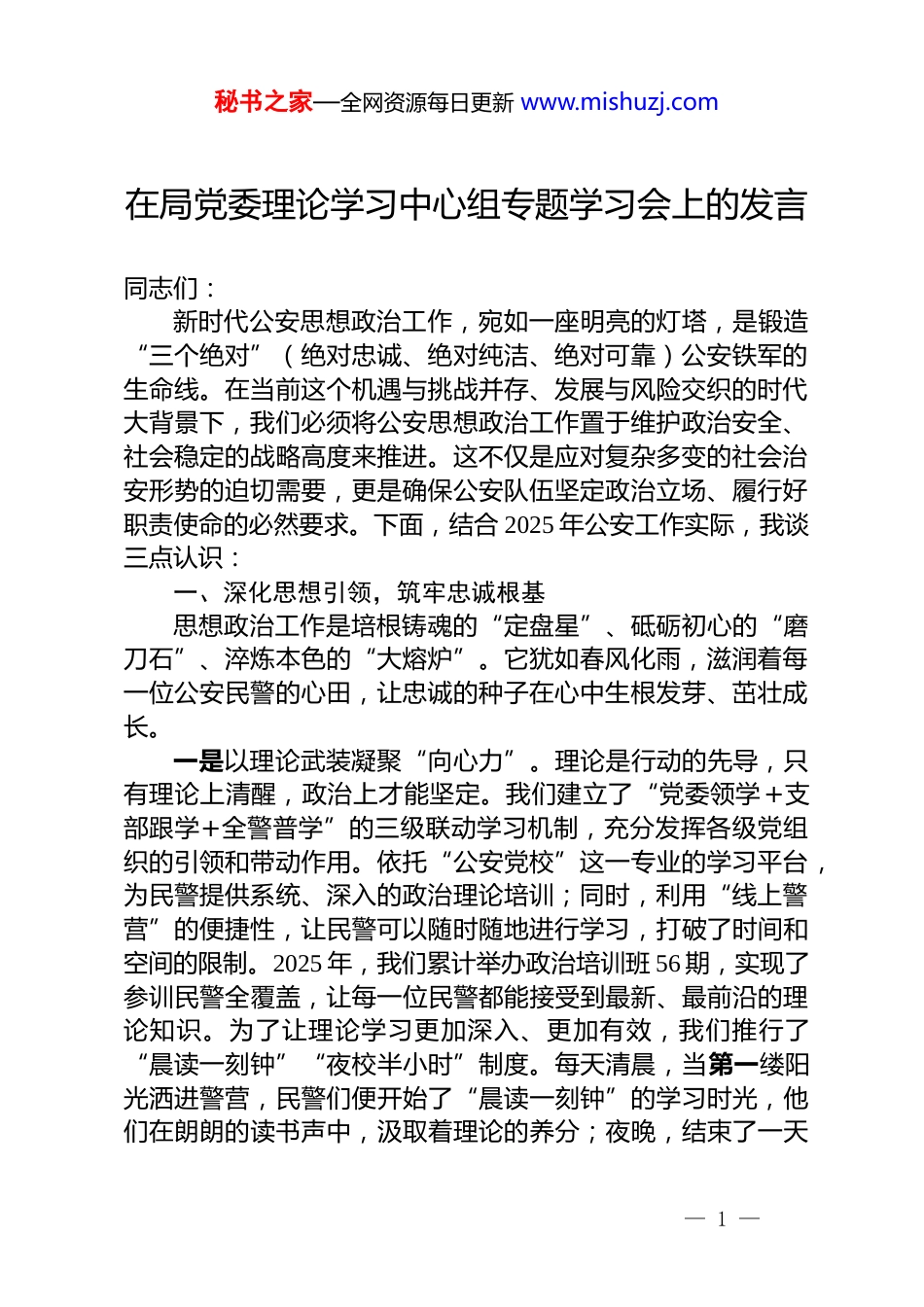 秘书之家—全网资源每日更新 www.mishuzj.com在局党委理论学习中心组专题学习会上的发言同志们:新时代公安思想政治工作,宛如一座明亮的灯塔,是锻造“三个绝对”(绝对忠诚、绝对纯洁、绝对可靠)公安铁军的生命线。在当前这个机遇与挑战并存、发展与风险交织的时代大背景下,我们必须将公安思想政治工作置于维护政治安全、社会稳定的战略高度来推进。这不仅是应对复杂多变的社会治安形势的迫切需要,更是确保公安队伍坚定政治立场、履行好职责使命的必然要求。下面,结合 2025 年公安工作实际,我谈三点认识:一、深化思想引领,筑牢忠诚根基思想政治工作是培根铸魂的“定盘星”、砥砺初心的“磨刀石”、淬炼本色的“大熔炉”。它犹如春风化雨,滋润着每一位公安民警的心田,让忠诚的种子在心中生根发芽、茁壮成长。一是以理论武装凝聚“向心力”。理论是行动的先导,只有理论上清醒,政治上才能坚定。我们建立了“党委领学+支部跟学+全警普学”的三级联动学习机制,充分发挥各级党组织的引领和带动作用。依托“公安党校”这一专业的学习平台,为民警提供系统、深入的政治理论培训;同时,利用“线上警营”的便捷性,让民警可以随时随地进行学习,打破了时间和空间的限制。2025 年,我们累计举办政治培训班 56 期,实现了参训民警全覆盖,让每一位民警都能接受到最新、最前沿的理论知识。为了让理论学习更加深入、更加有效,我们推行了“晨读一刻钟”“夜校半小时”制度。每天清晨,当第一缕阳光洒进警营,民警们便开始了“晨读一刻钟”的学习时光,他们在朗朗的读书声中,汲取着理论的养分;夜晚,结束了一天— 1 —秘书之家—全网资源每日更新 www.mishuzj.com的工作后,民警们又走进“夜校”,利用半小时的时间进行集中学习和交流。这种常态化、制度化的学习方式,让理论学习成为了民警工作和生活的一部分,推动理论学习入脑入心。忠诚教育是公安思想政治工作的核心内容。我们打造了“红色基因传承馆”“英模事迹展示墙”等实景课堂,让民警们在身临其境的感受中,传承红色基因,弘扬英模精神。组织新警入职、晋职晋升必宣誓、必谈心的政治仪式,让每一位民警在庄严的宣誓声中,把“对党忠诚”刻入警魂血脉,牢记自己的初心和使命。二是以思想淬炼激发“内驱力”。形势教育是提高民警政治站位和大局意识的重要途径。围绕反恐维稳、网络安全等重大任务,我们常态化开展“国家总体安全观”大讨论。通过组织专题讲座、案例分析、研讨交流等活动,让民警们深刻认识到当前国家安全面临的严峻形势,以及公安工作在维护国家安全中的重要作用。编发《风险警示案例集》,用身边的案例、鲜活的事实,引导民警树牢底线思维,增强忧患意识,提高应对风险挑战的能力。心理疏导是稳定警心、激发民警工作积极性的重要举措。公安工作任务繁重、压力巨大,民警们长期处于高度紧张的工作状态,容易产生心理问题。为此,我们建成了市、县两级民警心理健康服务中心,组建了专业的心理服务团队。针对重大安保、应急处突等任务后,及时对民警进行心理干预和疏导。2025 年,我们成功化解重大心理危机隐患 153起,让民警们能够以更加健康、积极的心态投入到工作中。三是以风险防范构筑“防护网”。政治体检是确保民警政治忠诚、政治可靠的重要手段。我们落实民警思想动态季度分析制度,建立“一人一档”风险台账。通过定期开展谈心谈话、问卷调查、数据分析等方式,全面了解民警的思想动态和工作情况,对苗头性、倾向性问题早预警、早处置。就像医生给病人做体检一样,及时发现问题,及时进行治疗,确保民警的思— 2 —秘书之家—全网资源每日更新 www.mishuzj.com想健康和政治安全。廉洁教育是防范民警违法违纪的重要防线。我们组织民警旁听职务犯罪庭审,让他们亲眼目睹违法犯罪行为带来的严重后果;观看警示教育片,用生动的画面和真实的案例,给民警们敲响警钟;汇编《公安干警违纪违法典型案例》,让民警们从中汲取教训,引以为戒。通过这些方式,以案为鉴,筑牢民警的廉洁自律防线,确保公安队伍的纯洁性和公正性。二、聚焦主责主业,抓实关键环节用好主阵地、把准指挥棒、守牢高...