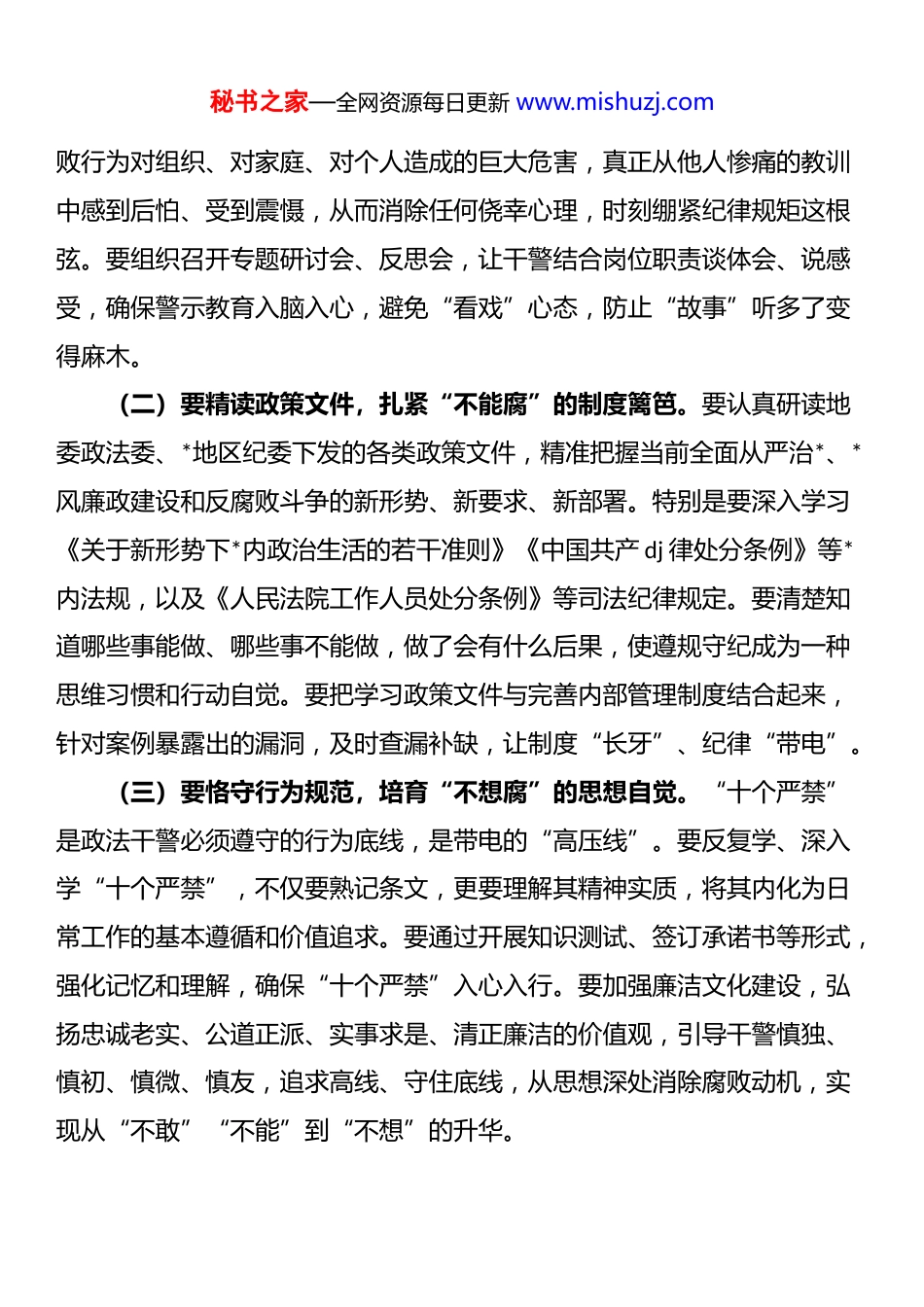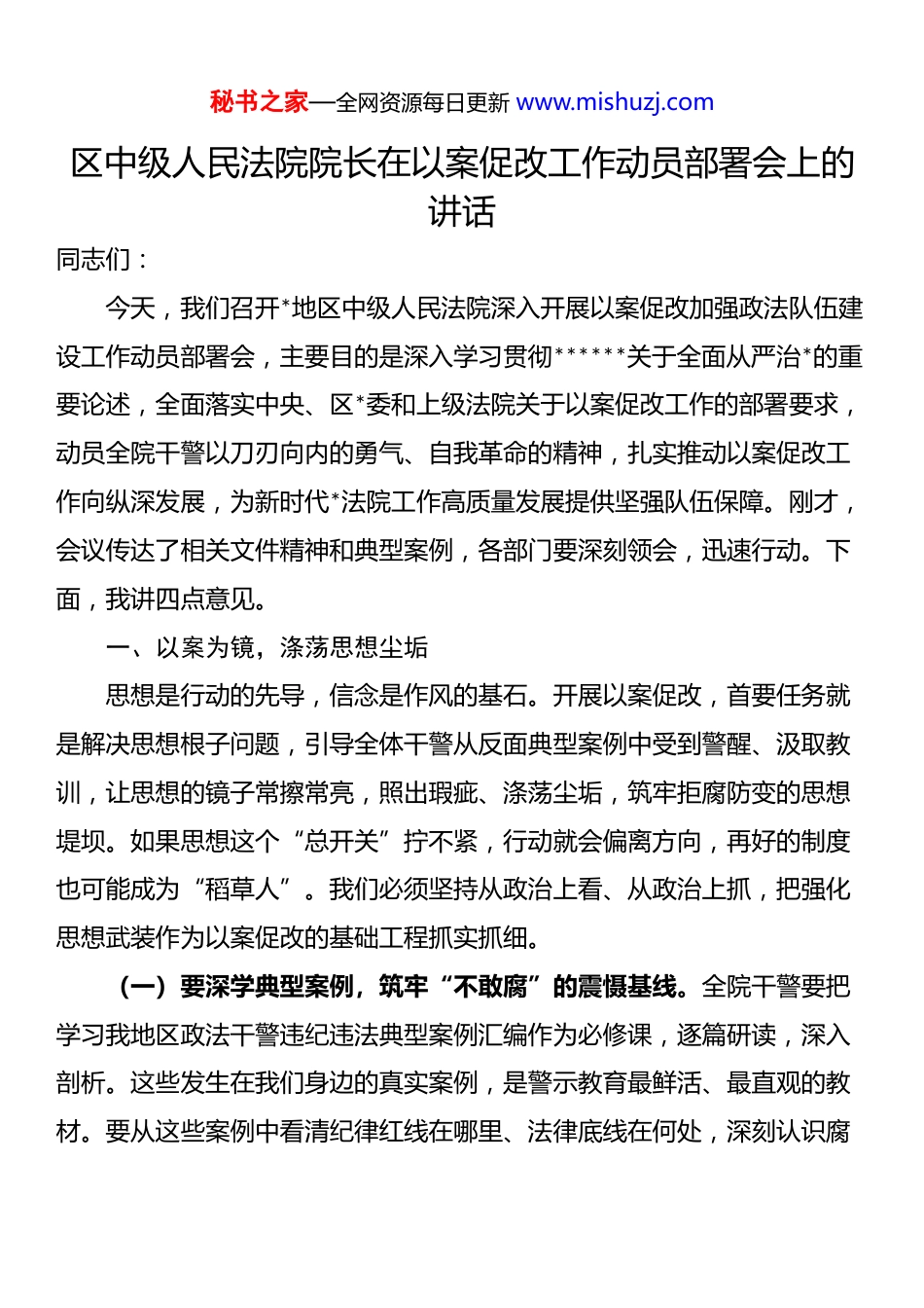 秘书之家—全网资源每日更新 www.mishuzj.com区中级人民法院院长在以案促改工作动员部署会上的讲话同志们:今天,我们召开*地区中级人民法院深入开展以案促改加强政法队伍建设工作动员部署会,主要目的是深入学习贯彻******关于全面从严治*的重要论述,全面落实中央、区*委和上级法院关于以案促改工作的部署要求,动员全院干警以刀刃向内的勇气、自我革命的精神,扎实推动以案促改工作向纵深发展,为新时代*法院工作高质量发展提供坚强队伍保障。刚才,会议传达了相关文件精神和典型案例,各部门要深刻领会,迅速行动。下面,我讲四点意见。一、以案为镜,涤荡思想尘垢思想是行动的先导,信念是作风的基石。开展以案促改,首要任务就是解决思想根子问题,引导全体干警从反面典型案例中受到警醒、汲取教训,让思想的镜子常擦常亮,照出瑕疵、涤荡尘垢,筑牢拒腐防变的思想堤坝。如果思想这个“总开关”拧不紧,行动就会偏离方向,再好的制度也可能成为“稻草人”。我们必须坚持从政治上看、从政治上抓,把强化思想武装作为以案促改的基础工程抓实抓细。(一)要深学典型案例,筑牢“不敢腐”的震慑基线。全院干警要把学习我地区政法干警违纪违法典型案例汇编作为必修课,逐篇研读,深入剖析。这些发生在我们身边的真实案例,是警示教育最鲜活、最直观的教材。要从这些案例中看清纪律红线在哪里、法律底线在何处,深刻认识腐秘书之家—全网资源每日更新 www.mishuzj.com败行为对组织、对家庭、对个人造成的巨大危害,真正从他人惨痛的教训中感到后怕、受到震慑,从而消除任何侥幸心理,时刻绷紧纪律规矩这根弦。要组织召开专题研讨会、反思会,让干警结合岗位职责谈体会、说感受,确保警示教育入脑入心,避免“看戏”心态,防止“故事”听多了变得麻木。(二)要精读政策文件,扎紧“不能腐”的制度篱笆。要认真研读地委政法委、*地区纪委下发的各类政策文件,精准把握当前全面从严治*、*风廉政建设和反腐败斗争的新形势、新要求、新部署。特别是要深入学习《关于新形势下*内政治生活的若干准则》《中国共产 dj 律处分条例》等*内法规,以及《人民法院工作人员处分条例》等司法纪律规定。要清楚知道哪些事能做、哪些事不能做,做了会有什么后果,使遵规守纪成为一种思维习惯和行动自觉。要把学习政策文件与完善内部管理制度结合起来,针对案例暴露出的漏洞,及时查漏补缺,让制度“长牙”、纪律“带电”。(三)要恪守行为规范,培育“不想腐”的思想自觉。“十个严禁”是政法干警必须遵守的行为底线,是带电的“高压线”。要反复学、深入学“十个严禁”,不仅要熟记条文,更要理解其精神实质,将其内化为日常工作的基本遵循和价值追求。要通过开展知识测试、签订承诺书等形式,强化记忆和理解,确保“十个严禁”入心入行。要加强廉洁文化建设,弘扬忠诚老实、公道正派、实事求是、清正廉洁的价值观,引导干警慎独、慎初、慎微、慎友,追求高线、守住底线,从思想深处消除腐败动机,实现从“不敢”“不能”到“不想”的升华。秘书之家—全网资源每日更新 www.mishuzj.com二、以案为戒,压实责任链条责任落实是工作推进的保证。以案促改能否取得实效,关键在责任是否层层压实、环环扣紧。必须牢固树立“抓好是本职、不抓是失职、抓不好是渎职”的理念,构建起*组负总责、班子成员齐抓共管、各部门具体落实、全体干警共同参与的责任体系,形成一级抓一级、层层传导压力的工作格局。(一)要扛起领导责任,发挥“头雁效应”。*组成员要切实履行“一岗双责”,不仅要抓好分管领域的业务工作,更要肩负起对分管部门干警的监督教育管理责任。要以身作则、率先垂范,要求干警做到的自己首先做到,要求干警不做的自己坚决不做。要定期听取分管部门以案促改工作情况汇报,加强指导督促,及时发现和解决苗头性、倾向性问题。要把以案促改与日常管理结合起来,通过谈心谈话、检查调研等方式,了解干警思想动态,抓早抓小,防微杜渐。(二)要夯实支部责任,筑牢“战斗堡垒”。各*支部要充分发挥战斗堡垒作用,把以案促改作为支部组织生活的重要内容,通过“三会一课”、主题*日等形式,组织...