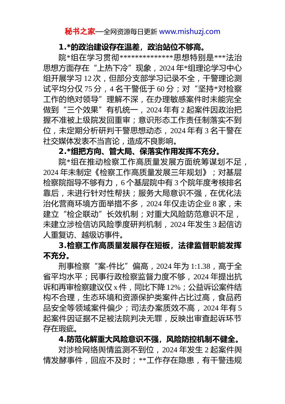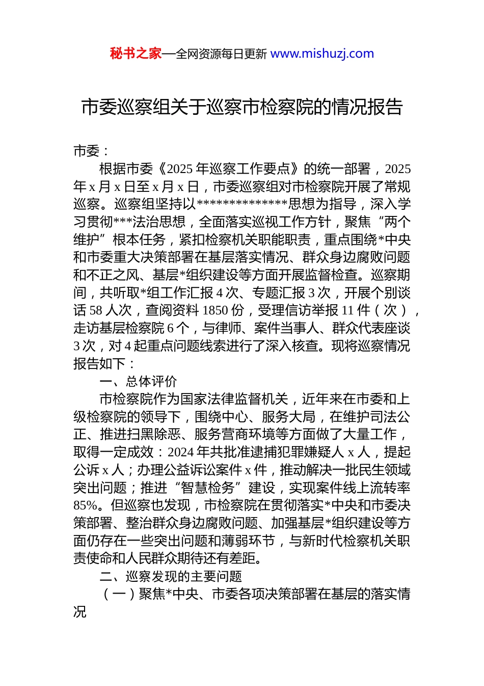 秘书之家—全网资源每日更新 www.mishuzj.com市委巡察组关于巡察市检察院的情况报告市委:根据市委《2025 年巡察工作要点》的统一部署,2025年 x 月 x 日至 x 月 x 日,市委巡察组对市检察院开展了常规巡察。巡察组坚持以**************思想为指导,深入学习贯彻***法治思想,全面落实巡视工作方针,聚焦“两个维护”根本任务,紧扣检察机关职能职责,重点围绕*中央和市委重大决策部署在基层落实情况、群众身边腐败问题和不正之风、基层*组织建设等方面开展监督检查。巡察期间,共听取*组工作汇报 4 次、专题汇报 3 次,开展个别谈话 58 人次,查阅资料 1850 份,受理信访举报 11 件(次),走访基层检察院 6 个,与律师、案件当事人、群众代表座谈3 次,对 4 起重点问题线索进行了深入核查。现将巡察情况报告如下:一、总体评价市检察院作为国家法律监督机关,近年来在市委和上级检察院的领导下,围绕中心、服务大局,在维护司法公正、推进扫黑除恶、服务营商环境等方面做了大量工作,取得一定成效:2024 年共批准逮捕犯罪嫌疑人 x 人,提起公诉 x 人;办理公益诉讼案件 x 件,推动解决一批民生领域突出问题;推进“智慧检务”建设,实现案件线上流转率85%。但巡察也发现,市检察院在贯彻落实*中央和市委决策部署、整治群众身边腐败问题、加强基层*组织建设等方面仍存在一些突出问题和薄弱环节,与新时代检察机关职责使命和人民群众期待还有差距。二、巡察发现的主要问题(一)聚焦*中央、市委各项决策部署在基层的落实情况秘书之家—全网资源每日更新 www.mishuzj.com1.*的政治建设存在温差,政治站位不够高。院*组在学习贯彻**************思想特别是***法治思想方面存在“上热下冷”现象,2024 年*组理论学习中心组开展学习 12 次,但部分支部学习记录不全,干警理论测试平均分仅 75 分,4 名干警低于 60 分;对“坚持*对检察工作的绝对领导”理解不深,在办理敏感案件时未能完全做到“三个效果”有机统一,2024 年有 2 起案件因政治把握不准被上级院发回重审;意识形态工作责任制落实不到位,未定期分析研判干警思想动态,2024 年有 3 名干警在社交媒体发表不当言论,造成不良影响。2.*组把方向、管大局、保落实作用发挥不充分。院*组在推动检察工作高质量发展方面统筹谋划不足,2024 年未制定《检察工作高质量发展三年规划》;对基层检察院指导不够有力,6 个基层院中有 3 个院年度考核排名靠后,未进行针对性帮扶;服务大局意识不强,在优化法治化营商环境方面举措不多,2024 年仅走访企业 8 家,未建立“检企联动”长效机制;对重大风险防范意识不足,未建立涉检信访风险季度研判机制,2024 年发生 3 起信访人重复访、越级访事件。3.检察工作高质量发展存在短板,法律监督职能发挥不充分。刑事检察“案-件比”偏高,2024 年为 1:1.38,高于全省平均水平;民事行政检察监督力度不够,2024 年提出抗诉和再审检察建议仅 x 件,同比下降 12%;公益诉讼案件结构不合理,生态环境和资源保护类案件占比过高,食品药品安全等领域案件偏少;司法办案质效不高,2024 年有 5起案件因证据不足被法院判决无罪,反映出审查起诉环节存在瑕疵。4.防范化解重大风险意识不强,风险防控机制不健全。对涉检网络舆情监测不到位,2024 年发生 2 起案件舆情发酵事件,回应不及时;**工作存在隐患,有干警违规秘书之家—全网资源每日更新 www.mishuzj.com将案件材料存入个人网盘,导致信息泄露风险;应急处置能力不足,2024 年某庭审现场发生当事人突发疾病事件,因预案不完善导致处置迟缓。(二)聚焦群众身边腐败问题和不正之风以及群众反映强烈的问题1.*组履行主体责任不到位,压力传导层层递减。院*组未制定年度《全面从严治*主体责任清单》,2024 年仅召开 2 次专题会议研究*风廉政建设工作;班子成员“一岗双责”落实不力,对分管领域干警廉洁从检情况了解不深,2024 年有 2 名干警因违纪被查处,所在分管领导未作检讨;廉政谈话流于形式,*组书记与班子成员、中层干部谈话内容雷同,未体现个性化监督。2.纪检...