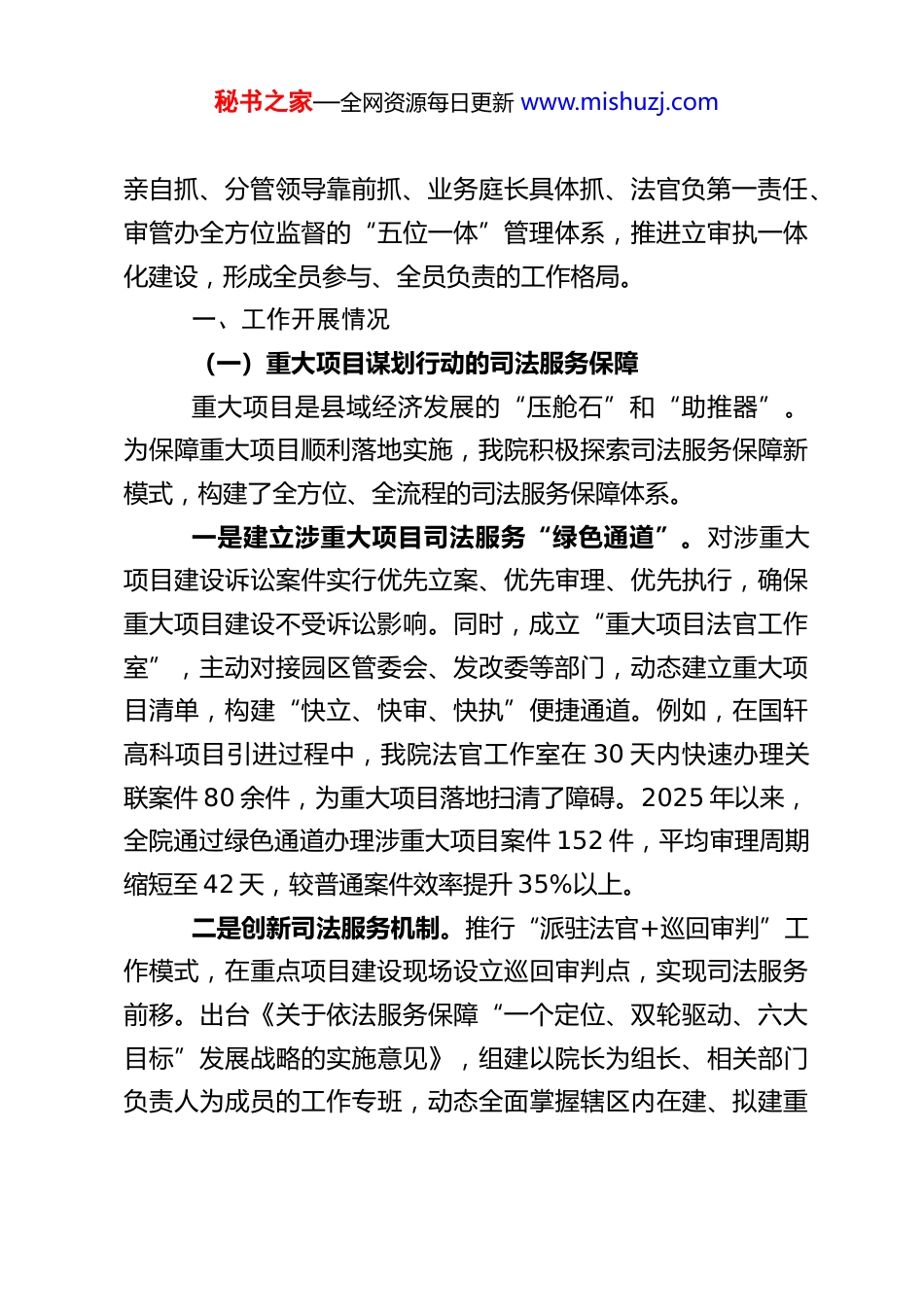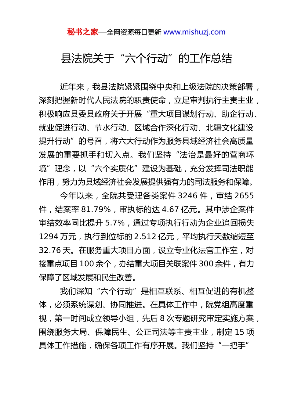 秘书之家—全网资源每日更新 www.mishuzj.com县法院关于“六个行动”的工作总结近年来,我县法院紧紧围绕中央和上级法院的决策部署,深刻把握新时代人民法院的职责使命,立足审判执行主责主业,积极响应县委县政府关于开展“重大项目谋划行动、助企行动、就业促进行动、节水行动、区域合作深化行动、北疆文化建设提升行动”的号召,将六大行动作为服务县域经济社会高质量发展的重要抓手和切入点。我们坚持“法治是最好的营商环境”理念,以“六个实质化”建设为基础,充分发挥司法职能作用,努力为县域经济社会发展提供强有力的司法服务和保障。今年以来,全院共受理各类案件 3246 件,审结 2655件,结案率 81.79%,审执标的达 4.67 亿元。其中涉企案件审结效率同比提升 5.7%,通过专项执行行动为企业追回损失1294 万元,执行到位标的 2.512 亿元,平均执行天数缩短至32.76 天。在服务重大项目方面,设立专业化法官工作室,对接重点项目 100 余个,办结重大项目关联案件 300 余件,有力保障了区域发展和民生改善。我们深知“六个行动”是相互联系、相互促进的有机整体,必须系统谋划、协同推进。在具体工作中,院党组高度重视,第一时间成立领导小组,先后 8 次专题研究审定实施方案,围绕服务大局、保障民生、公正司法等主责主业,制定 15 项具体工作措施,确保各项工作有序开展。我们坚持“一把手”秘书之家—全网资源每日更新 www.mishuzj.com亲自抓、分管领导靠前抓、业务庭长具体抓、法官负第一责任、审管办全方位监督的“五位一体”管理体系,推进立审执一体化建设,形成全员参与、全员负责的工作格局。一、工作开展情况(一)重大项目谋划行动的司法服务保障重大项目是县域经济发展的“压舱石”和“助推器”。为保障重大项目顺利落地实施,我院积极探索司法服务保障新模式,构建了全方位、全流程的司法服务保障体系。一是建立涉重大项目司法服务“绿色通道”。对涉重大项目建设诉讼案件实行优先立案、优先审理、优先执行,确保重大项目建设不受诉讼影响。同时,成立“重大项目法官工作室”,主动对接园区管委会、发改委等部门,动态建立重大项目清单,构建“快立、快审、快执”便捷通道。例如,在国轩高科项目引进过程中,我院法官工作室在 30 天内快速办理关联案件 80 余件,为重大项目落地扫清了障碍。2025 年以来,全院通过绿色通道办理涉重大项目案件 152 件,平均审理周期缩短至 42 天,较普通案件效率提升 35%以上。二是创新司法服务机制。推行“派驻法官+巡回审判”工作模式,在重点项目建设现场设立巡回审判点,实现司法服务前移。出台《关于依法服务保障“一个定位、双轮驱动、六大目标”发展战略的实施意见》,组建以院长为组长、相关部门负责人为成员的工作专班,动态全面掌握辖区内在建、拟建重秘书之家—全网资源每日更新 www.mishuzj.com大项目情况,及时发放联络卡、配备联络员,落实司法咨询和诉讼服务系列措施。建立与辖区重大项目建设单位对接联络机制,定期了解项目建设司法需求,对于涉重大项目建设纠纷,明确由院领导领办。三是保障重大项目建设顺利实施。我院在涉及高速公路扩建、民生工程等重大项目的案件审理和执行中,始终坚持以保障项目顺利实施为导向,灵活采取先予执行、活封活扣等执行措施,既保护了各方当事人合法权益,又不影响项目正常施工。例如,在京沪高速公路淮安至江都段扩建工程中,法院党组成员、副院长直接承办相关案件,并制定了“督促履行+强制清场”两套执行方案,仅用时十天,便将 40 余亩土地全部清空,为京沪高速改扩建工程抢得了先机,有力保障了这一国家重点民生工程的顺利开工。四是推进专业化法庭建设。针对我县特色产业和重大项目集聚特点,积极筹建专业化法庭。如在 XX 镇新建彭场人民法庭,打造专业化的非织造布产业法庭,为中国非织造布产业园提供贴身司法服务。通过定期组织巡回审判进园区、提供专项法治咨询、常态开展诉前调解等方式,助力企业规范治理,帮助企业经受住市场的“风吹雨打”。截至目前,该巡回法庭已成功调解涉企纠纷 105 件,为园区企业避免经济损失 3200...