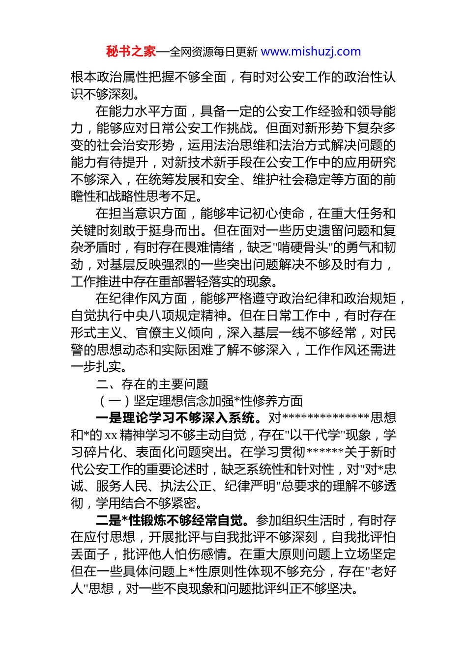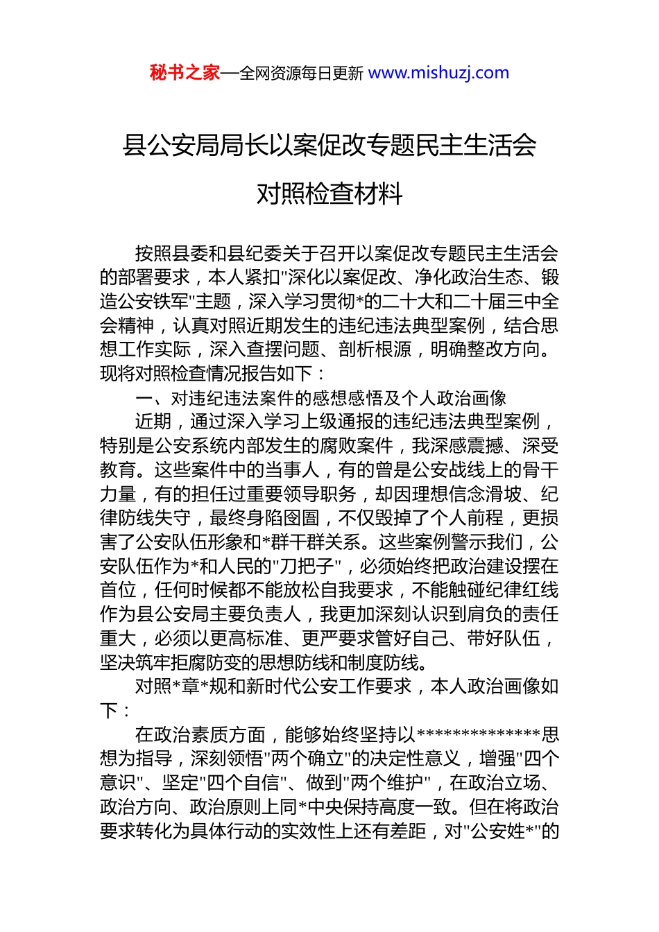 秘书之家—全网资源每日更新 www.mishuzj.com县公安局局长以案促改专题民主生活会对照检查材料按照县委和县纪委关于召开以案促改专题民主生活会的部署要求,本人紧扣"深化以案促改、净化政治生态、锻造公安铁军"主题,深入学习贯彻*的二十大和二十届三中全会精神,认真对照近期发生的违纪违法典型案例,结合思想工作实际,深入查摆问题、剖析根源,明确整改方向。现将对照检查情况报告如下:一、对违纪违法案件的感想感悟及个人政治画像近期,通过深入学习上级通报的违纪违法典型案例,特别是公安系统内部发生的腐败案件,我深感震撼、深受教育。这些案件中的当事人,有的曾是公安战线上的骨干力量,有的担任过重要领导职务,却因理想信念滑坡、纪律防线失守,最终身陷囹圄,不仅毁掉了个人前程,更损害了公安队伍形象和*群干群关系。这些案例警示我们,公安队伍作为*和人民的"刀把子",必须始终把政治建设摆在首位,任何时候都不能放松自我要求,不能触碰纪律红线作为县公安局主要负责人,我更加深刻认识到肩负的责任重大,必须以更高标准、更严要求管好自己、带好队伍,坚决筑牢拒腐防变的思想防线和制度防线。对照*章*规和新时代公安工作要求,本人政治画像如下:在政治素质方面,能够始终坚持以**************思想为指导,深刻领悟"两个确立"的决定性意义,增强"四个意识"、坚定"四个自信"、做到"两个维护",在政治立场、政治方向、政治原则上同*中央保持高度一致。但在将政治要求转化为具体行动的实效性上还有差距,对"公安姓*"的秘书之家—全网资源每日更新 www.mishuzj.com根本政治属性把握不够全面,有时对公安工作的政治性认识不够深刻。在能力水平方面,具备一定的公安工作经验和领导能力,能够应对日常公安工作挑战。但面对新形势下复杂多变的社会治安形势,运用法治思维和法治方式解决问题的能力有待提升,对新技术新手段在公安工作中的应用研究不够深入,在统筹发展和安全、维护社会稳定等方面的前瞻性和战略性思考不足。在担当意识方面,能够牢记初心使命,在重大任务和关键时刻敢于挺身而出。但在面对一些历史遗留问题和复杂矛盾时,有时存在畏难情绪,缺乏"啃硬骨头"的勇气和韧劲,对基层反映强烈的一些突出问题解决不够及时有力,工作推进中存在重部署轻落实的现象。在纪律作风方面,能够严格遵守政治纪律和政治规矩,自觉执行中央八项规定精神。但在日常工作中,有时存在形式主义、官僚主义倾向,深入基层一线不够经常,对民警的思想动态和实际困难了解不够深入,工作作风还需进一步扎实。二、存在的主要问题(一)坚定理想信念加强*性修养方面一是理论学习不够深入系统。对**************思想和*的 xx 精神学习不够主动自觉,存在"以干代学"现象,学习碎片化、表面化问题突出。在学习贯彻******关于新时代公安工作的重要论述时,缺乏系统性和针对性,对"对*忠诚、服务人民、执法公正、纪律严明"总要求的理解不够透彻,学用结合不够紧密。二是*性锻炼不够经常自觉。参加组织生活时,有时存在应付思想,开展批评与自我批评不够深刻,自我批评怕丢面子,批评他人怕伤感情。在重大原则问题上立场坚定但在一些具体问题上*性原则性体现不够充分,存在"老好人"思想,对一些不良现象和问题批评纠正不够坚决。秘书之家—全网资源每日更新 www.mishuzj.com三是政治敏锐性有待提升。对意识形态领域的复杂形势认识不够清醒,对社会上一些错误言论和不良风气的警惕性不足,缺乏主动抵制和斗争的意识。在处理一些敏感问题时,政治判断力、政治领悟力不够强,没有充分认识到公安工作的政治属性和敏感特性。(二)严格遵纪守法加强纪法意识方面一是纪律规矩执行不够严格。对公安队伍纪律作风建设的重要性认识不够深刻,有时存在"抓大放小"思想,对一些"小节"问题重视不够。在执行各项纪律规定时,标准不高、要求不严,对个别民警的违纪行为处理不够及时坚决,存在失之于宽、失之于软的情况。二是法治思维和法治方式运用不够到位。在推进执法规范化建设上力度不够大,对一些执法不规范问题整治不够彻底。有时在处理复杂案件时,存在重结果轻程序的倾向,对执法全过程记录制...