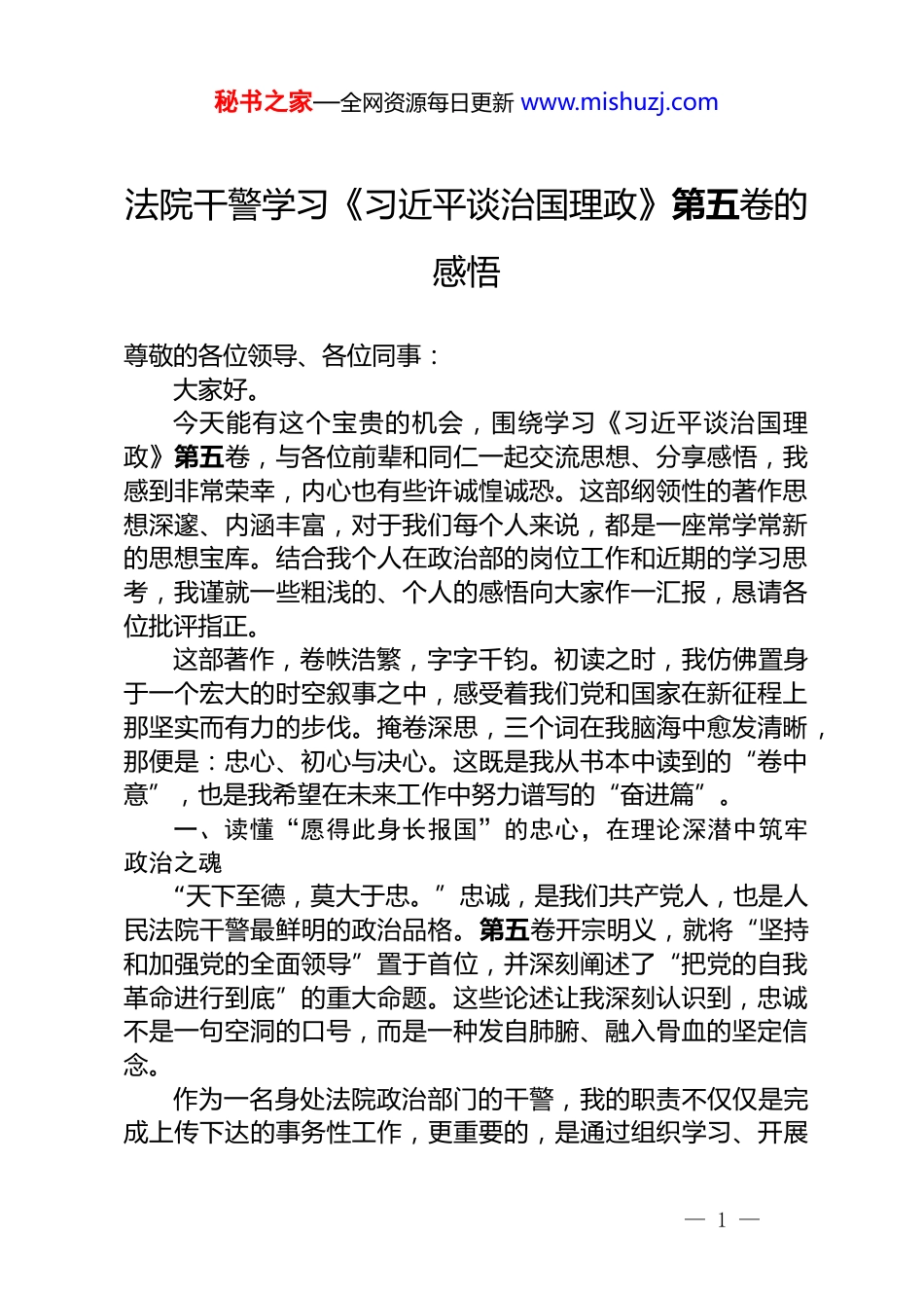 秘书之家—全网资源每日更新 www.mishuzj.com法院干警学习《习近平谈治国理政》第五卷的感悟尊敬的各位领导、各位同事:大家好。今天能有这个宝贵的机会,围绕学习《习近平谈治国理政》第五卷,与各位前辈和同仁一起交流思想、分享感悟,我感到非常荣幸,内心也有些许诚惶诚恐。这部纲领性的著作思想深邃、内涵丰富,对于我们每个人来说,都是一座常学常新的思想宝库。结合我个人在政治部的岗位工作和近期的学习思考,我谨就一些粗浅的、个人的感悟向大家作一汇报,恳请各位批评指正。这部著作,卷帙浩繁,字字千钧。初读之时,我仿佛置身于一个宏大的时空叙事之中,感受着我们党和国家在新征程上那坚实而有力的步伐。掩卷深思,三个词在我脑海中愈发清晰,那便是:忠心、初心与决心。这既是我从书本中读到的“卷中意”,也是我希望在未来工作中努力谱写的“奋进篇”。一、读懂“愿得此身长报国”的忠心,在理论深潜中筑牢政治之魂“天下至德,莫大于忠。”忠诚,是我们共产党人,也是人民法院干警最鲜明的政治品格。第五卷开宗明义,就将“坚持和加强党的全面领导”置于首位,并深刻阐述了“把党的自我革命进行到底”的重大命题。这些论述让我深刻认识到,忠诚不是一句空洞的口号,而是一种发自肺腑、融入骨血的坚定信念。作为一名身处法院政治部门的干警,我的职责不仅仅是完成上传下达的事务性工作,更重要的,是通过组织学习、开展— 1 —秘书之家—全网资源每日更新 www.mishuzj.com教育,和同志们一道,共同铸就法院队伍的政治忠诚。这就要求我自己必须先学一步、学深一层。我坚持将第五卷与前四卷贯通起来学,反复研读其中关于党的领导、法治建设、意识形态等关键篇章。每多读一遍,我对“两个确立”决定性意义的领悟就更深一层。我认识到,我们所强调的政治判断力、政治领悟力、政治执行力,绝非抽象的概念。它体现在我们能否在纷繁复杂的社会现象中,始终保持清醒的政治头脑;体现在我们能否准确领会中央精神,并将其不折不扣地融入司法工作的每一个环节;更体现在我们面对各种错误思潮和干扰诱惑时,能否站稳脚跟、明辨是非。这种忠诚,最终要落脚于审判执行的主责主业。我们要做的,就是确保党的路线方针政策,如同血液一般,流淌在司法工作的全身脉络之中,真正做到“从政治上看、从法治上办”。作为政治部的干警,我深感责任重大。我们的工作,就是要服务和保障全院干警能够心无旁骛地坚守这份忠诚,让人民法院这把“护民之剑、惩恶之刃”,永远掌握在党和人民手中。二、读懂“但愿苍生俱饱暖”的初心,在司法实践中传递民生温度“治国有常,利民为本。”第五卷中,“人民”二字贯穿始终,其分量重逾千钧。书中深刻指出,“为民造福是立党为公、执政为民的本质要求”,并围绕完善分配制度、实施就业优先战略、健全社会保障体系等作出了一系列重要部署。这些温暖人心的话语和扎实有力的举措,让我时常反思:作为一名法院干警,我能为人民群众的“保暖”做些什么?我常常在诉讼服务中心看到那些步履蹒跚、眼神里写满焦虑的老人,也常常在调解室里听到那些因家庭琐事而激烈争吵、濒临破碎的夫妻。对于我们而言,这或许只是卷宗里一个冰冷的案号,但对于当事人来说,这却是关乎他们一生幸福的天大的事。那一刻,法律条文似乎变得遥远,而人间的悲欢离合却— 2 —秘书之家—全网资源每日更新 www.mishuzj.com如此真切。这让我深刻体会到,司法工作不仅要有力度,更要有温度。第五卷中关于“实现好、维护好、发展好最广大人民根本利益”的论述,为我们的工作指明了方向。它要求我们不能就案办案、机械司法。在处理涉及劳动就业、教育医疗、婚姻家庭等民生领域的案件时,我们需要多一分耐心、多一份同理心,努力去探寻案件背后的深层原因,力求实现法理情的有机统一,达到案结事了人和的境界。书中提到的“要俯下身来深入调研”,对我触动很大。作为政治部的干警,虽然不直接审理案件,但我们更应该走出办公室,深入基层法庭,深入田间地头,去倾听群众最真实的声音,了解他们最迫切的司法需求。只有这样,我们制定的队伍建设方案、推出的便民利民举措,才能真正贴近...