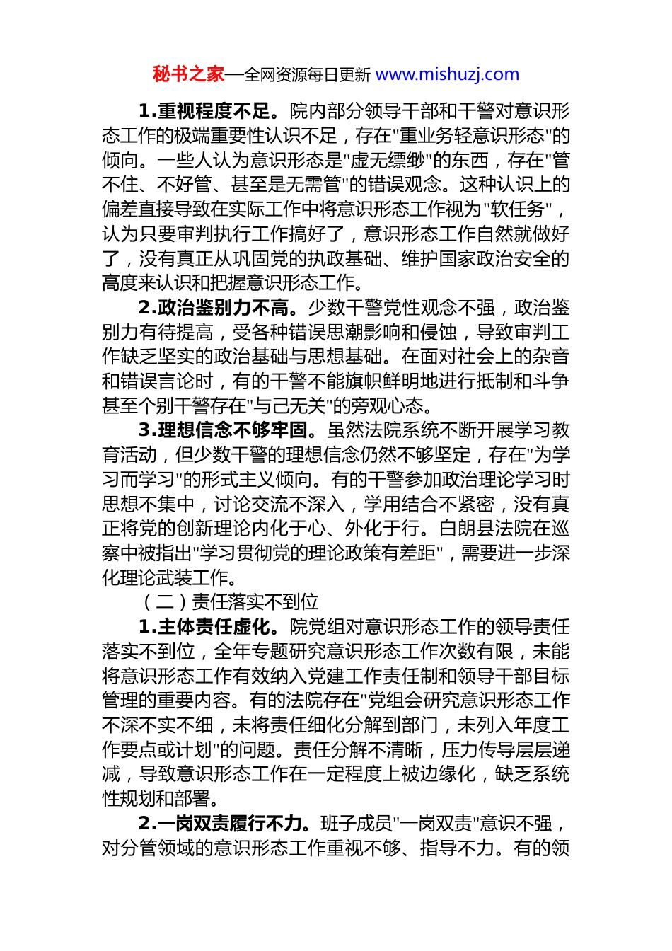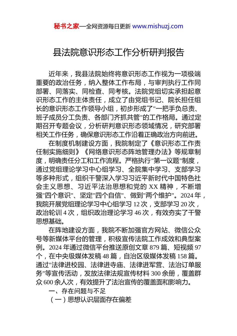 秘书之家—全网资源每日更新 www.mishuzj.com县法院意识形态工作分析研判报告近年来,我县法院始终将意识形态工作视为一项极端重要的政治任务,纳入整体工作布局,与审判执行工作同部署、同落实、同检查、同考核。法院党组切实承担起意识形态工作的主体责任,成立了由党组书记、院长担任组长的意识形态工作领导小组,初步形成了"一把手负总责、班子成员分工负责、各部门齐抓共管"的工作格局。通过定期召开专题会议,分析研判意识形态领域情况,研究部署相关工作任务,确保意识形态工作沿着正确政治方向前进。在制度机制建设方面,我院制定了《意识形态工作责任制实施细则》《网络意识形态阵地管理办法》等规章制度,明确责任分工和工作流程。严格执行"第一议题"制度,通过党组理论学习中心组学习、全院集中学习、支部学习等多种形式,组织干警深入学习习近平新时代中国特色社会主义思想、习近平法治思想和党的 XX 精神,不断增强"四个意识"、坚定"四个自信"、做到"两个维护"。2024 年,我院开展党组理论学习中心组学习 12 次,支部学习 20 次,政治轮训 4 次,组织政治理论学习 46 次,有效夯实了干警思想基础。在阵地建设方面,我院不断加强官方网站、微信公众号等新媒体平台的管理,积极宣传法院工作成效和典型案例。2024 年通过微信平台推送原创文章 879 篇、短视频 97个,在中央级媒体发稿 48 篇,自治区级媒体发稿 158 篇。通过"法律进校园、法律进寺庙、法律进军营、法治订单服务"等宣传活动,发放法律法规宣传材料 300 余册,覆盖群众 600 余人次,有效提升了法治宣传的覆盖面和影响力。一、存在问题与不足(一)思想认识层面存在偏差秘书之家—全网资源每日更新 www.mishuzj.com1.重视程度不足。院内部分领导干部和干警对意识形态工作的极端重要性认识不足,存在"重业务轻意识形态"的倾向。一些人认为意识形态是"虚无缥缈"的东西,存在"管不住、不好管、甚至是无需管"的错误观念。这种认识上的偏差直接导致在实际工作中将意识形态工作视为"软任务",认为只要审判执行工作搞好了,意识形态工作自然就做好了,没有真正从巩固党的执政基础、维护国家政治安全的高度来认识和把握意识形态工作。2.政治鉴别力不高。少数干警党性观念不强,政治鉴别力有待提高,受各种错误思潮影响和侵蚀,导致审判工作缺乏坚实的政治基础与思想基础。在面对社会上的杂音和错误言论时,有的干警不能旗帜鲜明地进行抵制和斗争甚至个别干警存在"与己无关"的旁观心态。3.理想信念不够牢固。虽然法院系统不断开展学习教育活动,但少数干警的理想信念仍然不够坚定,存在"为学习而学习"的形式主义倾向。有的干警参加政治理论学习时思想不集中,讨论交流不深入,学用结合不紧密,没有真正将党的创新理论内化于心、外化于行。白朗县法院在巡察中被指出"学习贯彻党的理论政策有差距",需要进一步深化理论武装工作。(二)责任落实不到位1.主体责任虚化。院党组对意识形态工作的领导责任落实不到位,全年专题研究意识形态工作次数有限,未能将意识形态工作有效纳入党建工作责任制和领导干部目标管理的重要内容。有的法院存在"党组会研究意识形态工作不深不实不细,未将责任细化分解到部门,未列入年度工作要点或计划"的问题。责任分解不清晰,压力传导层层递减,导致意识形态工作在一定程度上被边缘化,缺乏系统性规划和部署。2.一岗双责履行不力。班子成员"一岗双责"意识不强,对分管领域的意识形态工作重视不够、指导不力。有的领秘书之家—全网资源每日更新 www.mishuzj.com导干部认为意识形态工作是党组书记和政治部门的事,与自己分管业务工作关系不大,没有真正将意识形态工作融入分管业务工作之中。隰县法院指出存在的"岗位职责风险"中包括"一岗双责不履行或履行不到位",导致监管不力和应对不妥。3.考核机制不健全。意识形态工作考核评价机制不完善,缺乏科学的评价指标和有效的激励约束机制。目前对意识形态工作的考核多侧重于形式和过程,如学习次数、活动数量等,而对实际效果的评估缺乏科学指标。这种考核导向导致一些部门满足于"走过场",追求形式上的完成,而忽视实...