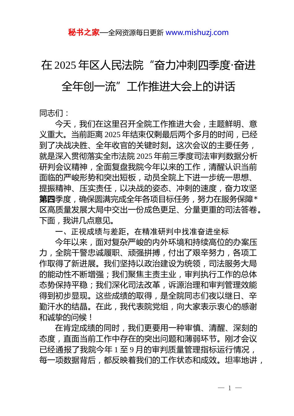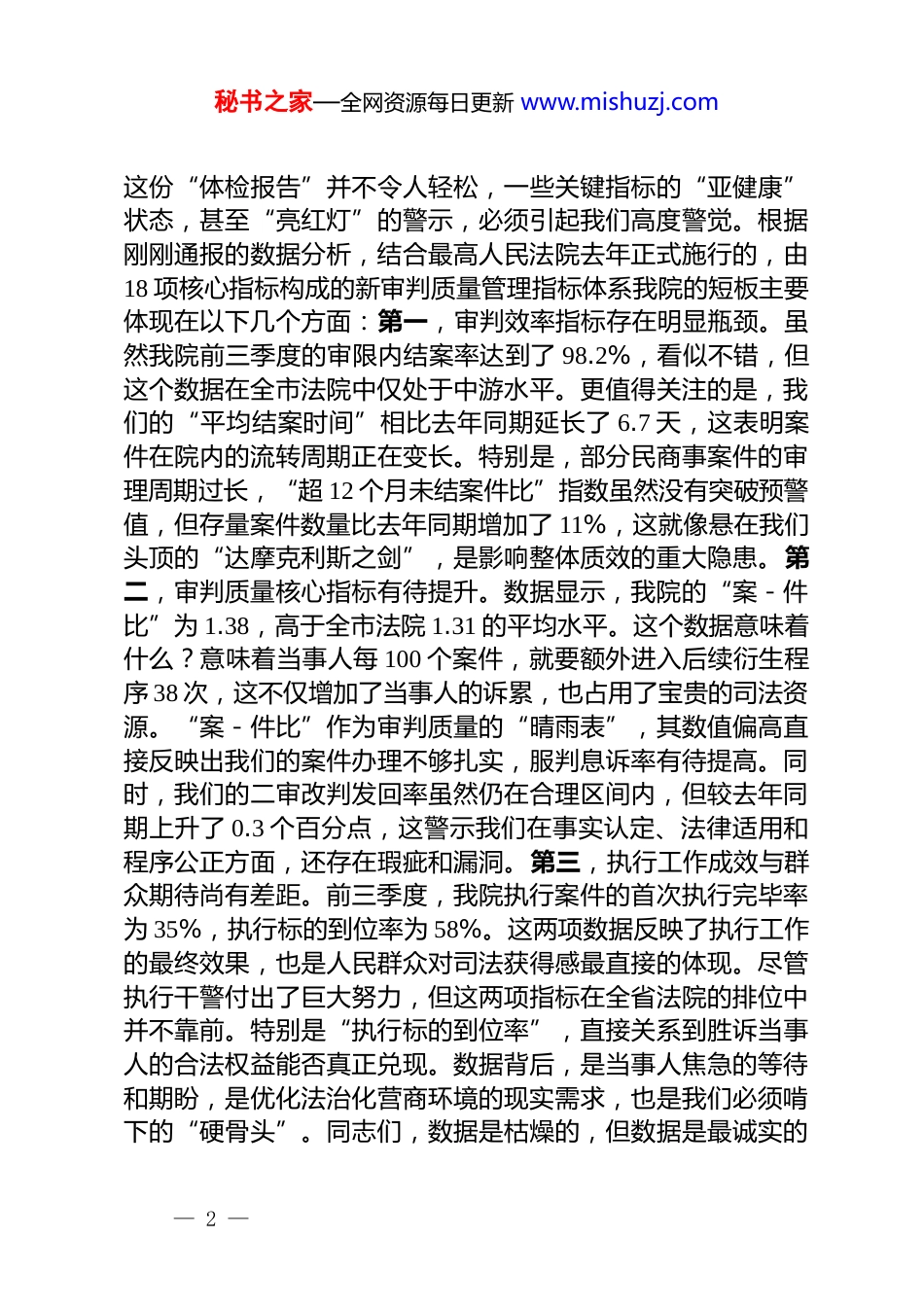 秘书之家—全网资源每日更新 www.mishuzj.com在 2025 年区人民法院“奋力冲刺四季度·奋进全年创一流”工作推进大会上的讲话同志们:今天,我们在这里召开全院工作推进大会,主题鲜明、意义重大。当前距离 2025 年结束仅剩最后两个多月的时间,已经到了决战决胜、全年收官的关键时刻。这次会议的主要任务,就是深入贯彻落实全市法院 2025 年前三季度司法审判数据分析研判会议精神,全面复盘我院今年以来的工作,清醒认识当前面临的严峻形势和突出短板,动员全院上下进一步统一思想、提振精神、压实责任,以决战的姿态、冲刺的速度,奋力攻坚第四季度,确保圆满完成全年各项目标任务,努力在服务保障*区高质量发展大局中交出一份成色更足、分量更重的司法答卷。下面,我讲几点意见。一、正视成绩与差距,在精准研判中找准奋进坐标今年以来,面对复杂严峻的内外环境和持续高位的办案压力,全院干警忠诚履职、顽强拼搏,付出了艰辛努力,各项工作取得了新进展。我们坚持以政治建设为统领,司法服务大局的能动性不断增强;我们聚焦主责主业,审判执行工作的总体态势保持平稳;我们深化司法改革,诉源治理和审判管理效能得到初步显现。这些成绩的取得,是全院同志们夜以继日、辛勤汗水的结晶。在此,我代表院党组,向大家表示衷心的感谢和诚挚的问候!在肯定成绩的同时,我们更要用一种审慎、清醒、深刻的态度,直面当前工作中存在的突出问题和薄弱环节。刚才会议已经通报了我院今年 1 至 9 月的审判质量管理指标运行情况,每一项数据背后,都反映着我们的工作状态和成效。坦率地讲,— 1 —秘书之家—全网资源每日更新 www.mishuzj.com这份“体检报告”并不令人轻松,一些关键指标的“亚健康”状态,甚至“亮红灯”的警示,必须引起我们高度警觉。根据刚刚通报的数据分析,结合最高人民法院去年正式施行的,由18 项核心指标构成的新审判质量管理指标体系我院的短板主要体现在以下几个方面:第一,审判效率指标存在明显瓶颈。虽然我院前三季度的审限内结案率达到了 98.2%,看似不错,但这个数据在全市法院中仅处于中游水平。更值得关注的是,我们的“平均结案时间”相比去年同期延长了 6.7 天,这表明案件在院内的流转周期正在变长。特别是,部分民商事案件的审理周期过长,“超 12 个月未结案件比”指数虽然没有突破预警值,但存量案件数量比去年同期增加了 11%,这就像悬在我们头顶的“达摩克利斯之剑”,是影响整体质效的重大隐患。第二,审判质量核心指标有待提升。数据显示,我院的“案-件比”为 1.38,高于全市法院 1.31 的平均水平。这个数据意味着什么?意味着当事人每 100 个案件,就要额外进入后续衍生程序 38 次,这不仅增加了当事人的诉累,也占用了宝贵的司法资源。“案-件比”作为审判质量的“晴雨表”,其数值偏高直接反映出我们的案件办理不够扎实,服判息诉率有待提高。同时,我们的二审改判发回率虽然仍在合理区间内,但较去年同期上升了 0.3 个百分点,这警示我们在事实认定、法律适用和程序公正方面,还存在瑕疵和漏洞。第三,执行工作成效与群众期待尚有差距。前三季度,我院执行案件的首次执行完毕率为 35%,执行标的到位率为 58%。这两项数据反映了执行工作的最终效果,也是人民群众对司法获得感最直接的体现。尽管执行干警付出了巨大努力,但这两项指标在全省法院的排位中并不靠前。特别是“执行标的到位率”,直接关系到胜诉当事人的合法权益能否真正兑现。数据背后,是当事人焦急的等待和期盼,是优化法治化营商环境的现实需求,也是我们必须啃下的“硬骨头”。同志们,数据是枯燥的,但数据是最诚实的— 2 —秘书之家—全网资源每日更新 www.mishuzj.com镜子。它照见了我们的不足,也指明了我们努力的方向。这些短板和弱项,既有宏观经济形势变化带来的客观影响,但更多的是我们自身工作中的主观原因。比如,一些同志的“精品意识”不强,满足于“办结”而非“办好”;部分庭室之间协作不畅,存在“重审判、轻执行”“重立案、轻调解”的现象;院庭长的监督管理职能发挥还不够充分、不够精准,对案件质效的动态监管和...