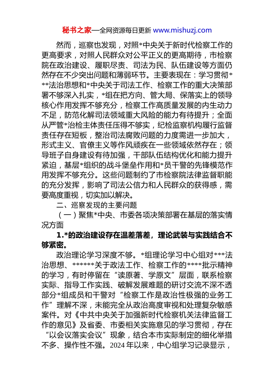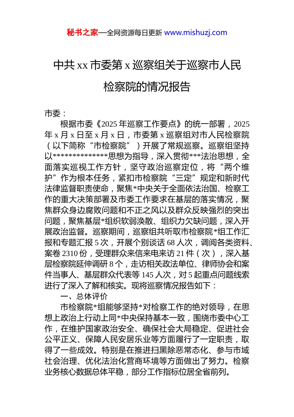 秘书之家—全网资源每日更新 www.mishuzj.com中共 xx 市委第 x 巡察组关于巡察市人民检察院的情况报告市委:根据市委《2025 年巡察工作要点》的统一部署,2025年 x 月 x 日至 x 月 x 日,市委第 x 巡察组对市人民检察院(以下简称“市检察院”)开展了常规巡察。巡察组坚持以**************思想为指导,深入贯彻***法治思想,全面落实巡视工作方针,坚守政治巡察定位,将“两个维护”作为根本任务,紧扣市检察院“三定”规定和新时代法律监督职责使命,聚焦*中央关于全面依法治国、检察工作的重大决策部署及市委工作要求在基层的落实情况,聚焦群众身边腐败问题和不正之风以及群众反映强烈的突出问题,聚焦基层*组织软弱涣散、组织力欠缺问题,深入开展政治监督。巡察期间,巡察组共听取市检察院*组工作汇报和专题汇报 5 次,开展个别谈话 68 人次,调阅各类资料、案卷 2310 份,受理群众来信来电来访 21 件(次),深入基层检察院延伸调研 8 个,走访相关政法单位、律师协会和案件当事人、基层群众代表等 145 人次,对 5 起重点问题线索进行了深入了解和核实。现将巡察情况报告如下:一、总体评价市检察院*组能够坚持*对检察工作的绝对领导,在思想上政治上行动上同*中央保持基本一致,围绕市委中心工作,在维护国家政治安全、确保社会大局稳定、促进社会公平正义、保障人民安居乐业等方面履行了一定职责,取得了一些成效。特别是在推进扫黑除恶常态化、参与市域社会治理、优化法治化营商环境等方面做出了努力。检察业务核心数据总体平稳,部分工作指标位居全省前列。秘书之家—全网资源每日更新 www.mishuzj.com然而,巡察也发现,对照*中央关于新时代检察工作的更高要求,对照人民群众对公平正义的更高期待,市检察院在政治建设、履职尽责、司法为民、队伍建设等方面仍然存在不少突出问题和薄弱环节。主要表现在:学习贯彻***法治思想和*中央关于司法工作、检察工作的重大决策部署不够深入扎实,*组在把方向、管大局、保落实上的领导核心作用发挥不够充分,检察工作高质量发展的内生动力不足,防范化解司法领域重大风险的能力有待提升;全面从严管*治检主体责任压得不够实,纪检监察机构履行监督责任存在短板,整治司法腐败问题的力度需进一步加大,形式主义、官僚主义等作风顽疾在一些领域依然存在;领导班子自身建设有待加强,干部队伍结构优化和能力提升紧迫,基层*组织的战斗堡垒作用和*员干警的先锋模范作用发挥不够充分。这些问题制约了市检察院法律监督职能的充分发挥,影响了司法公信力和人民群众的获得感,需要高度重视,切实加以解决。二、巡察发现的主要问题(一)聚焦*中央、市委各项决策部署在基层的落实情况方面1.*的政治建设存在温差落差,理论武装与实践结合不够紧密。政治理论学习深度不够。*组理论学习中心组对***法治思想、******关于政法工作、检察工作的****批示精神的学习,有时停留在“读原著、学原文”层面,联系检察实际、指导工作实践、破解发展难题的研讨交流不深不透部分*组成员和干警对“检察工作是政治性极强的业务工作”理解不深,未能完全从政治高度审视和处理复杂敏感案件。对《中共中央关于加强新时代检察机关法律监督工作的意见》及省委、市委相关实施意见的学习贯彻,存在“以会议落实会议”现象,结合本市实际制定的细化举措不多、操作性不强。2024 年以来,中心组学习记录显示,秘书之家—全网资源每日更新 www.mishuzj.com涉及法治思想专题研讨仅 3 次,且发言质量不高,缺乏针对性。政治判断力、领悟力、执行力有待提升。对一些重大敏感案件背后的政治风险、社会风险研判不足,有时就案办案,未能有效实现政治效果、社会效果、法律效果的有机统一。例如,在处理某涉众型经济犯罪案件时,对可能引发的群体性事件风险预估不足,应对预案不充分,导致工作被动。对上级检察机关和市委部署的重点工作任务,有时存在“等靠要”思想,主动谋划、创造性落实不够,部分工作推进缓慢,如“涉案企业合规改革”试点工作在本市推进力度不大,成效不明显。2.*组把方向、管大局、保落实的领导核心作用发挥不够充分...