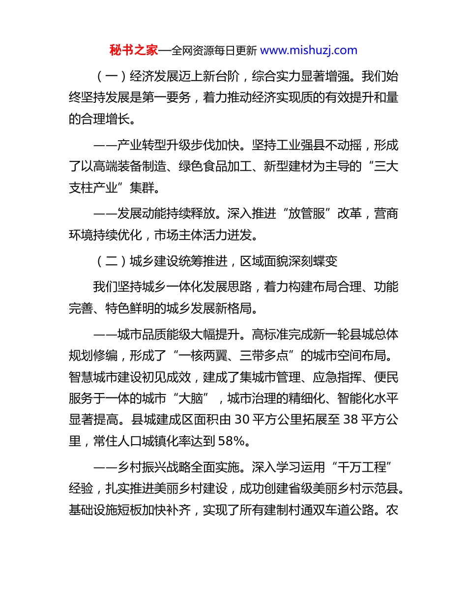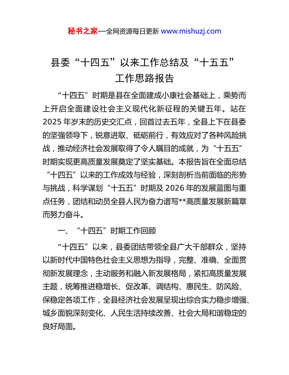 秘书之家—全网资源每日更新 www.mishuzj.com县委“十四五”以来工作总结及“十五五”工作思路报告“十四五”时期是县在全面建成小康社会基础上,乘势而上开启全面建设社会主义现代化新征程的关键五年。站在2025 年岁末的历史交汇点,回首过去五年,全县上下在县委的坚强领导下,锐意进取、砥砺前行,有效应对了各种风险挑战,推动经济社会发展取得了令人瞩目的成就,为“十五五”时期实现更高质量发展奠定了坚实基础。本报告旨在全面总结“十四五”以来的工作成效与经验,深刻剖析当前面临的形势与挑战,科学谋划“十五五”时期及 2026 年的发展蓝图与重点任务,团结和动员全县人民为奋力谱写**高质量发展新篇章而努力奋斗。一、“十四五”时期工作回顾“十四五”以来,县委团结带领全县广大干部群众,坚持以新时代中国特色社会主义思想为指导,完整、准确、全面贯彻新发展理念,主动服务和融入新发展格局,紧扣高质量发展主题,统筹推进稳增长、促改革、调结构、惠民生、防风险、保稳定各项工作,全县经济社会发展呈现出综合实力稳步增强、城乡面貌深刻变化、人民生活持续改善、社会大局和谐稳定的良好局面。秘书之家—全网资源每日更新 www.mishuzj.com(一)经济发展迈上新台阶,综合实力显著增强。我们始终坚持发展是第一要务,着力推动经济实现质的有效提升和量的合理增长。——产业转型升级步伐加快。坚持工业强县不动摇,形成了以高端装备制造、绿色食品加工、新型建材为主导的“三大支柱产业”集群。——发展动能持续释放。深入推进“放管服”改革,营商环境持续优化,市场主体活力迸发。(二)城乡建设统筹推进,区域面貌深刻蝶变我们坚持城乡一体化发展思路,着力构建布局合理、功能完善、特色鲜明的城乡发展新格局。——城市品质能级大幅提升。高标准完成新一轮县城总体规划修编,形成了“一核两翼、三带多点”的城市空间布局。智慧城市建设初见成效,建成了集城市管理、应急指挥、便民服务于一体的城市“大脑”,城市治理的精细化、智能化水平显著提高。县城建成区面积由 30 平方公里拓展至 38 平方公里,常住人口城镇化率达到 58%。——乡村振兴战略全面实施。深入学习运用“千万工程”经验,扎实推进美丽乡村建设,成功创建省级美丽乡村示范县。基础设施短板加快补齐,实现了所有建制村通双车道公路。农秘书之家—全网资源每日更新 www.mishuzj.com村饮水安全巩固提升工程全面完成。数字乡村建设加快推进,5G 网络和千兆光网实现乡镇以上区域全覆盖。(三)民生福祉持续改善,社会大局和谐稳定我们始终坚持以人民为中心的发展思想,用心用情用力解决群众急难愁盼问题。——社会事业全面进步。坚持教育优先发展。健康建设扎实推进,县人民医院成功创建为三级甲等综合医院,县域医共体建设走在全省前列,乡镇卫生院和村卫生室标准化建设实现全覆盖。公共文化服务体系日益完善,县级“两馆”达到国家一级馆标准,乡镇综合文化站实现全覆盖。——社会保障坚实有力。城乡居民基本养老保险、基本医疗保险参保率稳定在 98%以上。城乡低保、特困供养标准逐年提高,困难群众基本生活得到有效保障。——社会治理效能持续提升。平安、法治建设深入推进,常态化开展扫黑除恶斗争,严厉打击各类违法犯罪活动,群众安全感和满意度持续提升。坚持和发展新时代“枫桥经验”,健全矛盾纠纷多元化解机制。安全生产责任体系不断完善,扎实开展重点行业领域安全生产专项整治,未发生重特大安全生产事故,社会大局保持了长期和谐稳定。(四)存在的问题与挑战秘书之家—全网资源每日更新 www.mishuzj.com在总结成绩的同时,我们也必须清醒地认识到,对标高质量发展的要求和人民群众的新期待,我县发展仍面临不少困难和挑战:一是产业结构层次有待提升。传统产业占比依然偏高,战略性新兴产业规模不大,对经济增长的支撑作用尚未充分显现。部分优势产业仍处于价值链中低端,产品精深加工不足、品牌影响力不强、科技含量不高等问题较为突出。二是城乡区域发展不够均衡。县城首位度有待进一步提高对乡镇的辐射带动能力不足。农村地区基础设施和公共服务仍然存在短板,农业农村...