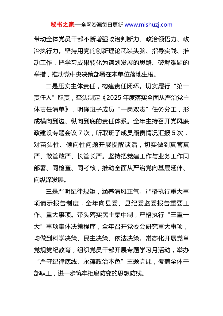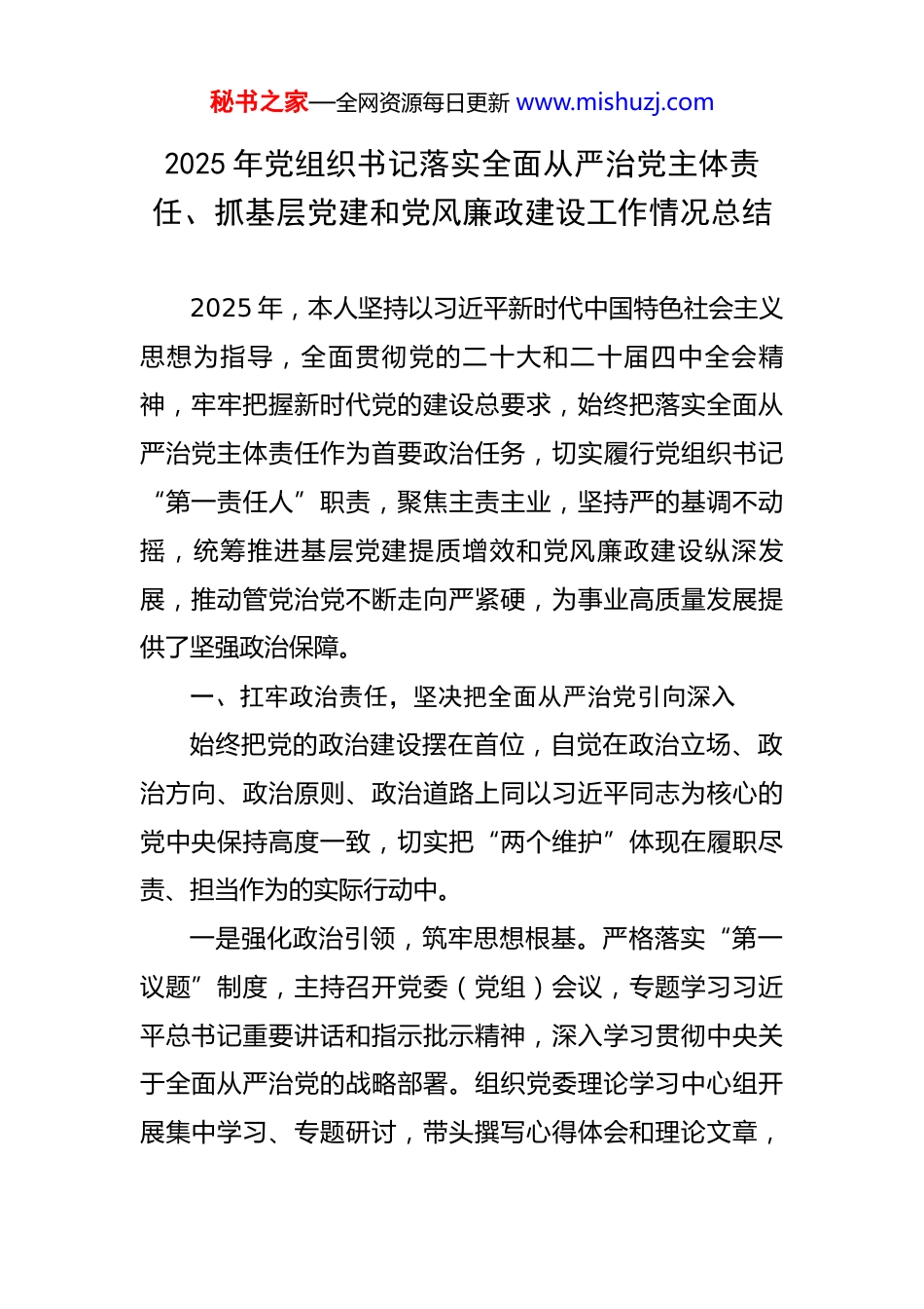 秘书之家—全网资源每日更新 www.mishuzj.com2025 年党组织书记落实全面从严治党主体责任、抓基层党建和党风廉政建设工作情况总结 2025 年,本人坚持以习近平新时代中国特色社会主义思想为指导,全面贯彻党的二十大和二十届四中全会精神,牢牢把握新时代党的建设总要求,始终把落实全面从严治党主体责任作为首要政治任务,切实履行党组织书记“第一责任人”职责,聚焦主责主业,坚持严的基调不动摇,统筹推进基层党建提质增效和党风廉政建设纵深发展,推动管党治党不断走向严紧硬,为事业高质量发展提供了坚强政治保障。一、扛牢政治责任,坚决把全面从严治党引向深入始终把党的政治建设摆在首位,自觉在政治立场、政治方向、政治原则、政治道路上同以习近平同志为核心的党中央保持高度一致,切实把“两个维护”体现在履职尽责、担当作为的实际行动中。一是强化政治引领,筑牢思想根基。严格落实“第一议题”制度,主持召开党委(党组)会议,专题学习习近平总书记重要讲话和指示批示精神,深入学习贯彻中央关于全面从严治党的战略部署。组织党委理论学习中心组开展集中学习、专题研讨,带头撰写心得体会和理论文章,秘书之家—全网资源每日更新 www.mishuzj.com带动全体党员干部不断增强政治判断力、政治领悟力、政治执行力。坚持用党的创新理论武装头脑、指导实践、推动工作,把学习成果转化为谋划发展的思路、破解难题的举措,推动党中央决策部署在本单位落地生根。二是压实主体责任,构建责任闭环。切实履行“第一责任人”职责,牵头制定《2025 年度落实全面从严治党主体责任清单》,明确班子成员“一岗双责”任务分工,形成横向到边、纵向到底的责任体系。全年主持召开党风廉政建设专题会议 7 次,听取班子成员履责情况汇报 5 次,对苗头性、倾向性问题开展提醒谈话,切实做到真管真严、敢管敢严、长管长严。坚持把党建工作与业务工作同部署、同检查、同考核,推动全面从严治党向基层延伸、向纵深发展。三是严明纪律规矩,涵养清风正气。严格执行重大事项请示报告制度,全年向县委、县纪委监委报告重要工作、重大事项。带头落实民主集中制,严格执行“三重一大”事项集体决策程序,全年召开党委会研究重大事项,均做到科学决策、民主决策、依法决策。常态化开展党章党规党纪教育,组织党员干部开展专题学习月活动,举办“严守纪律底线、永葆政治本色”主题党课,覆盖全体干部职工,进一步筑牢拒腐防变的思想防线。秘书之家—全网资源每日更新 www.mishuzj.com二、聚焦强基固本,全面提升基层党建工作质效牢固树立大抓基层的鲜明导向,持续推进党支部标准化规范化建设,不断增强党组织政治功能和组织功能,推动基层党组织全面进步、全面过硬。一是规范组织生活,夯实组织基础。严格执行“三会一课”、组织生活会、民主评议党员等制度,主持召开支部党员大会、支委会、党小组会,带头讲党课,班子成员到联系支部讲党课。高质量召开年度民主生活会和组织生活会,查摆问题,制定整改措施,均已整改落实到位。深入开展“党建+业务”融合行动,推动党建与中心工作同频共振、互促共进。二是建强战斗堡垒,激发干事活力。持续推进“五星支部”创建活动,所属党支部全部达到“四星”以上标准。在窗口单位、重点项目一线设立“党员先锋岗”,组建“党员突击队”“志愿服务队”等队伍,开展“我为群众办实事”实践活动,解决群众急难愁盼问题。注重在急难险重任务中锤炼党员队伍,在疫情防控、抗洪救灾等关键时刻,党员干部冲锋在前、担当奉献,充分彰显先锋模范作用。三是加强队伍建设,优化党员结构。发展预备党员,确定入党积极分子,注重从青年骨干、一线职工中培养发秘书之家—全网资源每日更新 www.mishuzj.com展对象。健全党员积分管理制度,将参与组织生活、服务群众、履职尽责等情况量化打分,作为评优评先重要依据。开展“亮身份、亮承诺、亮业绩”活动,组织党员公开承诺事项,接受群众监督。加强流动党员管理,建立定期联系机制,确保教育管理不断线、不缺位。三、深化正风肃纪,持续推进党风廉政建设走深走实始终坚持严的基调、严的措施、严的氛围,持之以恒正...