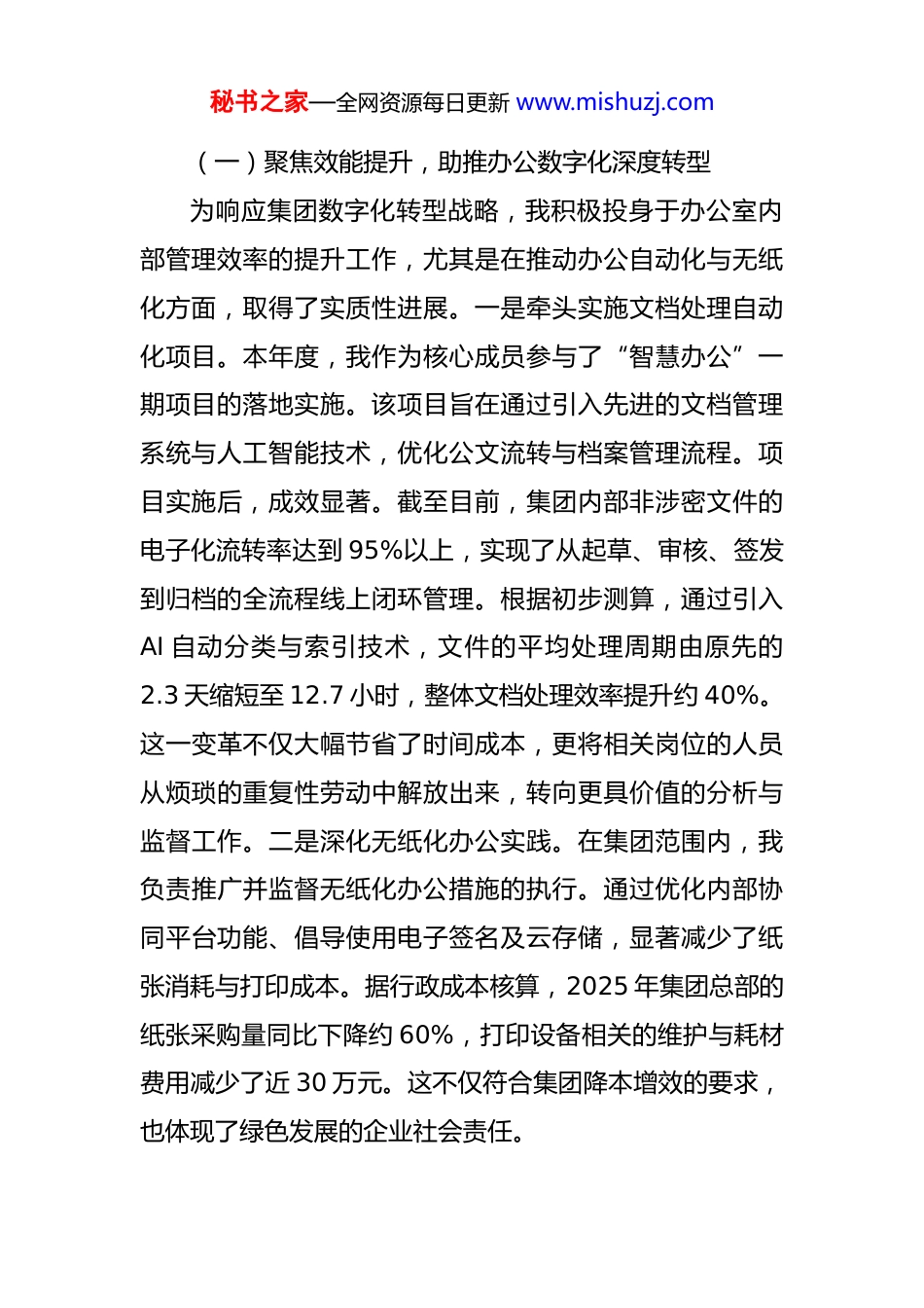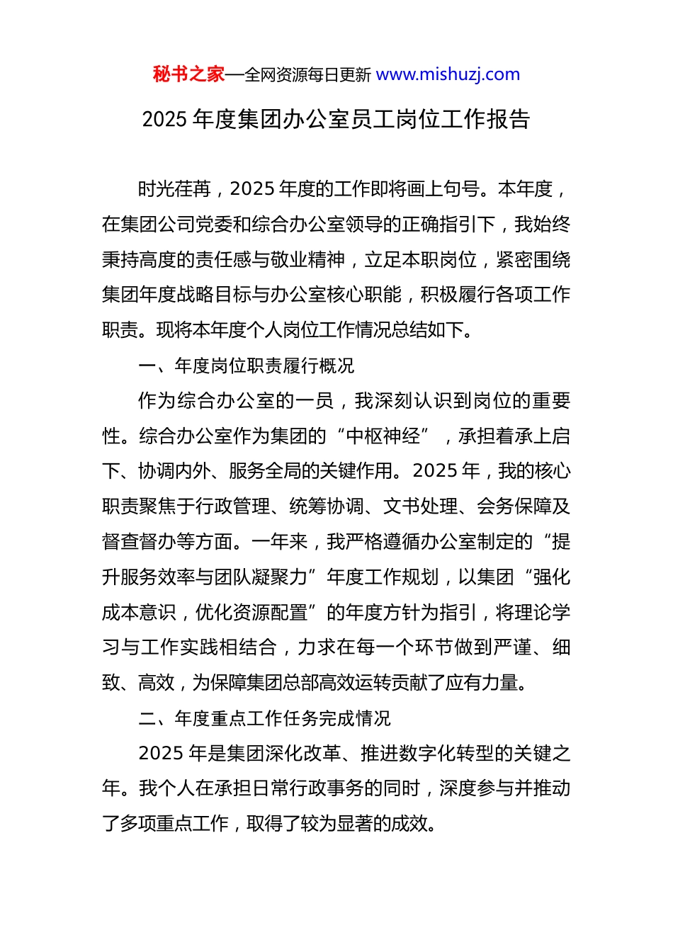 秘书之家—全网资源每日更新 www.mishuzj.com2025 年度集团办公室员工岗位工作报告 时光荏苒,2025 年度的工作即将画上句号。本年度,在集团公司党委和综合办公室领导的正确指引下,我始终秉持高度的责任感与敬业精神,立足本职岗位,紧密围绕集团年度战略目标与办公室核心职能,积极履行各项工作职责。现将本年度个人岗位工作情况总结如下。一、年度岗位职责履行概况作为综合办公室的一员,我深刻认识到岗位的重要性。综合办公室作为集团的“中枢神经”,承担着承上启下、协调内外、服务全局的关键作用。2025 年,我的核心职责聚焦于行政管理、统筹协调、文书处理、会务保障及督查督办等方面。一年来,我严格遵循办公室制定的“提升服务效率与团队凝聚力”年度工作规划,以集团“强化成本意识,优化资源配置”的年度方针为指引,将理论学习与工作实践相结合,力求在每一个环节做到严谨、细致、高效,为保障集团总部高效运转贡献了应有力量。二、年度重点工作任务完成情况2025 年是集团深化改革、推进数字化转型的关键之年。我个人在承担日常行政事务的同时,深度参与并推动了多项重点工作,取得了较为显著的成效。秘书之家—全网资源每日更新 www.mishuzj.com(一)聚焦效能提升,助推办公数字化深度转型为响应集团数字化转型战略,我积极投身于办公室内部管理效率的提升工作,尤其是在推动办公自动化与无纸化方面,取得了实质性进展。一是牵头实施文档处理自动化项目。本年度,我作为核心成员参与了“智慧办公”一期项目的落地实施。该项目旨在通过引入先进的文档管理系统与人工智能技术,优化公文流转与档案管理流程。项目实施后,成效显著。截至目前,集团内部非涉密文件的电子化流转率达到 95%以上,实现了从起草、审核、签发到归档的全流程线上闭环管理。根据初步测算,通过引入AI 自动分类与索引技术,文件的平均处理周期由原先的2.3 天缩短至 12.7 小时,整体文档处理效率提升约 40%。这一变革不仅大幅节省了时间成本,更将相关岗位的人员从烦琐的重复性劳动中解放出来,转向更具价值的分析与监督工作。二是深化无纸化办公实践。在集团范围内,我负责推广并监督无纸化办公措施的执行。通过优化内部协同平台功能、倡导使用电子签名及云存储,显著减少了纸张消耗与打印成本。据行政成本核算,2025 年集团总部的纸张采购量同比下降约 60%,打印设备相关的维护与耗材费用减少了近 30 万元。这不仅符合集团降本增效的要求,也体现了绿色发展的企业社会责任。秘书之家—全网资源每日更新 www.mishuzj.com(二)精准服务保障,确保集团中枢高效运转作为综合办公室的核心职能,提供精准、高效的服务保障是工作的重中之重。本年度,我在文书处理、会务组织、行政接待等方面,始终坚持最高标准。一是高效精准的文书流转与信息报送。2025 年,我累计经手处理各类收文、发文 3,200 余件,起草、核校集团各类报告、纪要、函件等综合性文稿超过 150 篇。在工作中,我严格执行公文处理规范,确保每一份文件的时效性、准确性与严肃性,全年未发生任何因个人疏忽导致的流转延误或信息错漏。同时,在信息报送方面,我密切关注行业动态与政策走向,全年编写《*信息参考》24 期,为集团领导决策提供了有价值的信息支撑。二是周密细致的会务组织与协调。会议是集团决策和部署工作的重要载体。本年度,我全程参与组织和协调了包括集团年度工作会议、季度经营分析会、战略研讨专题会、党委中心组学习会在内的各层级会议共计 48 场次。在会务工作中,我从会议方案的策划、材料的准备、场地的布置,到过程中的服务与记录,均力求做到万无一失。特别是在*项目启动会、与*战略合作伙伴高层峰会等几次重大会议中,通过建立标准化的会务工作流程,有效提升了会议质量。根据会后匿名满意度调查问卷统计,与会人员对会议组织的综合满意度评分平秘书之家—全网资源每日更新 www.mishuzj.com均达到 94.8%,有效保障了集团各项重大决策的顺利传达与落实。三是规范有序的行政接待与后勤支持。全年共计负责或参与了 65 次重要商务接待及上级单位视察调研活动。在接待工作中,我注...