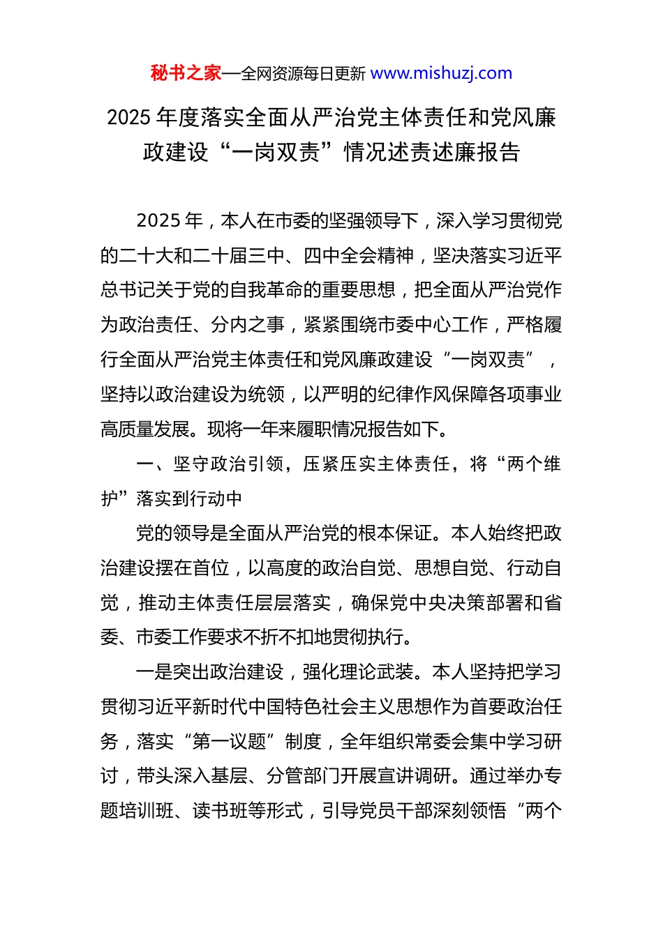 秘书之家—全网资源每日更新 www.mishuzj.com2025 年度落实全面从严治党主体责任和党风廉政建设“一岗双责”情况述责述廉报告 2025 年,本人在市委的坚强领导下,深入学习贯彻党的二十大和二十届三中、四中全会精神,坚决落实习近平总书记关于党的自我革命的重要思想,把全面从严治党作为政治责任、分内之事,紧紧围绕市委中心工作,严格履行全面从严治党主体责任和党风廉政建设“一岗双责”,坚持以政治建设为统领,以严明的纪律作风保障各项事业高质量发展。现将一年来履职情况报告如下。一、坚守政治引领,压紧压实主体责任,将“两个维护”落实到行动中党的领导是全面从严治党的根本保证。本人始终把政治建设摆在首位,以高度的政治自觉、思想自觉、行动自觉,推动主体责任层层落实,确保党中央决策部署和省委、市委工作要求不折不扣地贯彻执行。一是突出政治建设,强化理论武装。本人坚持把学习贯彻习近平新时代中国特色社会主义思想作为首要政治任务,落实“第一议题”制度,全年组织常委会集中学习研讨,带头深入基层、分管部门开展宣讲调研。通过举办专题培训班、读书班等形式,引导党员干部深刻领悟“两个秘书之家—全网资源每日更新 www.mishuzj.com确立”的决定性意义,增强“四个意识”、坚定“四个自信”、做到“两个维护”。同时,本人结合分管领域实际,系统学习了总书记关于深化改革、经济发展和安全稳定等方面的重要论述,确保在思想上、政治上、行动上始终同党中央保持高度一致。以理论上的清醒保证了政治上的坚定,为履行主体责任奠定了坚实的思想基础。二是健全责任体系,完善制度机制。本人坚持亲自部署、亲自过问、亲自推动全面从严治党工作。年初主持召开市委常委会会议,专题研究部署年度全面从严治党和党风廉政建设工作,细化责任清单,将责任具体到人、具体到事。建立了定期会商研判机制,每季度听取分管部门和联系单位党组织书记履行主体责任情况汇报,对苗头性、倾向性问题及时提醒、纠正。积极推动完善市委班子成员定期督导下级党组织落实“两个责任”的制度,形成了“一级抓一级、层层抓落实”的完整责任链条。通过制定和完善《市委常委落实全面从严治党责任清单》《市委常委年度述责述廉工作细则》等文件,将责任制考核结果与干部绩效、选拔任用挂钩,真正让责任落实成为硬约束。三是严格政治监督,确保政令畅通。本人坚持把政治监督贯穿于全市改革发展各项工作全过程,聚焦中央及省委、市委重大决策部署的贯彻落实情况,开展常态化、具秘书之家—全网资源每日更新 www.mishuzj.com体化、精准化监督检查。重点对深化机构改革、重点项目建设、民生实事推进等重大事项的落实情况进行监督,督促相关部门紧盯时间节点、严把质量关口。在重大节日和敏感时期,亲自部署开展纪律作风专项检查,严防“四风”问题反弹回潮。同时,支持和保障市纪委监委依规依纪依法履行职责,定期听取纪检监察工作汇报,及时研究解决工作中遇到的困难和问题。坚持运用问责利器,对落实责任不力、推诿扯皮的部门和个人严肃追责问责,有效发挥了震慑作用,确保了全市上下令行禁止、步调一致。二、履行“一岗双责”,深化作风建设,构建亲清政商关系本人深刻认识到,“一岗双责”是主体责任的具体化,必须把党风廉政建设要求融入分管领域的业务工作之中,既当好业务工作的“指挥员”,更当好管党治党的“责任人”。一是抓好分管领域,强化廉政教育。本人结合分管工作特点,深入分析权力运行风险点和廉政风险隐患,制定并督促落实防范措施。坚持每年对分管领域干部开展廉政谈话,重点对新提拔、交流的干部进行任前廉政提醒,筑牢思想防线。常态化开展警示教育,利用典型案例通报、观看警示教育片等形式,引导干部知敬畏、存戒惧、守底秘书之家—全网资源每日更新 www.mishuzj.com线。组织分管部门班子成员到廉政教育基地接受教育,使党员干部从思想上固本培元。特别是针对工程建设、物资采购、审批监管等腐败易发多发的领域,本人要求建立健全内部控制制度,强化审批流程的公开透明,压缩权力寻租空间。通过抓早抓小、防微杜渐,提升分管领域干部的廉洁自律意识和拒腐防变...