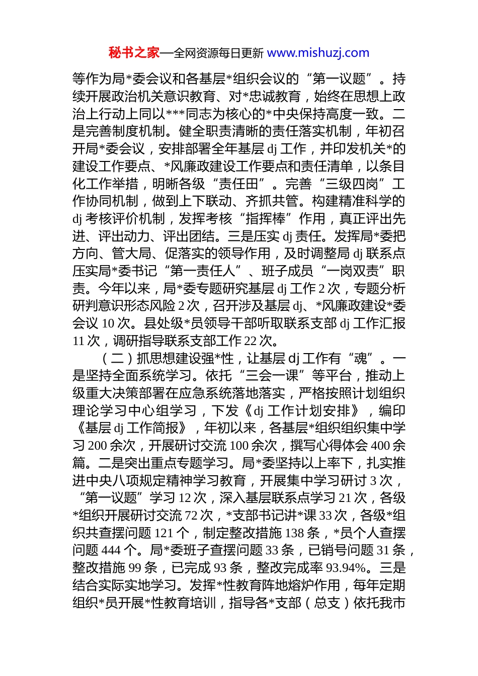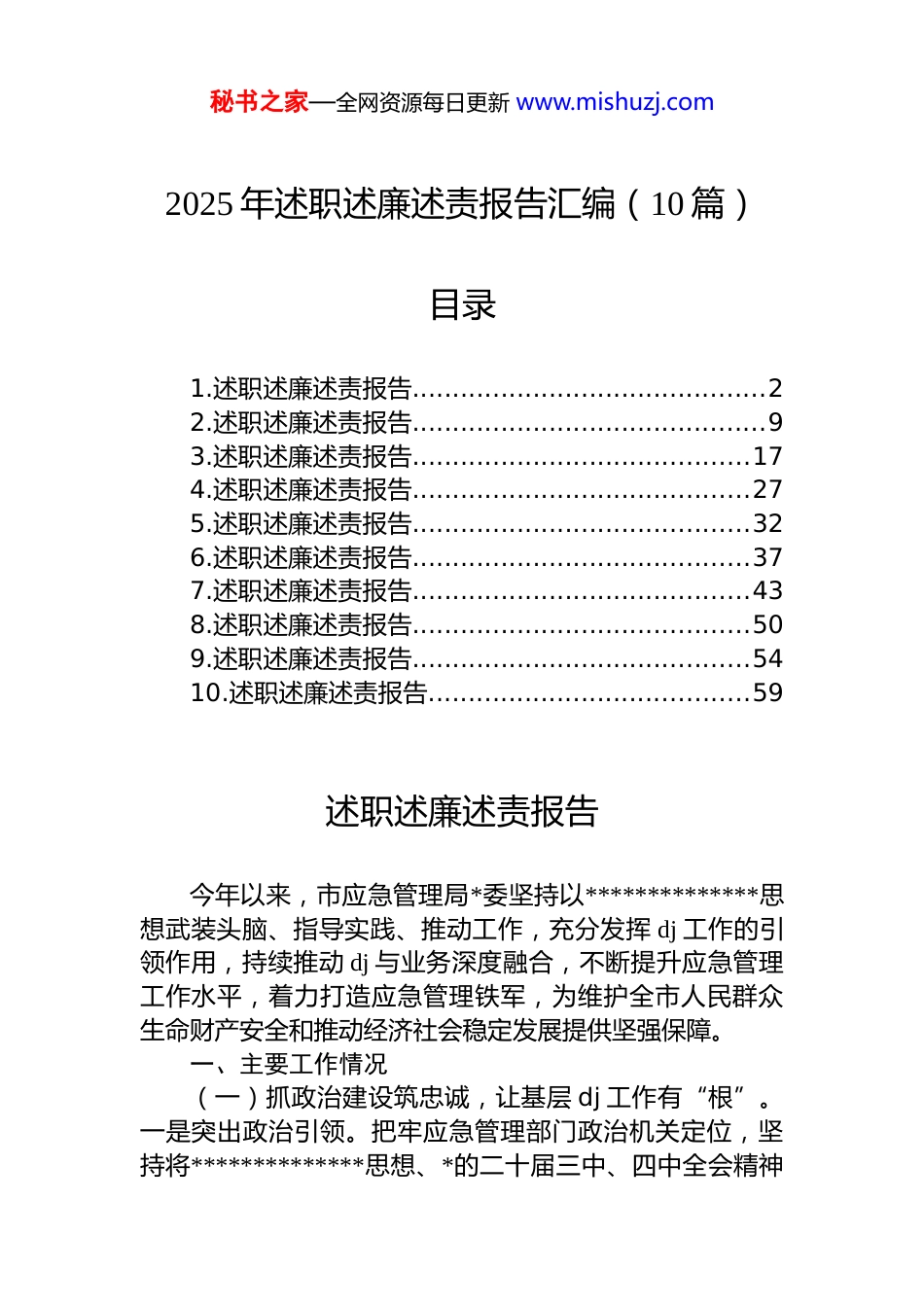 秘书之家—全网资源每日更新 www.mishuzj.com2025 年述职述廉述责报告汇编(10 篇)目录1.述职述廉述责报告............................................22.述职述廉述责报告............................................93.述职述廉述责报告..........................................174.述职述廉述责报告..........................................275.述职述廉述责报告..........................................326.述职述廉述责报告..........................................377.述职述廉述责报告..........................................438.述职述廉述责报告..........................................509.述职述廉述责报告..........................................5410.述职述廉述责报告........................................59述职述廉述责报告今年以来,市应急管理局*委坚持以**************思想武装头脑、指导实践、推动工作,充分发挥 dj 工作的引领作用,持续推动 dj 与业务深度融合,不断提升应急管理工作水平,着力打造应急管理铁军,为维护全市人民群众生命财产安全和推动经济社会稳定发展提供坚强保障。一、主要工作情况(一)抓政治建设筑忠诚,让基层 dj 工作有“根”。一是突出政治引领。把牢应急管理部门政治机关定位,坚持将**************思想、*的二十届三中、四中全会精神秘书之家—全网资源每日更新 www.mishuzj.com等作为局*委会议和各基层*组织会议的“第一议题”。持续开展政治机关意识教育、对*忠诚教育,始终在思想上政治上行动上同以***同志为核心的*中央保持高度一致。二是完善制度机制。健全职责清晰的责任落实机制,年初召开局*委会议,安排部署全年基层 dj 工作,并印发机关*的建设工作要点、*风廉政建设工作要点和责任清单,以条目化工作举措,明晰各级“责任田”。完善“三级四岗”工作协同机制,做到上下联动、齐抓共管。构建精准科学的dj 考核评价机制,发挥考核“指挥棒”作用,真正评出先进、评出动力、评出团结。三是压实 dj 责任。发挥局*委把方向、管大局、促落实的领导作用,及时调整局 dj 联系点压实局*委书记“第一责任人”、班子成员“一岗双责”职责。今年以来,局*委专题研究基层 dj 工作 2 次,专题分析研判意识形态风险 2 次,召开涉及基层 dj、*风廉政建设*委会议 10 次。县处级*员领导干部听取联系支部 dj 工作汇报11 次,调研指导联系支部工作 22 次。(二)抓思想建设强*性,让基层 dj 工作有“魂”。一是坚持全面系统学习。依托“三会一课”等平台,推动上级重大决策部署在应急系统落地落实,严格按照计划组织理论学习中心组学习,下发《dj 工作计划安排》,编印《基层 dj 工作简报》,年初以来,各基层*组织组织集中学习 200 余次,开展研讨交流 100 余次,撰写心得体会 400 余篇。二是突出重点专题学习。局*委坚持以上率下,扎实推进中央八项规定精神学习教育,开展集中学习研讨 3 次,“第一议题”学习 12 次,深入基层联系点学习 21 次,各级*组织开展研讨交流 72 次,*支部书记讲*课 33 次,各级*组织共查摆问题 121 个,制定整改措施 138 条,*员个人查摆问题 444 个。局*委班子查摆问题 33 条,已销号问题 31 条,整改措施 99 条,已完成 93 条,整改完成率 93.94%。三是结合实际实地学习。发挥*性教育阵地熔炉作用,每年定期组织*员开展*性教育培训,指导各*支部(总支)依托我市秘书之家—全网资源每日更新 www.mishuzj.com红色教育资源开展丰富多样的主题*日活动和支部结对共建活动。结合业务工作需要,组织全局干部职工开展干部素质能力提升专题培训,不断夯实*员干部思想基础。(三)抓组织建设夯基础,让基层 dj 工作有“为”。一是建强组织堡垒。督促各级*组织从严从实抓好组织生活制度,用好基层 dj 信息化平台,并召开*的组织生活制度标准化规范化培训会,对*内政治生活的规范性和严肃性进行再学习。按程序做好上年度 dj 述职评议考核工作,评定“好”等次支部书记 17 人,“较好”等次支部书记 6 ...