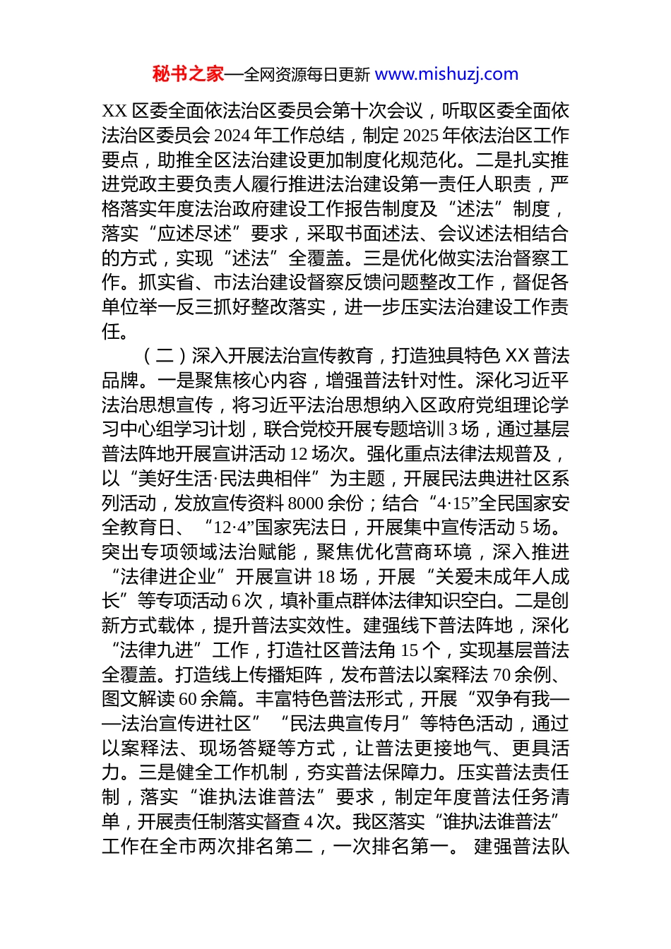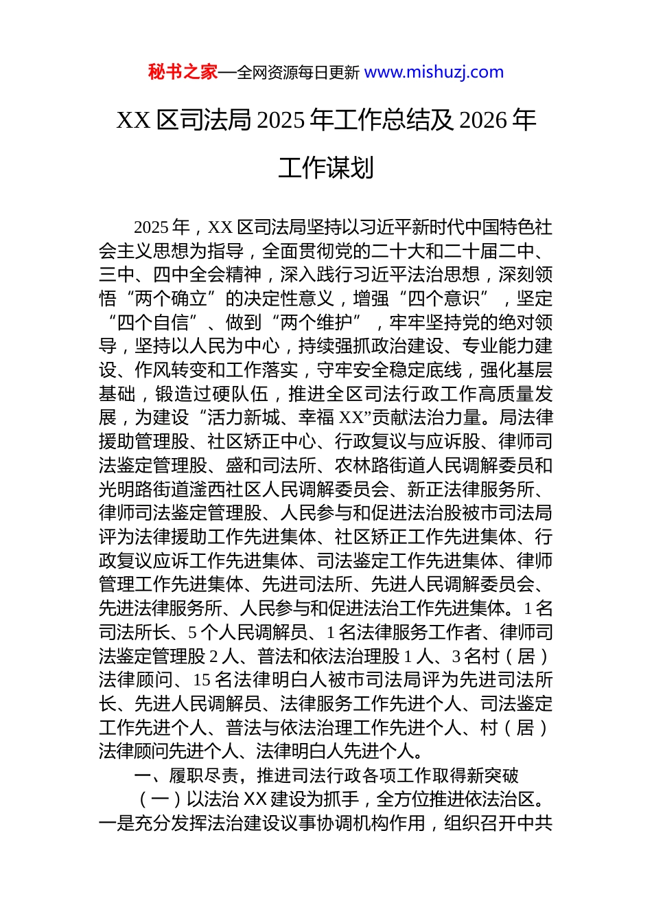 秘书之家—全网资源每日更新 www.mishuzj.comXX 区司法局 2025 年工作总结及 2026 年工作谋划2025 年,XX 区司法局坚持以习近平新时代中国特色社会主义思想为指导,全面贯彻党的二十大和二十届二中、三中、四中全会精神,深入践行习近平法治思想,深刻领悟“两个确立”的决定性意义,增强“四个意识”,坚定“四个自信”、做到“两个维护”,牢牢坚持党的绝对领导,坚持以人民为中心,持续强抓政治建设、专业能力建设、作风转变和工作落实,守牢安全稳定底线,强化基层基础,锻造过硬队伍,推进全区司法行政工作高质量发展,为建设“活力新城、幸福 XX”贡献法治力量。局法律援助管理股、社区矫正中心、行政复议与应诉股、律师司法鉴定管理股、盛和司法所、农林路街道人民调解委员和光明路街道滏西社区人民调解委员会、新正法律服务所、律师司法鉴定管理股、人民参与和促进法治股被市司法局评为法律援助工作先进集体、社区矫正工作先进集体、行政复议应诉工作先进集体、司法鉴定工作先进集体、律师管理工作先进集体、先进司法所、先进人民调解委员会、先进法律服务所、人民参与和促进法治工作先进集体。1 名司法所长、5 个人民调解员、1 名法律服务工作者、律师司法鉴定管理股 2 人、普法和依法治理股 1 人、3 名村(居)法律顾问、15 名法律明白人被市司法局评为先进司法所长、先进人民调解员、法律服务工作先进个人、司法鉴定工作先进个人、普法与依法治理工作先进个人、村(居)法律顾问先进个人、法律明白人先进个人。一、履职尽责,推进司法行政各项工作取得新突破(一)以法治 XX 建设为抓手,全方位推进依法治区。一是充分发挥法治建设议事协调机构作用,组织召开中共秘书之家—全网资源每日更新 www.mishuzj.comXX 区委全面依法治区委员会第十次会议,听取区委全面依法治区委员会 2024 年工作总结,制定 2025 年依法治区工作要点,助推全区法治建设更加制度化规范化。二是扎实推进党政主要负责人履行推进法治建设第一责任人职责,严格落实年度法治政府建设工作报告制度及“述法”制度,落实“应述尽述”要求,采取书面述法、会议述法相结合的方式,实现“述法”全覆盖。三是优化做实法治督察工作。抓实省、市法治建设督察反馈问题整改工作,督促各单位举一反三抓好整改落实,进一步压实法治建设工作责任。(二)深入开展法治宣传教育,打造独具特色 XX 普法品牌。一是聚焦核心内容,增强普法针对性。深化习近平法治思想宣传,将习近平法治思想纳入区政府党组理论学习中心组学习计划,联合党校开展专题培训 3 场,通过基层普法阵地开展宣讲活动 12 场次。强化重点法律法规普及,以“美好生活·民法典相伴”为主题,开展民法典进社区系列活动,发放宣传资料 8000 余份;结合“4·15”全民国家安全教育日、“12·4”国家宪法日,开展集中宣传活动 5 场。突出专项领域法治赋能,聚焦优化营商环境,深入推进“法律进企业”开展宣讲 18 场,开展“关爱未成年人成长”等专项活动 6 次,填补重点群体法律知识空白。二是创新方式载体,提升普法实效性。建强线下普法阵地,深化“法律九进”工作,打造社区普法角 15 个,实现基层普法全覆盖。打造线上传播矩阵,发布普法以案释法 70 余例、图文解读 60 余篇。丰富特色普法形式,开展“双争有我——法治宣传进社区”“民法典宣传月”等特色活动,通过以案释法、现场答疑等方式,让普法更接地气、更具活力。三是健全工作机制,夯实普法保障力。压实普法责任制,落实“谁执法谁普法”要求,制定年度普法任务清单,开展责任制落实督查 4 次。我区落实“谁执法谁普法”工作在全市两次排名第二,一次排名第一。 建强普法队秘书之家—全网资源每日更新 www.mishuzj.com伍,扩充普法讲师团至 30 人,选聘 25 名社会监督员参与普法监督,组建“法律明白人”队伍覆盖所有村(社区),筑牢基层普法根基。(三)深入推进依法行政,提高法治工作水平。1.强化行政执法监督,规范公正文明执法。一是扎实推进整治违规异地执法、趋利性执法以及乱收费、乱罚款、乱检查、乱查封等规范涉企行政执...