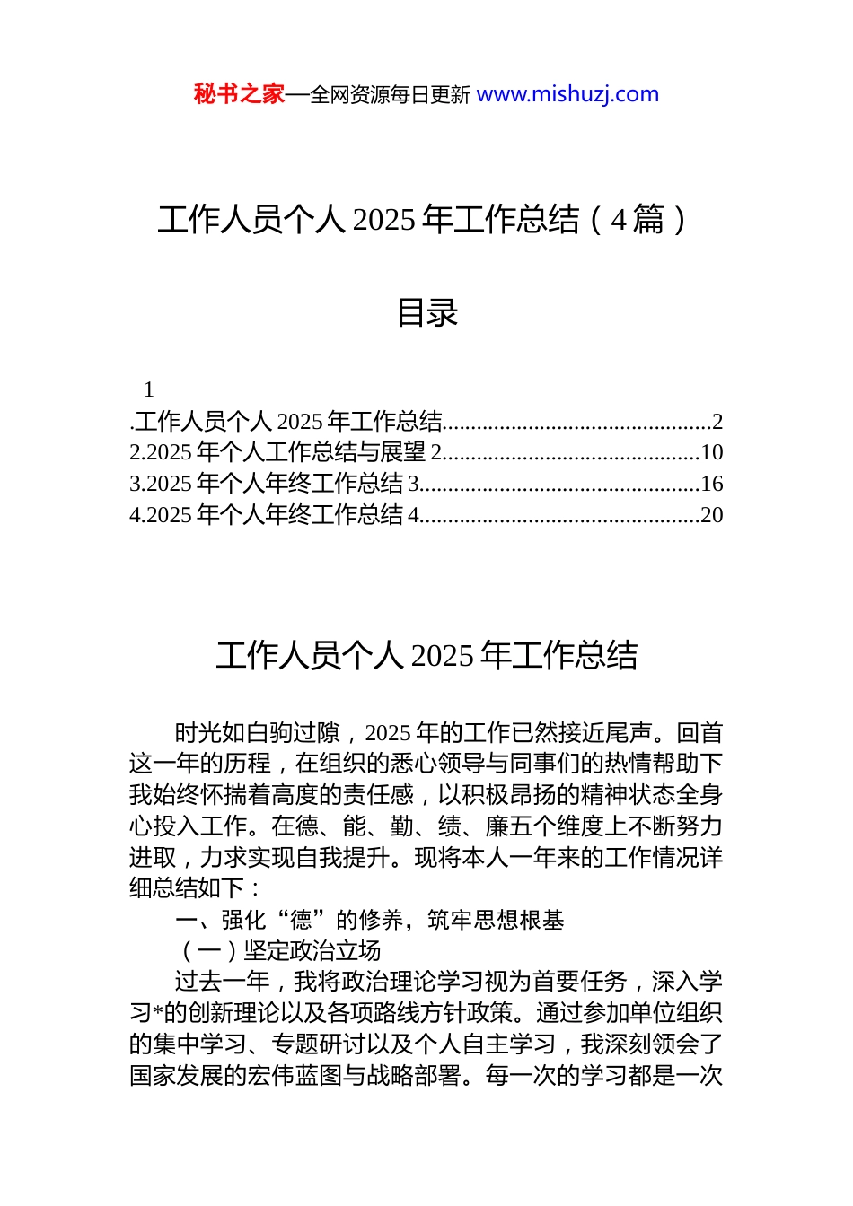 秘书之家—全网资源每日更新 www.mishuzj.com工作人员个人 2025 年工作总结(4 篇)目录1.工作人员个人 2025 年工作总结...............................................22.2025 年个人工作总结与展望 2.............................................103.2025 年个人年终工作总结 3.................................................164.2025 年个人年终工作总结 4.................................................20工作人员个人 2025 年工作总结时光如白驹过隙,2025 年的工作已然接近尾声。回首这一年的历程,在组织的悉心领导与同事们的热情帮助下我始终怀揣着高度的责任感,以积极昂扬的精神状态全身心投入工作。在德、能、勤、绩、廉五个维度上不断努力进取,力求实现自我提升。现将本人一年来的工作情况详细总结如下:一、强化“德”的修养,筑牢思想根基(一)坚定政治立场过去一年,我将政治理论学习视为首要任务,深入学习*的创新理论以及各项路线方针政策。通过参加单位组织的集中学习、专题研讨以及个人自主学习,我深刻领会了国家发展的宏伟蓝图与战略部署。每一次的学习都是一次秘书之家—全网资源每日更新 www.mishuzj.com思想的洗礼,让我更加清晰地认识到自己肩负的责任与使命。在日常工作和生活中,我时刻保持政治敏锐性和政治鉴别力,自觉在思想、政治和行动上与组织保持高度一致积极参与单位组织的各类 zt 教育与实践活动,如红色革命基地参观学习、*史知识竞赛等,在这些活动中,我深切感受到了先辈们的革命精神和无私奉献,进一步提升了自己的政治觉悟和大局意识。(二)恪守职业道德在工作中,我始终秉持爱岗敬业、诚实守信、公道正派的职业道德原则。对待每一项工作任务,我都做到实事求是,绝不弄虚作假。在与同事相处时,我真诚友善,积极主动地与大家协作配合,共同攻克工作中的难关。面对群众和客户,我始终保持耐心细致的服务态度,尽力为他们解决实际问题。记得有一次,一位客户对我们的服务流程不太理解,情绪比较激动。我耐心地倾听他的诉求,用通俗易懂的语言为他解释每一个环节,最终客户不仅理解了我们的工作,还对我的服务表示了感谢。通过这件事,我更加深刻地体会到了职业道德的重要性,也更加坚定了自己恪守职业道德的决心。(三)涵养个人品德我注重社会公德和家庭美德的培养,努力营造积极健康的生活氛围。在社会生活中,我遵守公共秩序,爱护公共环境,积极参与公益活动,尽自己的一份力量为社会做出贡献。在家庭生活中,我关心家人,承担起自己应尽的责任,与家人相互理解、相互支持。同时,我保持积极健康的生活方式和情趣,自觉抵制各种不良风气的侵蚀,努力做一个品行端正、情趣健康、受人尊重的人。二、提升“能”的本领,增强履职效能(一)提升学习能力面对不断变化的新形势和日益艰巨的新任务,我时刻保持“本领恐慌”的危机感,主动学习行业新知识、新技秘书之家—全网资源每日更新 www.mishuzj.com能、新法规。年内,我系统学习了《大数据分析与应用》深入了解了大数据在我们行业中的应用场景和发展趋势。同时,我报名参加了《项目管理专题培训》,通过系统的学习和实践操作,取得了项目管理专业人士资格认证。在学习过程中,我注重将理论知识与实际工作相结合,努力将学习成果转化为谋划工作的思路和推动工作的举措。例如,在学习大数据分析后,我尝试运用相关技术对我们的业务数据进行分析,为业务决策提供了更有价值的参考。(二)锤炼业务能力我深耕本职业务,力求成为行家里手。在日常工作中,我熟练运用各种方法和工具,不断提升工作效率。在数据分析工作中,我引入了新的数据分析模型,使报告生成时间缩短,大大提高了工作效率。在公司的一个重要项目中我负责项目的进度管理和协调工作。通过精细化的项目管理和跨部门沟通协调,我及时解决了项目中出现的各种问题,保障了项目的顺利推进。在这个过程中,我不仅锻炼了自己的项目管理能力,还提升了跨部门沟通协作的能力。(三)培养创新能力我不满足于按部就班的工作方式,积极尝试在工作中引入新方法、新视角。针对客户服务工作中的痛点,我提...