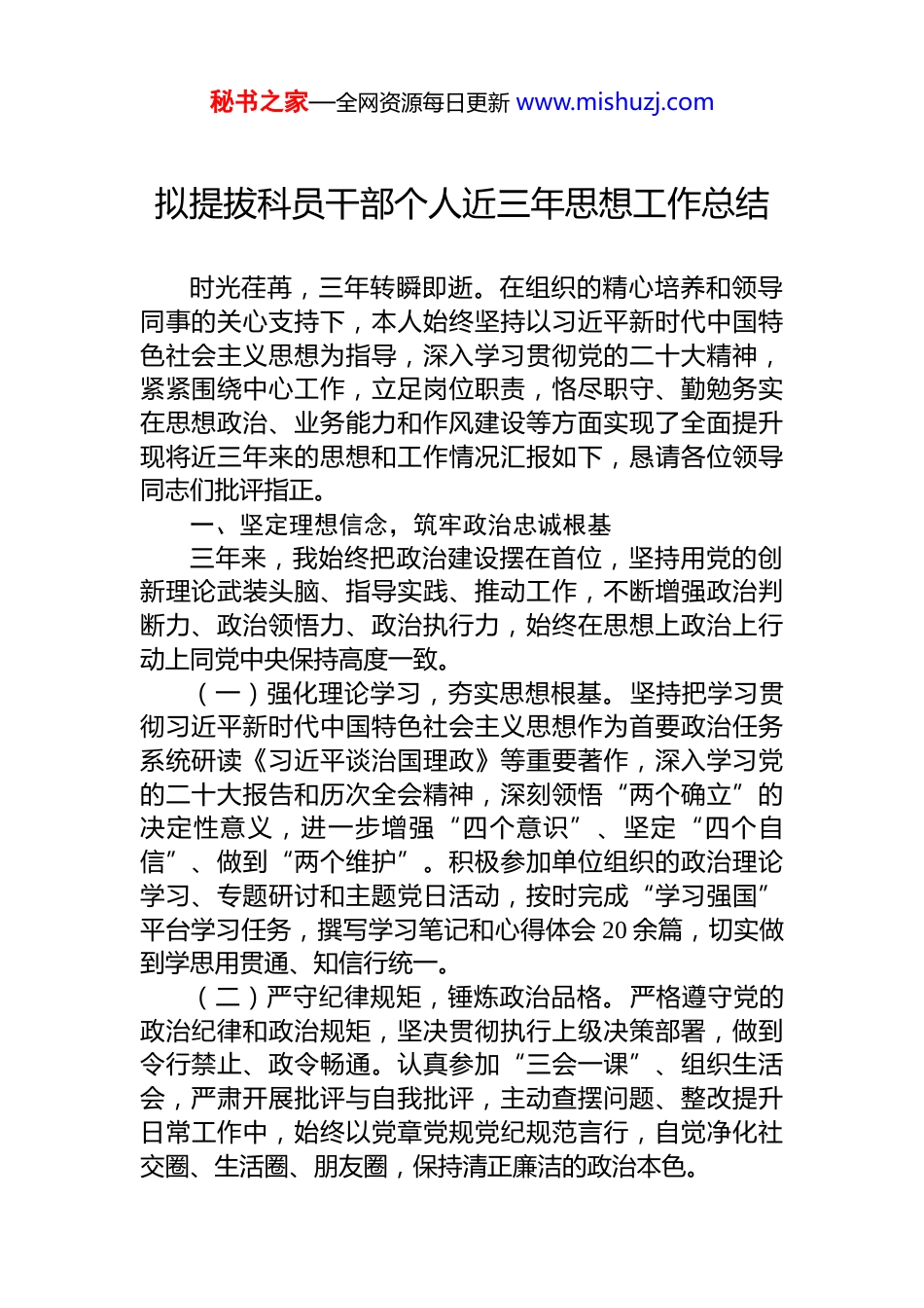 秘书之家—全网资源每日更新 www.mishuzj.com拟提拔科员干部个人近三年思想工作总结时光荏苒,三年转瞬即逝。在组织的精心培养和领导同事的关心支持下,本人始终坚持以习近平新时代中国特色社会主义思想为指导,深入学习贯彻党的二十大精神,紧紧围绕中心工作,立足岗位职责,恪尽职守、勤勉务实在思想政治、业务能力和作风建设等方面实现了全面提升现将近三年来的思想和工作情况汇报如下,恳请各位领导同志们批评指正。一、坚定理想信念,筑牢政治忠诚根基三年来,我始终把政治建设摆在首位,坚持用党的创新理论武装头脑、指导实践、推动工作,不断增强政治判断力、政治领悟力、政治执行力,始终在思想上政治上行动上同党中央保持高度一致。(一)强化理论学习,夯实思想根基。坚持把学习贯彻习近平新时代中国特色社会主义思想作为首要政治任务系统研读《习近平谈治国理政》等重要著作,深入学习党的二十大报告和历次全会精神,深刻领悟“两个确立”的决定性意义,进一步增强“四个意识”、坚定“四个自信”、做到“两个维护”。积极参加单位组织的政治理论学习、专题研讨和主题党日活动,按时完成“学习强国”平台学习任务,撰写学习笔记和心得体会 20 余篇,切实做到学思用贯通、知信行统一。(二)严守纪律规矩,锤炼政治品格。严格遵守党的政治纪律和政治规矩,坚决贯彻执行上级决策部署,做到令行禁止、政令畅通。认真参加“三会一课”、组织生活会,严肃开展批评与自我批评,主动查摆问题、整改提升日常工作中,始终以党章党规党纪规范言行,自觉净化社交圈、生活圈、朋友圈,保持清正廉洁的政治本色。秘书之家—全网资源每日更新 www.mishuzj.com(三)践行初心使命,厚植为民情怀。牢固树立以人民为中心的发展思想,坚持把群众满意作为工作的出发点和落脚点。在基层服务、政策宣传等工作中,主动深入社区、走访群众,倾听民声、了解民意。例如,在参与某次困难家庭走访时,发现一名独居老人存在冬季取暖困难问题,及时协调街道及民政部门,帮助其申请临时救助并加装取暖设备,切实解决了实际困难。此类经历让我更加深刻体会到,只有把群众的小事当作自己的大事来办,才能真正践行共产党员的初心使命。二、聚焦主责主业,提升履职尽责能力近三年来,我始终以高度的责任感和使命感投入本职工作,坚持在实干中增长才干,在履职中体现担当,努力推动各项工作高效落实。(一)立足岗位实际,高质量完成各项任务。一是扎实做好文稿起草与综合协调工作。负责起草年度总结、汇报材料、通知简报等各类文稿 130 余篇,多次参与重要会议筹备和材料撰写,确保内容准确、逻辑清晰、表达规范。组织协调各类工作会议 40 余场,做好会前准备、会中服务和会后督办,保障政令运转高效有序。二是积极参与重点任务推进。在本单位承担的“智慧社区建设试点”项目中承担数据采集、方案细化和部门对接等工作。针对初期居民参与度不高的问题,提出“线上问卷+线下宣讲”相结合的调研方式,有效提升信息收集覆盖面,为项目科学决策提供了有力支撑。项目最终顺利通过县级验收,并被列为示范推广案例。三是着力推动工作提质增效。面对文件归档效率低、查找不便等问题,主动学习档案管理信息化技术,推动建立电子化归档系统,实现文件分类标准化、检索智能化,文件调阅时间平均缩短 60%,显著提升了办公效率和服务质量。(二)注重能力提升,锻造过硬业务本领。一是加强专业学习,夯实知识储备。系统学习行政管理、公文写作秘书之家—全网资源每日更新 www.mishuzj.com政策法规等相关知识,积极参加青年干部培训班、公文写作专题培训等各类学习活动 10 余次,持续拓宽视野、更新理念。通过自学掌握 SPSS 基础数据分析技能,应用于年度绩效评估数据处理,提高了分析精准度。二是勇于攻坚克难,提升实战能力。在处理一起群众信访事项过程中,面对诉求复杂、涉及部门多的情况,能够冷静分析、主动沟通,牵头梳理问题清单,协调相关部门召开联席会议,推动形成解决方案,最终实现矛盾妥善化解,避免了事态升级,维护了社会稳定。三是强化团队协作,凝聚工作合力在疫情防控应急值守、文明城市...