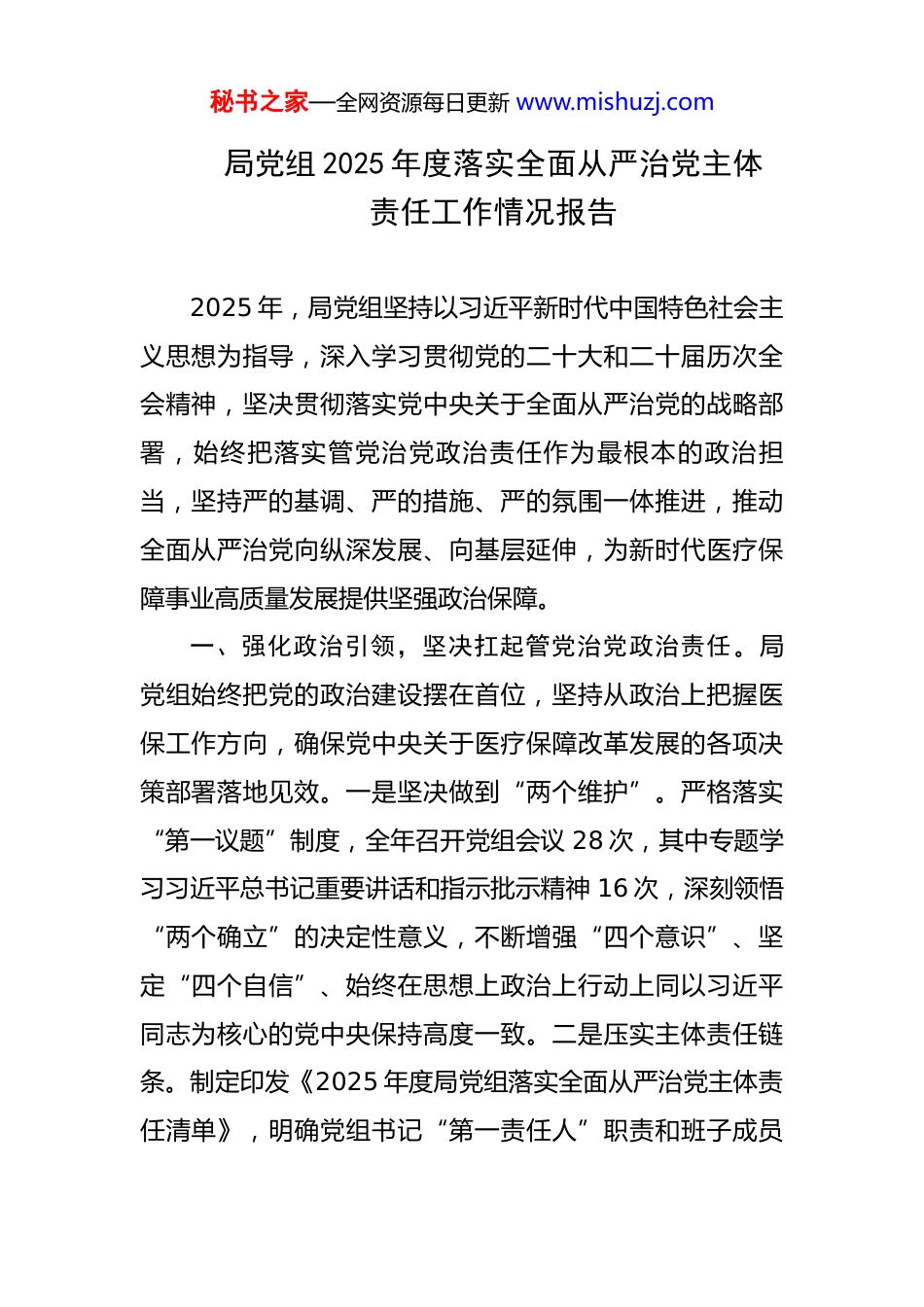 秘书之家—全网资源每日更新 www.mishuzj.com局党组 2025 年度落实全面从严治党主体责任工作情况报告 2025 年,局党组坚持以习近平新时代中国特色社会主义思想为指导,深入学习贯彻党的二十大和二十届历次全会精神,坚决贯彻落实党中央关于全面从严治党的战略部署,始终把落实管党治党政治责任作为最根本的政治担当,坚持严的基调、严的措施、严的氛围一体推进,推动全面从严治党向纵深发展、向基层延伸,为新时代医疗保障事业高质量发展提供坚强政治保障。一、强化政治引领,坚决扛起管党治党政治责任。局党组始终把党的政治建设摆在首位,坚持从政治上把握医保工作方向,确保党中央关于医疗保障改革发展的各项决策部署落地见效。一是坚决做到“两个维护”。严格落实“第一议题”制度,全年召开党组会议 28 次,其中专题学习习近平总书记重要讲话和指示批示精神 16 次,深刻领悟“两个确立”的决定性意义,不断增强“四个意识”、坚定“四个自信”、始终在思想上政治上行动上同以习近平同志为核心的党中央保持高度一致。二是压实主体责任链条。制定印发《2025 年度局党组落实全面从严治党主体责任清单》,明确党组书记“第一责任人”职责和班子成员秘书之家—全网资源每日更新 www.mishuzj.com“一岗双责”,形成一级抓一级、层层抓落实的责任体系。全年开展党风廉政建设专题研究 6 次,听取班子成员履职情况汇报 4 次,对苗头性、倾向性问题及时提醒谈话12 人次,切实做到守土有责、守土尽责。三是严明政治纪律规矩。严格执行重大事项请示报告制度,全年向县委、县纪委监委报告重要工作、重大事项 23 项。持续深化政治机关建设,组织党员干部开展党章党规党纪专题学习教育月活动,举办“严守政治纪律、筑牢思想防线”主题党课 3场,覆盖全体干部职工 96 人次,进一步增强政治判断力、政治领悟力、政治执行力。二、深化理论武装,筑牢拒腐防变思想根基。坚持思想建党、理论强党,把学习贯彻党的创新理论作为首要政治任务,着力在学懂弄通做实上下功夫。一是抓实理论学习常态化。制定年度理论学习中心组学习计划,围绕党的二十大精神、中国式现代化理论体系、全面从严治党战略部署等内容开展集体学习 12 次,班子成员撰写心得体会36 篇。组织全体党员参加“学习强国”平台在线学习,人均日积分达 45 分以上,年度总积分位居全县机关单位前列。二是推进主题教育成果转化。巩固拓展学习贯彻习近平新时代中国特色社会主义思想主题教育成果,建立健全“我为群众办实事”长效机制,全年推动解决参保群众反秘书之家—全网资源每日更新 www.mishuzj.com映强烈的异地就医备案难、待遇享受不及时等问题 17 项,群众满意度达 98.6%。三是加强廉政警示教育。组织观看《零容忍》《永远吹冲锋号》等警示教育片 4 场,通报典型案例 12 起,开展“以案四说”专题讨论会 3 次。组织党员干部赴县廉政教育基地接受现场教育,开展“清风医保”廉洁文化宣传周活动,发放家庭助廉倡议书 80 余份,推动廉洁理念融入日常、浸润人心。三、夯实组织基础,提升基层党建工作质效牢固树立大抓基层的鲜明导向,持续推进党支部标准化规范化建设,不断增强党组织政治功能和组织功能。一是规范党内政治生活。严格执行“三会一课”、组织生活会、民主评议党员等制度,全年召开支部党员大会 8 次、支委会 12 次、党小组会 24 次,党组书记带头讲党课 2次,班子成员到联系支部讲党课 6 次。高质量召开年度民主生活会和组织生活会,查摆问题 42 条,制定整改措施56 项,均已整改到位。二是建强战斗堡垒作用。持续推进“五星支部”创建,县医保服务中心党支部被评为县级“先进基层党组织”。在医保经办服务窗口设立“党员先锋岗”12 个,组建“医保政策宣讲队”“帮办代办服务队”等志愿服务队伍,全年开展政策进社区、进乡村、进企业活动 35 场次,服务群众逾万人次。三是严格党员教育秘书之家—全网资源每日更新 www.mishuzj.com管理。全年发展预备党员 2 名,确定入党积极分子 3 名。建立党员积分管理制度,将参与组织生活、志愿服务、业务绩效等纳入量化...
