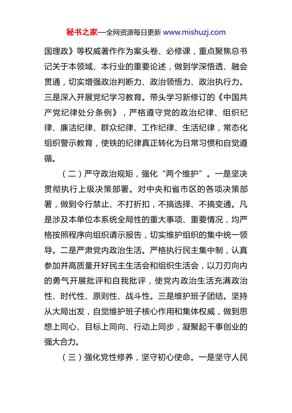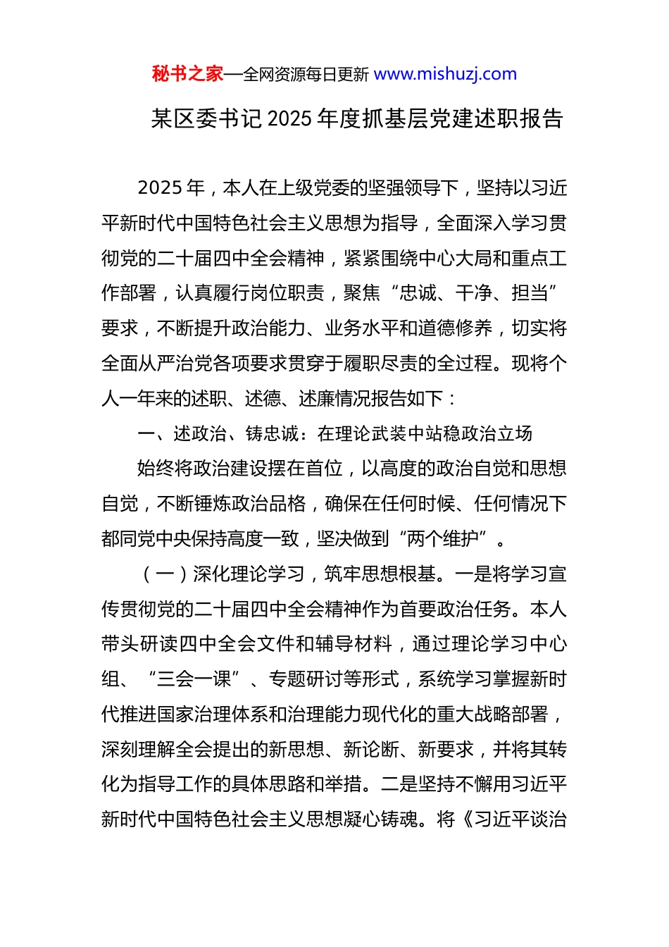 秘书之家—全网资源每日更新 www.mishuzj.com某区委书记 2025 年度抓基层党建述职报告 2025 年,本人在上级党委的坚强领导下,坚持以习近平新时代中国特色社会主义思想为指导,全面深入学习贯彻党的二十届四中全会精神,紧紧围绕中心大局和重点工作部署,认真履行岗位职责,聚焦“忠诚、干净、担当”要求,不断提升政治能力、业务水平和道德修养,切实将全面从严治党各项要求贯穿于履职尽责的全过程。现将个人一年来的述职、述德、述廉情况报告如下:一、述政治、铸忠诚:在理论武装中站稳政治立场始终将政治建设摆在首位,以高度的政治自觉和思想自觉,不断锤炼政治品格,确保在任何时候、任何情况下都同党中央保持高度一致,坚决做到“两个维护”。(一)深化理论学习,筑牢思想根基。一是将学习宣传贯彻党的二十届四中全会精神作为首要政治任务。本人带头研读四中全会文件和辅导材料,通过理论学习中心组、“三会一课”、专题研讨等形式,系统学习掌握新时代推进国家治理体系和治理能力现代化的重大战略部署,深刻理解全会提出的新思想、新论断、新要求,并将其转化为指导工作的具体思路和举措。二是坚持不懈用习近平新时代中国特色社会主义思想凝心铸魂。将《习近平谈治秘书之家—全网资源每日更新 www.mishuzj.com国理政》等权威著作作为案头卷、必修课,重点聚焦总书记关于本领域、本行业的重要论述,做到学深悟透、融会贯通,切实增强政治判断力、政治领悟力、政治执行力。三是深入开展党纪学习教育。带头学习新修订的《中国共产党纪律处分条例》,严格遵守党的政治纪律、组织纪律、廉洁纪律、群众纪律、工作纪律、生活纪律,常态化组织警示教育,使铁的纪律真正转化为日常习惯和自觉遵循。(二)严守政治规矩,强化“两个维护”。一是坚决贯彻执行上级决策部署。对中央和省市区的各项决策部署,做到令行禁止、不打折扣,不搞选择、不搞变通。凡是涉及本单位本系统全局性的重大事项、重要情况,均严格按照程序向组织请示报告,切实维护组织的集中统一领导。二是严肃党内政治生活。严格执行民主集中制,认真参加并高质量开好民主生活会和组织生活会,以刀刃向内的勇气开展批评和自我批评,使党内政治生活充满政治性、时代性、原则性、战斗性。三是维护班子团结。坚持从大局出发,自觉维护班子核心作用和集体权威,做到思想上同心、目标上同向、行动上同步,凝聚起干事创业的强大合力。(三)强化党性修养,坚守初心使命。一是坚守人民秘书之家—全网资源每日更新 www.mishuzj.com立场。牢记党的根本宗旨,把人民群众满意作为衡量一切工作的根本标准。在谋划推进各项工作时,坚持深入基层、深入一线,问需于民、问计于民,确保制定的政策和采取的措施符合民意、服务民生。二是传承红色基因。定期参加党性教育活动,重温入党誓词,深刻体悟老一辈革命家的奋斗精神和奉献精神,始终保持共产党人的政治本色和精神追求。三是树立正确的权力观。深刻认识到权力是党和人民赋予的,是用来为人民服务的,始终秉公用权、依法用权、廉洁用权,不谋私利。二、述职能、重实干:在服务大局中推动高质量发展紧扣区委、区政府确定的中心任务和年度工作目标,积极作为、担当实干,将各项工作部署转化为具体行动和实际成效。(一)紧扣中心工作,实现年度目标。一是高效推进重点项目建设。全年共牵头负责项目 X 项,本人严格实行“一线工作法”,定期召开项目调度会,协调解决土地、资金、审批等瓶颈问题。通过优化流程和责任分工,确保所有项目均按时间节点或提前完成,其中 XX 项目被评为全市典型示范项目。二是深度参与区域发展战略。组织编制了《XX 领域三年行动计划》,提出了 X 项具有前瞻性和可操作性的改革举措。特别是大力推动“数字 XX”建设,完秘书之家—全网资源每日更新 www.mishuzj.com成了 X 个关键数字化平台的搭建和应用,有效提升了行政效率和公共服务水平。三是增强经济发展支撑力。坚持“抓大不放小”,全年招引重点企业 X 家,总投资额达 X亿元。优化营商环境,推行“最多跑一次”改革,大幅压缩审批时限,为各类市场主体提供了优质高效的服务保障...