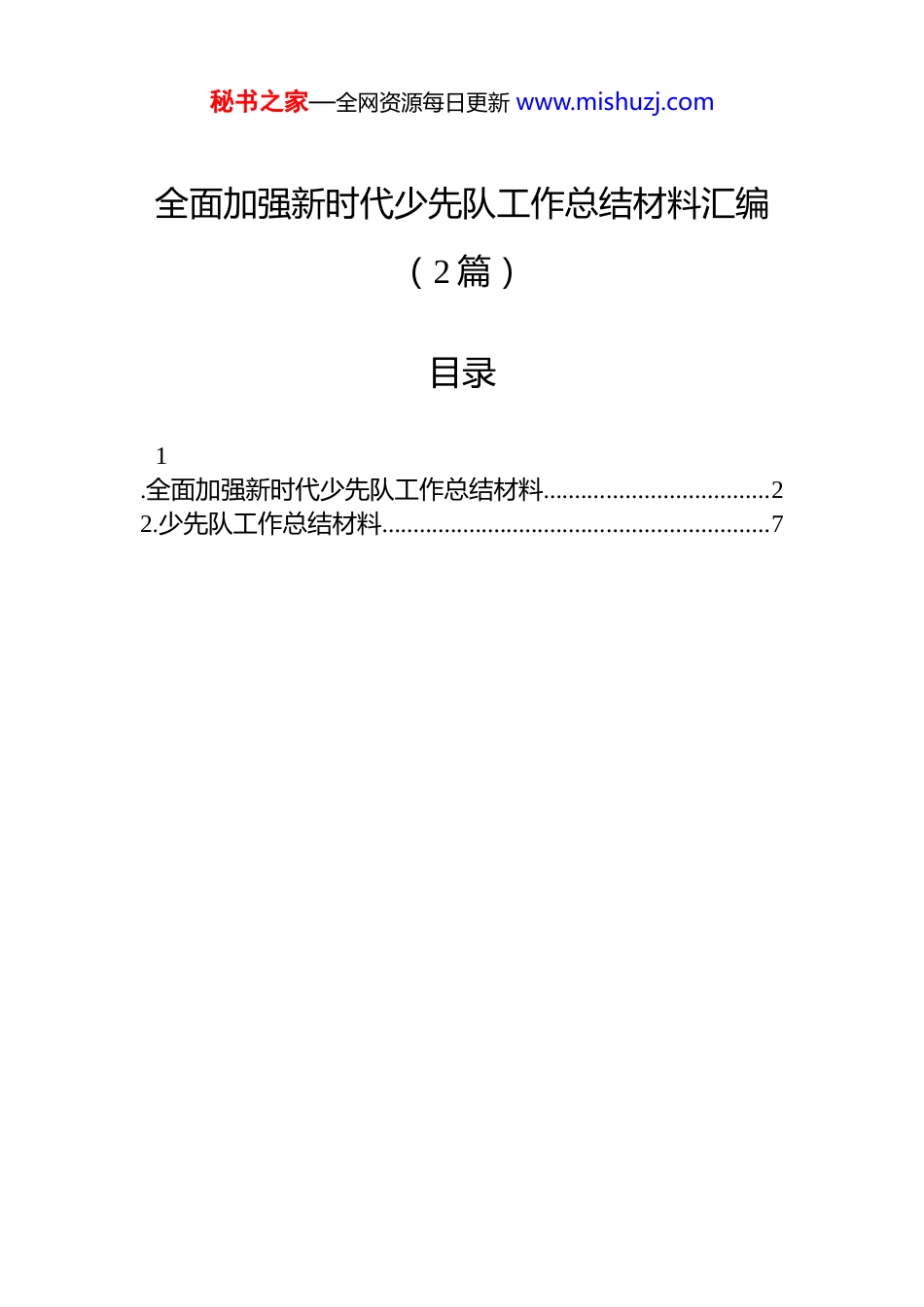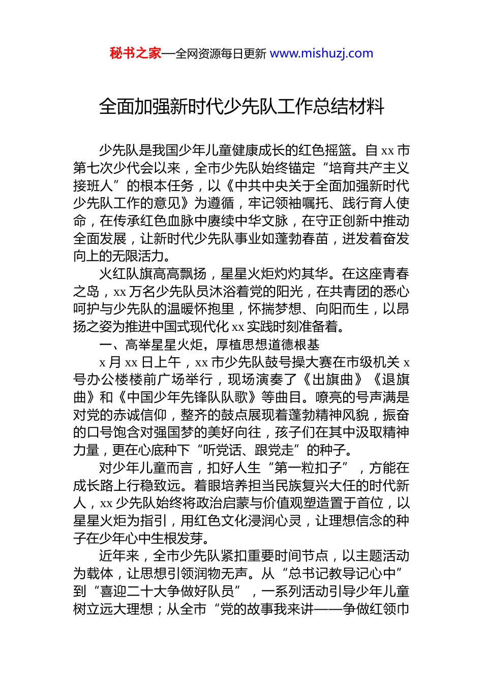 秘书之家—全网资源每日更新 www.mishuzj.com全面加强新时代少先队工作总结材料汇编(2 篇)目录1.全面加强新时代少先队工作总结材料....................................22.少先队工作总结材料..............................................................7秘书之家—全网资源每日更新 www.mishuzj.com全面加强新时代少先队工作总结材料少先队是我国少年儿童健康成长的红色摇篮。自 xx 市第七次少代会以来,全市少先队始终锚定“培育共产主义接班人”的根本任务,以《中共中央关于全面加强新时代少先队工作的意见》为遵循,牢记领袖嘱托、践行育人使命,在传承红色血脉中赓续中华文脉,在守正创新中推动全面发展,让新时代少先队事业如蓬勃春苗,迸发着奋发向上的无限活力。火红队旗高高飘扬,星星火炬灼灼其华。在这座青春之岛,xx 万名少先队员沐浴着党的阳光,在共青团的悉心呵护与少先队的温暖怀抱里,怀揣梦想、向阳而生,以昂扬之姿为推进中国式现代化 xx 实践时刻准备着。一、高举星星火炬,厚植思想道德根基x 月 xx 日上午,xx 市少先队鼓号操大赛在市级机关 x号办公楼楼前广场举行,现场演奏了《出旗曲》《退旗曲》和《中国少年先锋队队歌》等曲目。嘹亮的号声满是对党的赤诚信仰,整齐的鼓点展现着蓬勃精神风貌,振奋的口号饱含对强国梦的美好向往,孩子们在其中汲取精神力量,更在心底种下“听党话、跟党走”的种子。对少年儿童而言,扣好人生“第一粒扣子”,方能在成长路上行稳致远。着眼培养担当民族复兴大任的时代新人,xx 少先队始终将政治启蒙与价值观塑造置于首位,以星星火炬为指引,用红色文化浸润心灵,让理想信念的种子在少年心中生根发芽。近年来,全市少先队紧扣重要时间节点,以主题活动为载体,让思想引领润物无声。从“总书记教导记心中”到“喜迎二十大争做好队员”,一系列活动引导少年儿童树立远大理想;从全市“党的故事我来讲——争做红领巾秘书之家—全网资源每日更新 www.mishuzj.com志愿讲解员”大赛,到 xx 市青少年“红色大讲堂”,再到“红领巾爱祖国——我心中的五星红旗”国旗传递活动,红色基因在互动中代代相传。“红领巾巡讲团”、“逐梦深蓝”红领巾讲师团等宣讲队伍,连续 x 年开展“高举队旗跟党走红色精神伴成长”红色主题宣讲 xxxx 余场,xx 万余名少先队员在聆听中感悟初心,让爱国情、强国志、报国行融入成长点滴。榜样是最好的教科书,仪式是最生动的教育课。近年来,少先队常态化开展“学雷锋”“清明祭英烈”“从小学先锋、长大做先锋”等活动,让社会主义核心价值观从“记在脑里”变为“落在行动”。同时,打造入队、十岁集体生日、初一建队、离队等规范化仪式教育市级样板,以庄重的仪式感强化队员的角色认同与价值认同,让责任感与使命感在心中悄然生长。二、完善校内外培养链条,发挥实践育人优势今年 x 月起,xx 少先队员迎来了专属的“星火信箱”——通过这个特殊的信箱,孩子们不仅可以随时给喜欢的作家老师写信,分享对作品的感悟、倾诉读书的心得,还能收到作家的亲笔回信。一字一句的交流中,小读者与大作家对话,文学素养与表达能力在潜移默化中提升。这小小的信箱,正是 xx 少先队实践育人的一个生动缩影。近年来,全市少先队坚持“实践育人”,加快建设校内外互为补充、有机联动的少先队实践教育体系,不断拓展实践活动项目和载体,开展丰富多彩的实践活动,打造起“红领巾爱自然”“好书伴成长”等一个个亮闪闪的活动品牌。此外,围绕“星火阅读”品牌,不仅举办了系列读书征文、舞台剧活动,更在社区建起 xx 处“红领巾悦读吧”,组建市级主题队课教研团队,拍摄优质少先队活动课 xx 节,还推动学校与西部“手拉手”学校开展“星火书香连山海,纸短情深牵 xx”“石榴籽一家亲,星火阅读同读书”活动,让红色教育从“单向输入”变为“双向滋养”秘书之家—全网资源每日更新 www.mishuzj.com构建起跨越山海的“星火阅读”共读生态。为给少年儿童搭建更广阔的实践平台,全市少先队依托青少年宫、文化场馆等资源,高质量打造 207 处市级少先队校外实践教育基地;在全国...