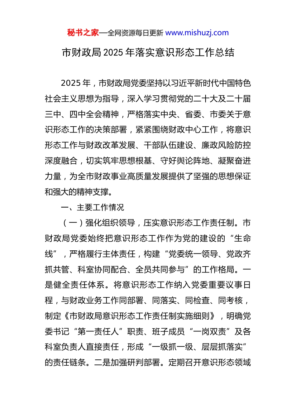 秘书之家—全网资源每日更新 www.mishuzj.com市财政局 2025 年落实意识形态工作总结 2025 年,市财政局党委坚持以习近平新时代中国特色社会主义思想为指导,深入学习贯彻党的二十大及二十届三中、四中全会精神,严格落实中央、省委、市委关于意识形态工作的决策部署,紧紧围绕财政中心工作,将意识形态工作与财政改革发展、干部队伍建设、廉政风险防控深度融合,切实筑牢思想根基、守好舆论阵地、凝聚奋进力量,为全市财政事业高质量发展提供了坚强的思想保证和强大的精神支撑。一、主要工作情况(一)强化组织领导,压实意识形态工作责任制。市财政局党委始终把意识形态工作作为党的建设的“生命线”,严格履行主体责任,构建“党委统一领导、党政齐抓共管、科室协同配合、全员共同参与”的工作格局。一是健全责任体系。将意识形态工作纳入党委重要议事日程,与财政业务工作同部署、同落实、同检查、同考核,制定《市财政局意识形态工作责任制实施细则》,明确党委书记“第一责任人”职责、班子成员“一岗双责”及各科室负责人直接责任,形成“一级抓一级、层层抓落实”的责任链条。二是加强研判部署。定期召开意识形态领域秘书之家—全网资源每日更新 www.mishuzj.com形势分析研判会 6 次、专题部署会 2 次,重点分析财政系统意识形态风险点,针对性制定防控措施;全年开展意识形态工作专项督查 4 次,对苗头性问题早发现、早处置,确保系统内未发生意识形态领域违规违纪问题。三是严格考核问责。将意识形态工作纳入支部党建工作检查和对科室年度考核、党员干部民主评议内容,对落实责任不力的严肃追责问责,推动意识形态工作从“软任务”变为“硬约束”。(二)深化理论武装,筑牢财政干部思想根基。以学习贯彻习近平新时代中国特色社会主义思想为主线,结合财政工作实际,推动理论学习走深走实、入脑入心。一是突出学习重点。制定《市财政局 2025 年度政治理论学习计划》,将习近平总书记关于经济财政工作、意识形态工作的重要论述作为核心内容,组织党员干部原原本本学习《习近平著作选读》等重要文献,全年开展党委理论学习中心组学习 12 次、专题研讨 6 次,党员干部撰写心得体会123 篇。二是创新学习载体。打造“财政大讲堂”“支部微党课”“青年理论学习小组”等平台,开展“中层干部讲党课”“深入贯彻中央八项规定精神学习教育知识竞赛”等活动 8 场;组织党员干部赴廉政教育基地参观学习 3次,重温入党誓词、观看警示教育片,推动学习教育与党秘书之家—全网资源每日更新 www.mishuzj.com性锤炼深度融合。三是强化宣传引导。依托“两微一抖”(微信公众号、工作群、抖音号)等新媒体平台,推送习近平总书记重要讲话精神、财政政策解读、意识形态知识等内容 38 条,阅读量超 5 万人次;在局机关设置“学习专栏”“榜样墙”,营造“比学赶超”的浓厚氛围。(三)守牢阵地防线,强化意识形态阵地管理。坚持“管阵地必须管导向、守阵地必须负全责”,全面加强财政领域各类阵地建设与管理。一是规范舆论阵地。严格执行信息发布审核制度,加强对局内网站、公众号、宣传栏等阵地的内容监管,全年发布财政动态、政策解读等信息156 条,无负面舆情发生;建立网络舆情监测机制,及时回应群众关切的社保、减税降费等热点问题,引导社会舆论正向发展。二是深化文明创建。以创建全国文明单位为抓手,开展“道德模范”“最美财政人”评选活动,选树先进典型 12 人;组建财政志愿服务队,开展“慰老助残”“政策宣讲进社区”“文明交通劝导”等志愿服务 9 次,服务群众 200 余人次,捐赠慰问物资价值 2.3 万元,彰显财政干部的责任担当。三是防控风险隐患。聚焦预算编制、资金拨付、政府采购等重点领域,开展意识形态风险排查 3 次,重点防范“指尖上的形式主义”“政策执行偏差”等问题;加强对退休干部、临聘人员等群体的思想引秘书之家—全网资源每日更新 www.mishuzj.com导,确保意识形态领域“零风险”。(四)融入财政实践,以意识形态引领改革发展。坚持“意识形态工作服务财政中心大局”,将思想引领转化为推动财政工作的强大动力。...