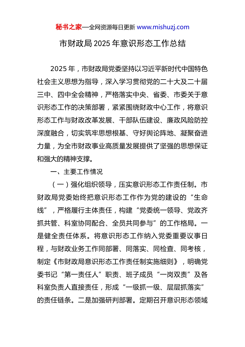 秘书之家—全网资源每日更新 www.mishuzj.com市财政局 2025 年意识形态工作总结 2025 年,市财政局党委坚持以习近平新时代中国特色社会主义思想为指导,深入学习贯彻党的二十大及二十届三中、四中全会精神,严格落实中央、省委、市委关于意识形态工作的决策部署,紧紧围绕财政中心工作,将意识形态工作与财政改革发展、干部队伍建设、廉政风险防控深度融合,切实筑牢思想根基、守好舆论阵地、凝聚奋进力量,为全市财政事业高质量发展提供了坚强的思想保证和强大的精神支撑。一、主要工作情况(一)强化组织领导,压实意识形态工作责任制。市财政局党委始终把意识形态工作作为党的建设的“生命线”,严格履行主体责任,构建“党委统一领导、党政齐抓共管、科室协同配合、全员共同参与”的工作格局。一是健全责任体系。将意识形态工作纳入党委重要议事日程,与财政业务工作同部署、同落实、同检查、同考核,制定《市财政局意识形态工作责任制实施细则》,明确党委书记“第一责任人”职责、班子成员“一岗双责”及各科室负责人直接责任,形成“一级抓一级、层层抓落实”的责任链条。二是加强研判部署。定期召开意识形态领域秘书之家—全网资源每日更新 www.mishuzj.com形势分析研判会 6 次、专题部署会 2 次,重点分析财政系统意识形态风险点,针对性制定防控措施;全年开展意识形态工作专项督查 4 次,对苗头性问题早发现、早处置,确保系统内未发生意识形态领域违规违纪问题。三是严格考核问责。将意识形态工作纳入支部党建工作检查和对科室年度考核、党员干部民主评议内容,对落实责任不力的严肃追责问责,推动意识形态工作从“软任务”变为“硬约束”。(二)深化理论武装,筑牢财政干部思想根基。以学习贯彻习近平新时代中国特色社会主义思想为主线,结合财政工作实际,推动理论学习走深走实、入脑入心。一是突出学习重点。制定《市财政局 2025 年度政治理论学习计划》,将习近平总书记关于经济财政工作、意识形态工作的重要论述作为核心内容,组织党员干部原原本本学习《习近平著作选读》等重要文献,全年开展党委理论学习中心组学习 12 次、专题研讨 6 次,党员干部撰写心得体会123 篇。二是创新学习载体。打造“财政大讲堂”“支部微党课”“青年理论学习小组”等平台,开展“中层干部讲党课”“深入贯彻学习教育知识竞赛”等活动 8 场;组织党员干部赴廉政教育基地参观学习 3 次,重温入党誓词、观看警示教育片,推动学习教育与党性锤炼深度融秘书之家—全网资源每日更新 www.mishuzj.com合。三是强化宣传引导。依托“两微一抖”(微信公众号、工作群、抖音号)等新媒体平台,推送习近平总书记重要讲话精神、财政政策解读、意识形态知识等内容 38条,阅读量超 5 万人次;在局机关设置“学习专栏”“榜样墙”,营造“比学赶超”的浓厚氛围。(三)守牢阵地防线,强化意识形态阵地管理。坚持“管阵地必须管导向、守阵地必须负全责”,全面加强财政领域各类阵地建设与管理。一是规范舆论阵地。严格执行信息发布审核制度,加强对局内网站、公众号、宣传栏等阵地的内容监管,全年发布财政动态、政策解读等信息156 条,无负面舆情发生;建立网络舆情监测机制,及时回应群众关切的社保、减税降费等热点问题,引导社会舆论正向发展。二是深化文明创建。以创建全国文明单位为抓手,开展“道德模范”“最美财政人”评选活动,选树先进典型 12 人;组建财政志愿服务队,开展“慰老助残”“政策宣讲进社区”“文明交通劝导”等志愿服务 9 次,服务群众 200 余人次,捐赠慰问物资价值 2.3 万元,彰显财政干部的责任担当。三是防控风险隐患。聚焦预算编制、资金拨付、政府采购等重点领域,开展意识形态风险排查 3 次,重点防范“指尖上的形式主义”“政策执行偏差”等问题;加强对退休干部、临聘人员等群体的思想引秘书之家—全网资源每日更新 www.mishuzj.com导,确保意识形态领域“零风险”。(四)融入财政实践,以意识形态引领改革发展。坚持“意识形态工作服务财政中心大局”,将思想引领转化为推动财政工作的强大动力。一是凝聚改革共识。围...