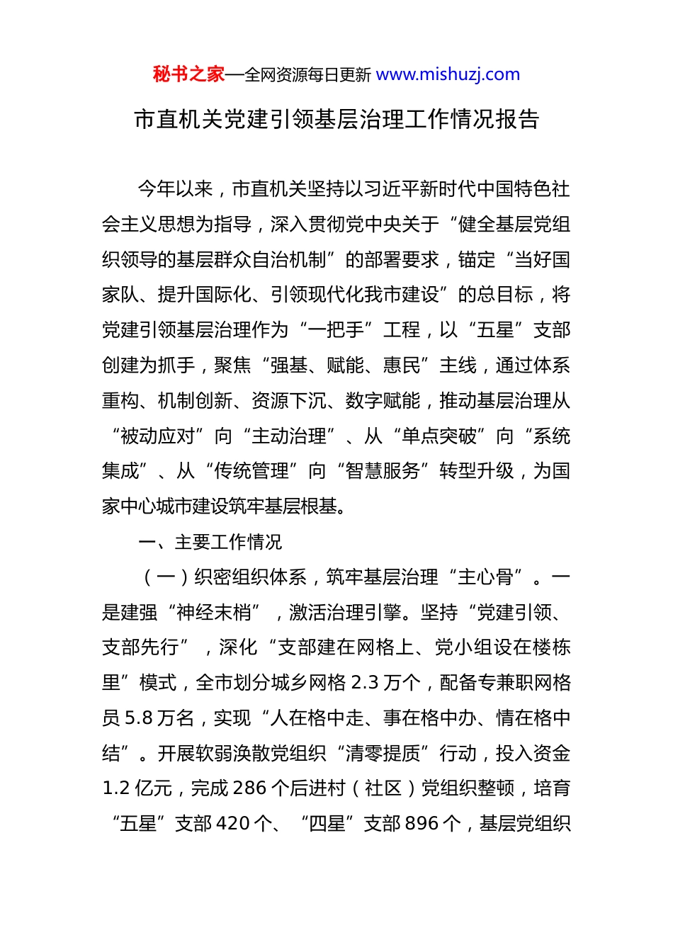 秘书之家—全网资源每日更新 www.mishuzj.com市直机关党建引领基层治理工作情况报告 今年以来,市直机关坚持以习近平新时代中国特色社会主义思想为指导,深入贯彻党中央关于“健全基层党组织领导的基层群众自治机制”的部署要求,锚定“当好国家队、提升国际化、引领现代化我市建设”的总目标,将党建引领基层治理作为“一把手”工程,以“五星”支部创建为抓手,聚焦“强基、赋能、惠民”主线,通过体系重构、机制创新、资源下沉、数字赋能,推动基层治理从“被动应对”向“主动治理”、从“单点突破”向“系统集成”、从“传统管理”向“智慧服务”转型升级,为国家中心城市建设筑牢基层根基。一、主要工作情况(一)织密组织体系,筑牢基层治理“主心骨”。一是建强“神经末梢”,激活治理引擎。坚持“党建引领、支部先行”,深化“支部建在网格上、党小组设在楼栋里”模式,全市划分城乡网格 2.3 万个,配备专兼职网格员 5.8 万名,实现“人在格中走、事在格中办、情在格中结”。开展软弱涣散党组织“清零提质”行动,投入资金1.2 亿元,完成 286 个后进村(社区)党组织整顿,培育“五星”支部 420 个、“四星”支部 896 个,基层党组织秘书之家—全网资源每日更新 www.mishuzj.com政治功能和组织功能显著增强。二是拓展覆盖领域,消除治理盲区。针对新经济组织、新社会组织、新就业群体党建薄弱环节,创新“行业党委+党建联盟”模式,成立快递物流、直播电商等行业党委 12 个,建立商圈市场、楼宇园区党组织 237 个,吸纳 2.3 万名新业态从业者加入“红色骑手”“快递先锋”队伍,推动党的工作向新兴领域全覆盖。三是建强骨干队伍,提升治理能力。实施“头雁领航”工程,选拔 1260 名“懂治理、善服务、群众公认”的党员担任村(社区)党组织书记,培育后备力量 5800 余名。通过“线上云课堂+线下实训营”,培训基层干部 3.2万人次,组织 180 名优秀书记赴先进地区跟班学习,基层队伍专业化水平持续提升。(二)创新治理机制,破解基层治理“老大难”。一是推行“党建+网格+N”联动机制,实现“小事不出网格、大事不出社区”。整合公安、民政、城管等 12 个部门资源,建立“网格吹哨、部门报到、分级处置”机制,网格员通过“随手拍”“民情直通车”收集问题,由街道(乡镇)“中枢平台”分类派单,部门限时办结。今年以来,累计受理群众诉求 89 万件,办结率 98.6%,化解矛盾纠纷 4.2 万起,信访量同比下降 18%。二是深化“居民议事+协商共治”模式,激发群众参与活力。推广“政好办·议秘书之家—全网资源每日更新 www.mishuzj.com事厅”“庭院党小组”等载体,在小区楼栋设立“议事角”“意见箱”,建立“居民点单、支部下单、党员接单、群众评单”服务闭环。“楼栋议事会”化解飞线充电、停车难等问题 3200 余件;“红色物业联盟”推动287 个无主管楼院实现规范化管理,群众满意度提升至92.3%。三是构建“数字赋能+智慧治理”体系,提升治理效能。依托“政好办”APP 搭建基层治理平台,集成政务服务、民生保障、应急管理等功能模块,实现“一网通办”事项 1365 项。经开区“智慧社区”通过人脸识别、智能监控等技术,预警高空抛物、消防隐患等风险 2.1 万次;登封市“乡村大脑”整合医保、养老等数据,为老年人提供“刷脸认证”“上门代办”服务,惠及群众 18 万人次。(三)聚焦民生福祉,彰显基层治理“温度感”。一是发展壮大集体经济,夯实共同富裕基础。实施“党建引领集体经济提质增效行动”,推广“党支部+合作社+农户”“土地流转+规模经营”等模式,盘活闲置厂房、荒山荒坡等资源,培育特色产业项目 1800 余个。中牟县“党支部领办合作社”带动 2.8 万农户增收,年集体经济收入超50 万元的村达 689 个,其中超千万元村 26 个。二是深化“党建+志愿服务”,擦亮为民服务底色。开展“万名党员秘书之家—全网资源每日更新 www.mishuzj.com进社区、我为群众办实事”活动,6.8 万名机关企事业单位党员到社区报到,组建“红色代办队”“银发巡逻队”等志愿服务队 3200 余支,开展助老扶弱、环境整治等活...