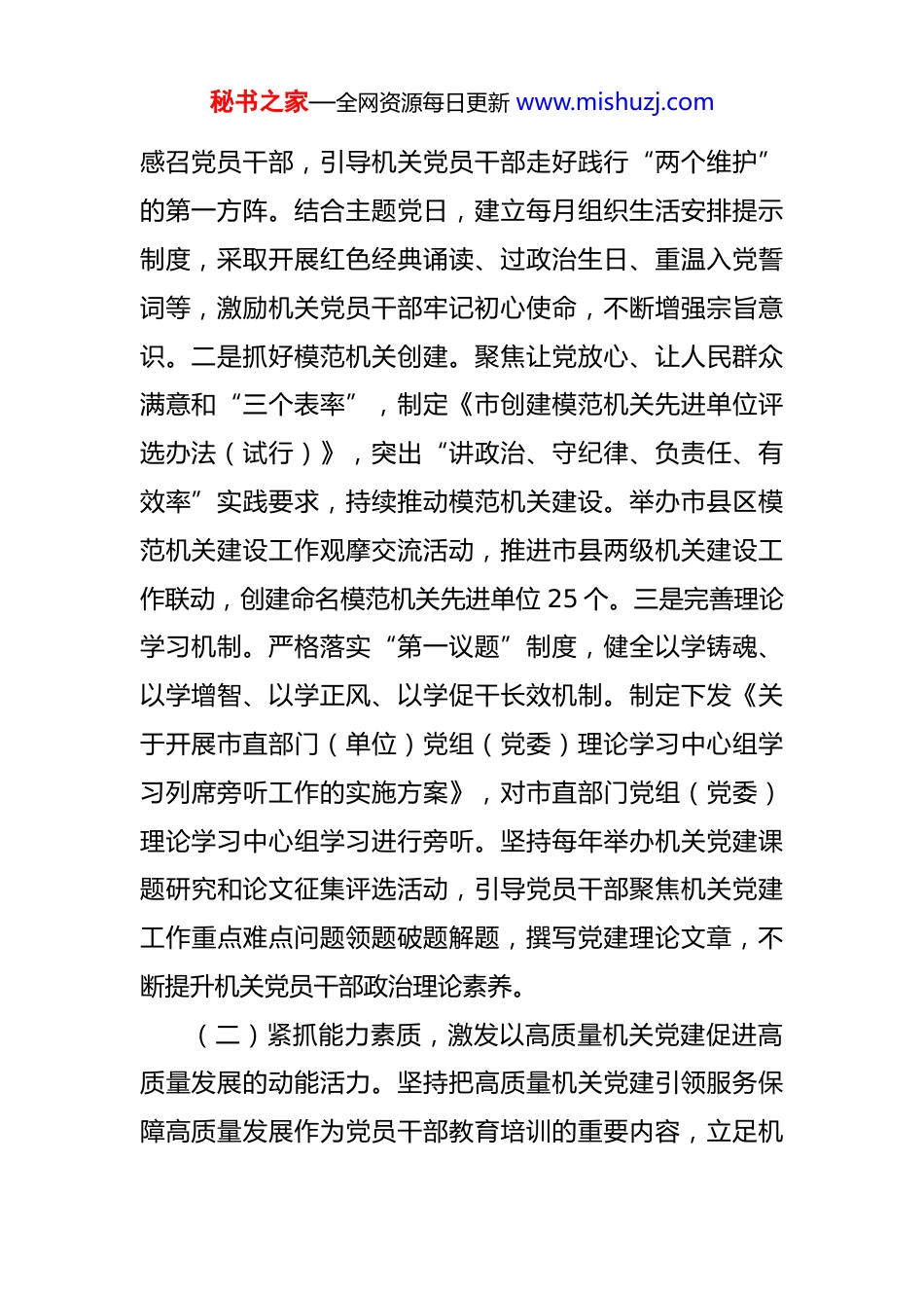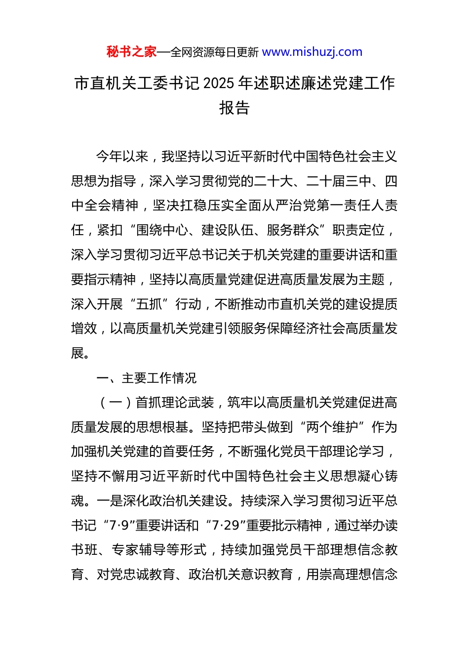 秘书之家—全网资源每日更新 www.mishuzj.com市直机关工委书记 2025 年述职述廉述党建工作报告 今年以来,我坚持以习近平新时代中国特色社会主义思想为指导,深入学习贯彻党的二十大、二十届三中、四中全会精神,坚决扛稳压实全面从严治党第一责任人责任,紧扣“围绕中心、建设队伍、服务群众”职责定位,深入学习贯彻习近平总书记关于机关党建的重要讲话和重要指示精神,坚持以高质量党建促进高质量发展为主题,深入开展“五抓”行动,不断推动市直机关党的建设提质增效,以高质量机关党建引领服务保障经济社会高质量发展。一、主要工作情况(一)首抓理论武装,筑牢以高质量机关党建促进高质量发展的思想根基。坚持把带头做到“两个维护”作为加强机关党建的首要任务,不断强化党员干部理论学习,坚持不懈用习近平新时代中国特色社会主义思想凝心铸魂。一是深化政治机关建设。持续深入学习贯彻习近平总书记“7·9”重要讲话和“7·29”重要批示精神,通过举办读书班、专家辅导等形式,持续加强党员干部理想信念教育、对党忠诚教育、政治机关意识教育,用崇高理想信念秘书之家—全网资源每日更新 www.mishuzj.com感召党员干部,引导机关党员干部走好践行“两个维护”的第一方阵。结合主题党日,建立每月组织生活安排提示制度,采取开展红色经典诵读、过政治生日、重温入党誓词等,激励机关党员干部牢记初心使命,不断增强宗旨意识。二是抓好模范机关创建。聚焦让党放心、让人民群众满意和“三个表率”,制定《市创建模范机关先进单位评选办法(试行)》,突出“讲政治、守纪律、负责任、有效率”实践要求,持续推动模范机关建设。举办市县区模范机关建设工作观摩交流活动,推进市县两级机关建设工作联动,创建命名模范机关先进单位 25 个。三是完善理论学习机制。严格落实“第一议题”制度,健全以学铸魂、以学增智、以学正风、以学促干长效机制。制定下发《关于开展市直部门(单位)党组(党委)理论学习中心组学习列席旁听工作的实施方案》,对市直部门党组(党委)理论学习中心组学习进行旁听。坚持每年举办机关党建课题研究和论文征集评选活动,引导党员干部聚焦机关党建工作重点难点问题领题破题解题,撰写党建理论文章,不断提升机关党员干部政治理论素养。(二)紧抓能力素质,激发以高质量机关党建促进高质量发展的动能活力。坚持把高质量机关党建引领服务保障高质量发展作为党员干部教育培训的重要内容,立足机秘书之家—全网资源每日更新 www.mishuzj.com关党员岗位特点和工作要求,不断加强各种新知识新技能的培训。一是加强年轻党员干部教育引领。实施机关青年理论学习提升工程,教育引导年轻党员干部修好“理论学习、党性锻炼、基层实践”三门课。开展“书香机关·悦读赋能”青年理论学习分享活动,组织 30 个优秀作品集中展示,并在“机关党建”微信公众号平台进行展播。坚持政治标准,全面推行新发展党员党支部、党总支、基层党委分级审查制度,建立新发展党员培养教育考察全过程纪实档案,举办市直机关党员发展对象培训班,加强党员发展对象培训。二是着力提升党务干部履职能力。坚持集中教育和日常教育相结合,加大对机关党委书记、专职副书记、机关纪委书记、新任专兼职党务干部培训力度。举办2025 年市直机关党组织书记培训班,并督促市直机关党组织分层分级举办党组织书记、党务干部、党员培训班 45期,培训 2600 多人次。三是健全完善党内激励关怀机制。制定机关党员定期走访慰问制度,在每年春节、“七一”等重大节日期间走访慰问受到党内功勋荣誉表彰的党员、生活困难党员、老党员,做好“光荣在党 50 年”纪念章颁发工作。注重把政治能力强、业务精、作风好的年轻干部安排到专职党务岗位上培养,市直机关 121 名专职党务干部全部为 35 岁左右的年轻干部。秘书之家—全网资源每日更新 www.mishuzj.com(三)狠抓基层基础,锻造以高质量机关党建促进高质量发展的战斗堡垒。牢固树立大抓基层大抓支部的鲜明导向,坚持补短板、强弱项与提质量、强功能并举,不断提高机关党组织的创造力、凝聚力、战斗力。一是规范优化党组织设置。持续调...