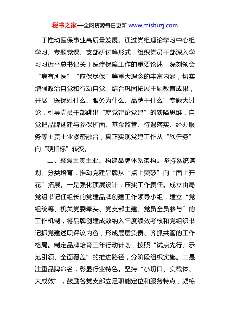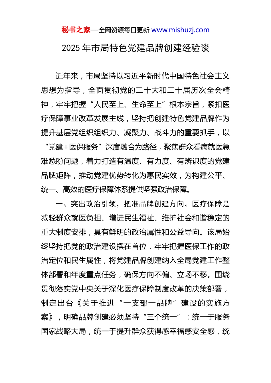 秘书之家—全网资源每日更新 www.mishuzj.com2025 年市局特色党建品牌创建经验谈 近年来,市局坚持以习近平新时代中国特色社会主义思想为指导,全面贯彻党的二十大和二十届历次全会精神,牢牢把握“人民至上、生命至上”根本宗旨,紧扣医疗保障事业改革发展主线,坚持把创建特色党建品牌作为提升基层党组织组织力、凝聚力、战斗力的重要抓手,以“党建+医保服务”深度融合为路径,聚焦群众看病就医急难愁盼问题,着力打造有温度、有力度、有辨识度的党建品牌矩阵,推动党建优势转化为惠民实效,为构建公平、统一、高效的医疗保障体系提供坚强政治保障。一、突出政治引领,把准品牌创建方向。医疗保障是减轻群众就医负担、增进民生福祉、维护社会和谐稳定的重大制度安排,具有鲜明的政治属性和公益导向。该局始终坚持把党的政治建设摆在首位,牢牢把握医保工作的政治定位和民生属性,将党建品牌创建纳入全局党建工作整体部署和年度重点任务,确保方向不偏、立场不移。围绕贯彻落实党中央关于深化医疗保障制度改革的决策部署,制定出台《关于推进“一支部一品牌”建设的实施方案》,明确品牌创建必须坚持“三个统一”:统一于服务国家战略大局,统一于提升群众获得感幸福感安全感,统秘书之家—全网资源每日更新 www.mishuzj.com一于推动医保事业高质量发展。通过党组理论学习中心组学习、专题党课、支部研讨等形式,组织党员干部深入学习习近平总书记关于医疗保障工作的重要论述,深刻领会“病有所医”“应保尽保”等重大理念的丰富内涵,切实增强政治自觉和行动自觉。结合巩固拓展主题教育成果,开展“医保姓什么、服务为什么、品牌干什么”专题大讨论,引导党员干部跳出“就党建论党建”的狭隘思维,自觉把品牌创建与参保扩面、基金监管、待遇落实、经办服务等主责主业紧密融合,真正实现党建工作从“软任务”向“硬指标”转变。二、聚焦主责主业,构建品牌体系架构。坚持系统谋划、分类培育,推动党建品牌从“点上突破”向“面上开花”拓展。一是强化顶层设计,压实工作责任。成立由局党组书记任组长的党建品牌创建工作领导小组,建立“党组统筹、机关党委牵头、党支部主建、党员全员参与”的工作机制,将品牌创建成效纳入年度绩效考核和党组织书记抓党建述职评议内容,形成层层负责、齐抓共管的工作格局。制定品牌培育三年行动计划,按照“试点先行、示范引领、全面覆盖”的推进路径,分阶段组织实施。二是注重品牌命名,彰显行业特色。坚持“小切口、实载体、大成效”,鼓励各党支部立足职能定位和服务特点,凝练秘书之家—全网资源每日更新 www.mishuzj.com品牌名称、提炼核心理念。如医保经办党支部打造“医保暖心办”品牌,突出便捷高效、温暖贴心的服务追求;基金监管党支部创建“守护医保基金安全卫士”品牌,强化依法履职、严查欺诈骗保的使命担当;政策法规党支部推出“医保政策直通车”品牌,致力于政策宣传普及、群众精准理解。目前,全局 8 个党支部均创建了具有鲜明特色的党建品牌,实现全覆盖、全参与。三是丰富实践载体,增强品牌活力。依托“三会一课”、主题党日等组织生活,常态化开展“党员亮身份、岗位争先锋”活动,在服务窗口设立“党员示范岗”,在稽核一线组建“党员突击队”,在政策宣讲中成立“党员志愿服务队”,推动党员在重点工作、重大任务中当先锋、作表率。组织开展“我身边的品牌故事”分享会,讲述一线党员在医保征缴、异地结算、困难群众帮扶中的感人事迹,用身边事教育身边人,持续激发干事创业热情。三、坚持问题导向,推动品牌落地见效。党建品牌的成效最终体现在解决问题、服务群众上。该局始终坚持把群众满意作为衡量品牌创建成效的根本标准,聚焦医保领域群众反映强烈的堵点难点问题,精准施策、靶向发力。一方面,着力提升经办服务温度。针对老年人、残疾人等特殊群体“不会办”“不便办”问题,经办党组织以“医秘书之家—全网资源每日更新 www.mishuzj.com保暖心办”品牌为抓手,推行“帮办代办”“上门服务”“预约办理”等便民举措,组建由 32 名党员组成的“医保帮办小分队”,深入社区、乡村为行动不便群众办理参保登...