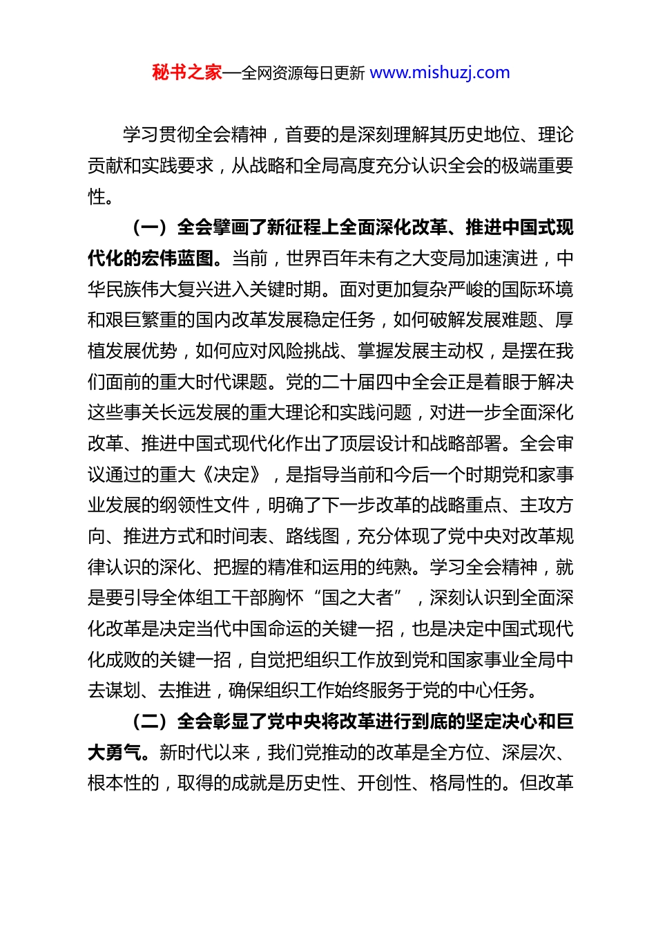 秘书之家—全网资源每日更新 www.mishuzj.com组织部部长在机关干部会上关于党的二十届四中全会精神的宣讲稿同志们:今天,我们召开部机关全体干部大会,主要任务是深入学习领会党的二十届四中全会精神,按照党中央统一部署和省委(市委)工作要求,对组织部门抓好全会精神的学习宣传和贯彻落实进行再动员、再部署、再深化。党的二十届四中全会,是在我国迈上全面建设社会主义现代化国家新征程、向第二个百年奋斗目标进军的关键时刻召开的一次十分重要的会议。全会系统总结新时代以来全面深化改革取得的伟大成就,深刻阐述进一步全面深化改革、推进中国式现代化的根本保证、指导思想、基本原则和重大举措,对持续深化党的组织工作改革创新、为强国建设、民族复兴伟业提供坚强组织保证具有重大而深远的意义。组织部门作为管党治党的重要职能部门,必须在学习贯彻全会精神上站位更高、认识更深、要求更严、行动更自觉,切实担负起在推进中国式现代化实践中肩负的重大责任。下面,我结合自己的学习思考,就深刻领会和贯彻落实全会精神,讲几点意见。一、提高政治站位,深刻认识党的二十届四中全会的重大里程碑意义,切实增强学习贯彻的政治自觉、思想自觉和行动自觉秘书之家—全网资源每日更新 www.mishuzj.com学习贯彻全会精神,首要的是深刻理解其历史地位、理论贡献和实践要求,从战略和全局高度充分认识全会的极端重要性。(一)全会擘画了新征程上全面深化改革、推进中国式现代化的宏伟蓝图。当前,世界百年未有之大变局加速演进,中华民族伟大复兴进入关键时期。面对更加复杂严峻的国际环境和艰巨繁重的国内改革发展稳定任务,如何破解发展难题、厚植发展优势,如何应对风险挑战、掌握发展主动权,是摆在我们面前的重大时代课题。党的二十届四中全会正是着眼于解决这些事关长远发展的重大理论和实践问题,对进一步全面深化改革、推进中国式现代化作出了顶层设计和战略部署。全会审议通过的重大《决定》,是指导当前和今后一个时期党和家事业发展的纲领性文件,明确了下一步改革的战略重点、主攻方向、推进方式和时间表、路线图,充分体现了党中央对改革规律认识的深化、把握的精准和运用的纯熟。学习全会精神,就是要引导全体组工干部胸怀“国之大者”,深刻认识到全面深化改革是决定当代中国命运的关键一招,也是决定中国式现代化成败的关键一招,自觉把组织工作放到党和国家事业全局中去谋划、去推进,确保组织工作始终服务于党的中心任务。(二)全会彰显了党中央将改革进行到底的坚定决心和巨大勇气。新时代以来,我们党推动的改革是全方位、深层次、根本性的,取得的成就是历史性、开创性、格局性的。但改革秘书之家—全网资源每日更新 www.mishuzj.com越深入,矛盾越凸显,触及的利益关系越复杂。党的二十届四中全会向全党全国乃至全世界释放了清晰而强烈的信号:改革开放只有进行时,没有完成时。党中央以巨大的政治勇气和智慧,瞄准制约高质量发展的堵点淤点难点,聚焦构建高水平社会主义市场经济体制、建设更高水平开放型经济新体制、推动文化繁荣发展、促进共同富裕、建设美丽中国、维护国家安全和社会稳定等重点领域,部署了一系列具有前瞻性、战略性、针对性的重大改革举措。这充分展现了我们党将改革进行到底的坚定意志,展现了中国特色社会主义制度的强大生命力和巨大优越性。组织部门学习全会精神,就是要从中汲取攻坚克难的智慧和力量,发扬刀刃向内的自我革命精神,勇于打破思维定势和路径依赖,以更大魄力、更实举措推动组织工作领域各项改革任务落地生根,不断破解组织工作面临的重点难点问题。(三)全会对健全全面从严治党体系、深入推进新时代党的建设新的伟大工程提出了新的更高要求。办好中国的事情,关键在党。推进中国式现代化,关键在党要管党、全面从严治党。全会对坚持和加强党的全面领导、健全党的领导制度体系、完善党自我革命制度规范体系等作出了新的部署,这是新时代党的建设总要求在新征程上的具体化和深化。全会强调要健全总揽全局、协调各方的党的领导制度体系,完善党中央重大决策部署落实机制,确保全党在政治立场、政治方向、政治原...