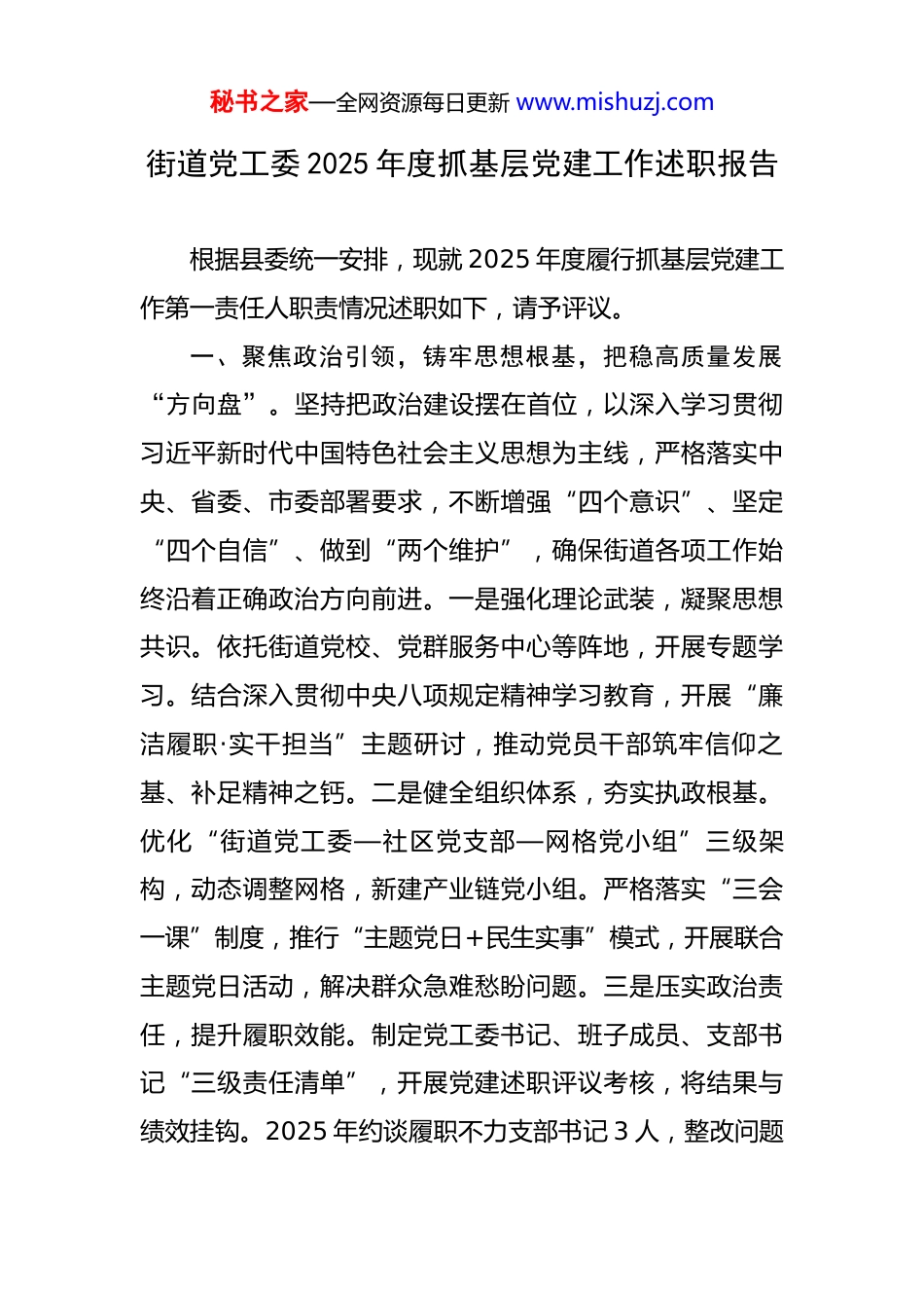 秘书之家—全网资源每日更新 www.mishuzj.com街道党工委 2025 年度抓基层党建工作述职报告 根据县委统一安排,现就 2025 年度履行抓基层党建工作第一责任人职责情况述职如下,请予评议。一、聚焦政治引领,铸牢思想根基,把稳高质量发展“方向盘”。坚持把政治建设摆在首位,以深入学习贯彻习近平新时代中国特色社会主义思想为主线,严格落实中央、省委、市委部署要求,不断增强“四个意识”、坚定“四个自信”、做到“两个维护”,确保街道各项工作始终沿着正确政治方向前进。一是强化理论武装,凝聚思想共识。依托街道党校、党群服务中心等阵地,开展专题学习。结合深入贯彻中央八项规定精神学习教育,开展“廉洁履职·实干担当”主题研讨,推动党员干部筑牢信仰之基、补足精神之钙。二是健全组织体系,夯实执政根基。优化“街道党工委—社区党支部—网格党小组”三级架构,动态调整网格,新建产业链党小组。严格落实“三会一课”制度,推行“主题党日+民生实事”模式,开展联合主题党日活动,解决群众急难愁盼问题。三是压实政治责任,提升履职效能。制定党工委书记、班子成员、支部书记“三级责任清单”,开展党建述职评议考核,将结果与绩效挂钩。2025 年约谈履职不力支部书记 3 人,整改问题秘书之家—全网资源每日更新 www.mishuzj.com12 项,推动党建责任从“软指标”变为“硬约束”。二、聚焦队伍锻造,激发内生动力,打造乡村振兴“生力军”。围绕“强基固本”目标,坚持抓基层、打基础,突出政治功能和组织功能,着力提升基层党组织组织力,把基层党组织建设成为宣传党的主张、贯彻党的决定、领导基层治理、团结动员群众、推动改革发展的坚强战斗堡垒。一是建强头雁队伍,提升领富能力。实施“能人治村”计划,选拔 6 名致富能手进入社区“两委”班子,组织赴省外学习产业治理经验。开展“红旗擂台赛”,评选优秀支书,推动后进村转化提升。二是优化党员结构,注入新鲜血液。注重从青年农民、创业能手发展党员,推行“党员积分制”,将参与治理、志愿服务等纳入考评,积分结果与评优挂钩,激发党员先锋意识。三是强化实战练兵,提升服务本领。依托街道党校开展乡村振兴、基层治理专题培训。组建“党员突击队”参与防汛救灾、矛盾调解等急难险重任务,解决群众实际困难。三、聚焦基层治理,创新服务模式,构建共建共享“新格局”。坚持把服务群众、造福群众作为基层治理的出发点和落脚点,积极推动社会治理重心向基层下移,健全党组织领导下的自治、法治、德治相结合的基层治理体系,不断提升人民群众的获得感、幸福感、安全感。一是秘书之家—全网资源每日更新 www.mishuzj.com深化“党建+网格”治理。拓展“支部建在网格上”机制,将社区网格与党小组绑定,实现“小事不出网格、大事不出社区”。通过网格收集民意,相关做法获市级推广。二是推行“红色物业”,提升小区品质。在小区试点“社区+物业”交叉任职,解决停车难、充电乱等问题。设立“党群议事厅”,召开院坝会,化解邻里纠纷。三是做实“双报到”机制,凝聚共建合力。推动机关企事业单位、在职党员到社区报到,落实“群众点单、社区派单、党员接单”模式,办结微心愿,开展普法宣传。四、聚焦产业发展,推动强村富民,点燃集体经济“新引擎”。坚持党建引领发展,将党的政治优势、组织优势转化为发展优势,围绕乡村振兴战略,大力发展壮大村级集体经济,促进农民农村共同富裕,以高质量党建引领高质量发展。一是做强特色产业,拓宽增收渠道。发挥党支部引领作用。创办“联动超市”“千旗劳务公司”。二是盘活闲置资源,增强发展后劲。清理 X 社区等闲置资产,通过租赁、参股方式引入农旅项目。探索“资源开发型+服务创收型”双轮驱动模式,推动集体经济多元化发展。三是深化联建共建,促进区域协同。与流域乡镇建立党建联建机制,联合举办空心李采摘节、旅游推介会等活动,吸引游客,带动农特产品销售。秘书之家—全网资源每日更新 www.mishuzj.com虽然取得了一些成绩,但仍存在一些问题不足,主要表现在:一是理论联系实际深度不够。部分干部学用脱节,推动乡村振兴思路不清,如数字技术...