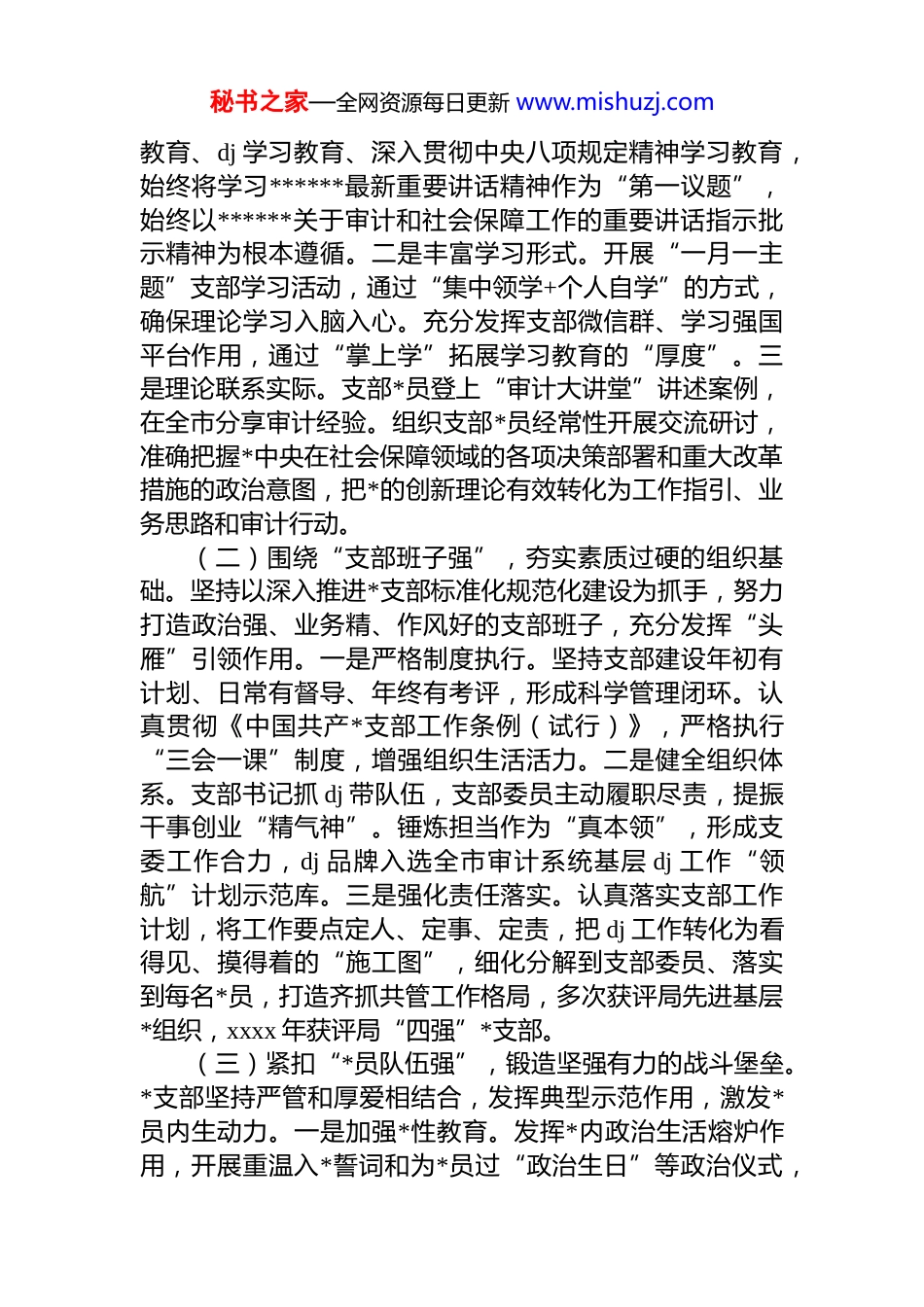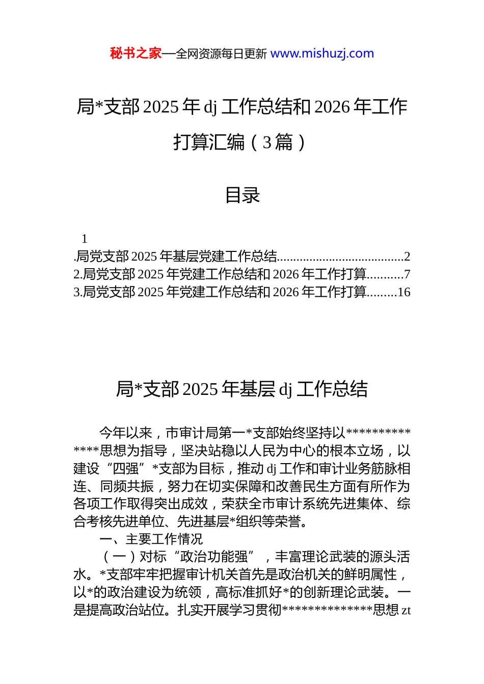 秘书之家—全网资源每日更新 www.mishuzj.com局*支部 2025 年 dj 工作总结和 2026 年工作打算汇编(3 篇)目录1.局党支部 2025 年基层党建工作总结.......................................22.局党支部 2025 年党建工作总结和 2026 年工作打算...........73.局党支部 2025 年党建工作总结和 2026 年工作打算.........16局*支部 2025 年基层 dj 工作总结今年以来,市审计局第一*支部始终坚持以**************思想为指导,坚决站稳以人民为中心的根本立场,以建设“四强”*支部为目标,推动 dj 工作和审计业务筋脉相连、同频共振,努力在切实保障和改善民生方面有所作为各项工作取得突出成效,荣获全市审计系统先进集体、综合考核先进单位、先进基层*组织等荣誉。一、主要工作情况(一)对标“政治功能强”,丰富理论武装的源头活水。*支部牢牢把握审计机关首先是政治机关的鲜明属性,以*的政治建设为统领,高标准抓好*的创新理论武装。一是提高政治站位。扎实开展学习贯彻**************思想 zt秘书之家—全网资源每日更新 www.mishuzj.com教育、dj 学习教育、深入贯彻中央八项规定精神学习教育,始终将学习******最新重要讲话精神作为“第一议题”,始终以******关于审计和社会保障工作的重要讲话指示批示精神为根本遵循。二是丰富学习形式。开展“一月一主题”支部学习活动,通过“集中领学+个人自学”的方式,确保理论学习入脑入心。充分发挥支部微信群、学习强国平台作用,通过“掌上学”拓展学习教育的“厚度”。三是理论联系实际。支部*员登上“审计大讲堂”讲述案例,在全市分享审计经验。组织支部*员经常性开展交流研讨,准确把握*中央在社会保障领域的各项决策部署和重大改革措施的政治意图,把*的创新理论有效转化为工作指引、业务思路和审计行动。(二)围绕“支部班子强”,夯实素质过硬的组织基础。坚持以深入推进*支部标准化规范化建设为抓手,努力打造政治强、业务精、作风好的支部班子,充分发挥“头雁”引领作用。一是严格制度执行。坚持支部建设年初有计划、日常有督导、年终有考评,形成科学管理闭环。认真贯彻《中国共产*支部工作条例(试行)》,严格执行“三会一课”制度,增强组织生活活力。二是健全组织体系。支部书记抓 dj 带队伍,支部委员主动履职尽责,提振干事创业“精气神”。锤炼担当作为“真本领”,形成支委工作合力,dj 品牌入选全市审计系统基层 dj 工作“领航”计划示范库。三是强化责任落实。认真落实支部工作计划,将工作要点定人、定事、定责,把 dj 工作转化为看得见、摸得着的“施工图”,细化分解到支部委员、落实到每名*员,打造齐抓共管工作格局,多次获评局先进基层*组织,xxxx 年获评局“四强”*支部。(三)紧扣“*员队伍强”,锻造坚强有力的战斗堡垒。*支部坚持严管和厚爱相结合,发挥典型示范作用,激发*员内生动力。一是加强*性教育。发挥*内政治生活熔炉作用,开展重温入*誓词和为*员过“政治生日”等政治仪式,秘书之家—全网资源每日更新 www.mishuzj.com组织参观“山河安澜-淠史杭灌区主题展”、赴潜山市梅寨村开展“就业大篷车进乡村”活动,与合肥市芜湖路街道联合开展“争当改革先锋勇作实干表率”走基层等多种形式主题*日。用好*的制胜法宝,使组织生活会“辣味”足,引导支部*员砥砺初心使命。二是守牢廉洁底线。社保审计使命光荣、责任重大,支部要求*员必须以实际行动筑牢廉洁审计的坚固防线。每逢重要节点,在微信群发出廉政提醒。支部书记进行审前廉洁谈话,强调审计“四严禁”工作要求和“八不准”工作纪律。定期通报违纪违法典型案例,在深入贯彻中央八项规定精神学习教育期间开展警示教育 x 次,以案释纪明纪,教育支部*员时刻自重自市自警自励。三是激励先锋模范。严格落实民主集中制,涉及评优评先等重要事项坚持集体决策。支部 x 名同志被人社部、审计署授予“全国审计系统先进工作者”,多名同志被评为局机关优秀主审和优秀共产*员,激励支部*员对标先进找差距、当先锋。结合支部*员年龄、专业和自身特点,给青年*员压担子,发挥老同志“传帮带”作用,促进青年*...
