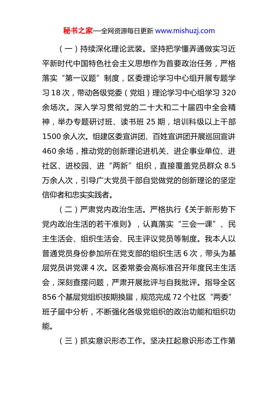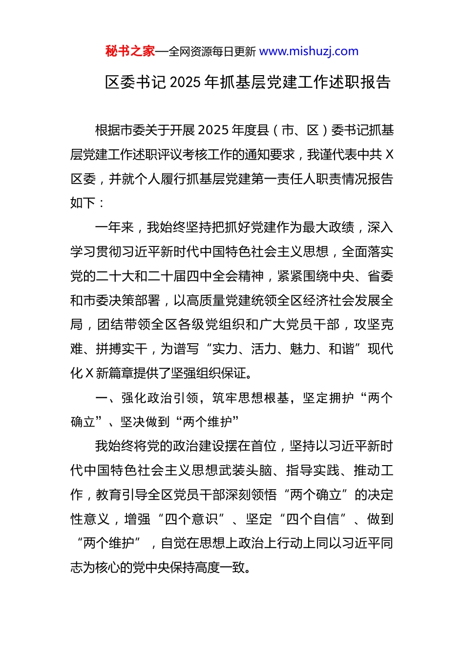 秘书之家—全网资源每日更新 www.mishuzj.com区委书记 2025 年抓基层党建工作述职报告 根据市委关于开展 2025 年度县(市、区)委书记抓基层党建工作述职评议考核工作的通知要求,我谨代表中共 X区委,并就个人履行抓基层党建第一责任人职责情况报告如下:一年来,我始终坚持把抓好党建作为最大政绩,深入学习贯彻习近平新时代中国特色社会主义思想,全面落实党的二十大和二十届四中全会精神,紧紧围绕中央、省委和市委决策部署,以高质量党建统领全区经济社会发展全局,团结带领全区各级党组织和广大党员干部,攻坚克难、拼搏实干,为谱写“实力、活力、魅力、和谐”现代化 X 新篇章提供了坚强组织保证。一、强化政治引领,筑牢思想根基,坚定拥护“两个确立”、坚决做到“两个维护”我始终将党的政治建设摆在首位,坚持以习近平新时代中国特色社会主义思想武装头脑、指导实践、推动工作,教育引导全区党员干部深刻领悟“两个确立”的决定性意义,增强“四个意识”、坚定“四个自信”、做到“两个维护”,自觉在思想上政治上行动上同以习近平同志为核心的党中央保持高度一致。秘书之家—全网资源每日更新 www.mishuzj.com(一)持续深化理论武装。坚持把学懂弄通做实习近平新时代中国特色社会主义思想作为首要政治任务,严格落实“第一议题”制度,区委理论学习中心组开展专题学习 18 次,带动各级党委(党组)理论学习中心组学习 320余场次。深入学习贯彻党的二十大和二十届四中全会精神,举办专题研讨班、读书班 25 期,培训科级以上干部1500 余人次。组建区委宣讲团、百姓宣讲团开展巡回宣讲460 余场,推动党的创新理论进机关、进企事业单位、进社区、进校园、进“两新”组织,直接覆盖党员群众 8.5万余人次,引导广大党员干部自觉做党的创新理论的坚定信仰者和忠实实践者。(二)严肃党内政治生活。严格执行《关于新形势下党内政治生活的若干准则》,认真落实“三会一课”、民主生活会、组织生活会、民主评议党员等制度。我本人以普通党员身份参加所在党支部的组织生活 6 次,带头为基层党员讲党课 4 次。区委常委会高标准召开年度民主生活会,深刻查摆问题,严肃开展批评与自我批评。指导全区856 个基层党组织按期换届,规范完成 72 个社区“两委”班子届中分析,不断强化各级党组织的政治功能和组织功能。(三)抓实意识形态工作。坚决扛起意识形态工作第秘书之家—全网资源每日更新 www.mishuzj.com一责任人责任,主持召开区委常委会会议、意识形态工作领导小组会议专题研究意识形态工作 6 次。健全意识形态领域风险分析研判机制,加强对各类阵地的管理,稳妥处置网络舆情 130 余起。围绕区委中心工作,组织开展系列主题宣传报道,在中央和省级主流媒体刊发稿件 320 余篇,持续讲好 X 故事,传播 X 声音。牢牢掌握意识形态工作领导权、主动权、话语权,确保全区意识形态领域安全可控、向上向好。二、夯实基层基础,建强战斗堡垒,全面提升基层党组织组织力我牢固树立大抓基层的鲜明导向,坚持人往基层走、钱往基层投、政策往基层倾斜,着力解决基层党建“最后一公里”问题,推动基层党组织全面进步、全面过硬。(一)持续推进基层党建“三化”建设。在巩固“五化”工程成果基础上,全面落实基层党建标准化、规范化、信息化“三化”建设要求。在组织设置方面,优化调整网格党支部 89 个,在产业链、项目一线新建党支部 12个。在领导班子建设方面,选优配强社区党组织书记 15名,对 32 个软弱涣散基层党组织进行精准整顿,目前均已转化提升。在经费保障方面,2025 年区级财政投入基层党建工作经费达 1.35 亿元,社区党建工作经费稳定在 5 万元秘书之家—全网资源每日更新 www.mishuzj.com以上/年,服务群众专项经费提升至 25 万元以上/年,有力保障了基层有序运转。在活动场所方面,通过国资调剂、改造提升等方式,新增和改善社区活动场所 8 处,全区社区办公服务场所面积 200 平方米以下的问题已全部解决。(二)深入实施“网格化”治理工程。深化“社区+网格管理”模式,将全区科学划分为 356 个综合网格,整合党...