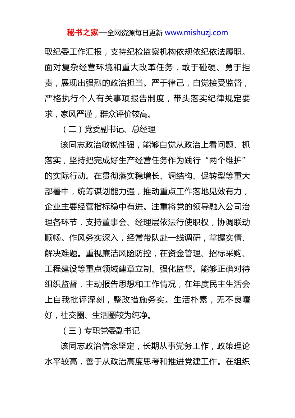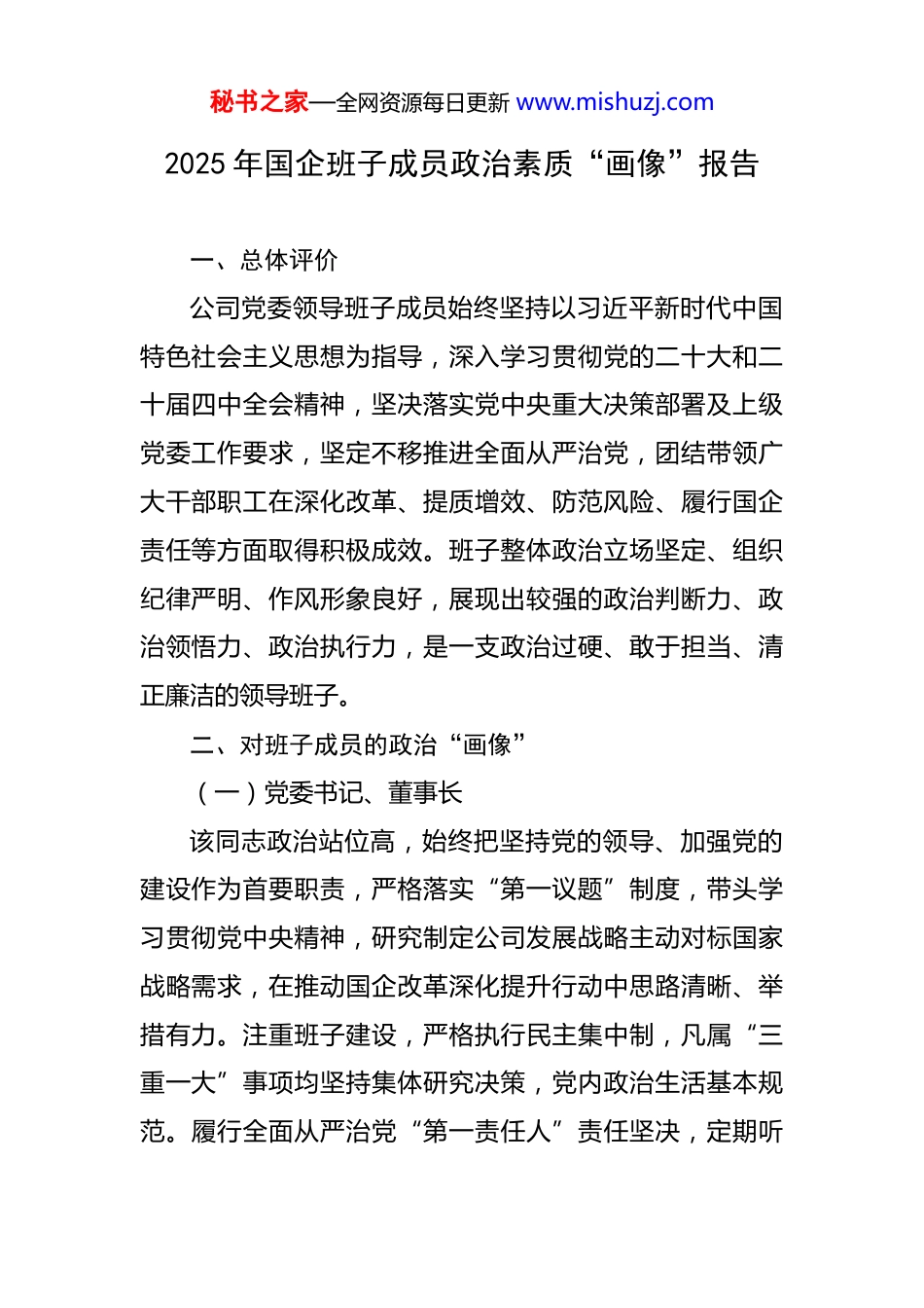 秘书之家—全网资源每日更新 www.mishuzj.com2025 年国企班子成员政治素质“画像”报告 一、总体评价公司党委领导班子成员始终坚持以习近平新时代中国特色社会主义思想为指导,深入学习贯彻党的二十大和二十届四中全会精神,坚决落实党中央重大决策部署及上级党委工作要求,坚定不移推进全面从严治党,团结带领广大干部职工在深化改革、提质增效、防范风险、履行国企责任等方面取得积极成效。班子整体政治立场坚定、组织纪律严明、作风形象良好,展现出较强的政治判断力、政治领悟力、政治执行力,是一支政治过硬、敢于担当、清正廉洁的领导班子。二、对班子成员的政治“画像”(一)党委书记、董事长该同志政治站位高,始终把坚持党的领导、加强党的建设作为首要职责,严格落实“第一议题”制度,带头学习贯彻党中央精神,研究制定公司发展战略主动对标国家战略需求,在推动国企改革深化提升行动中思路清晰、举措有力。注重班子建设,严格执行民主集中制,凡属“三重一大”事项均坚持集体研究决策,党内政治生活基本规范。履行全面从严治党“第一责任人”责任坚决,定期听秘书之家—全网资源每日更新 www.mishuzj.com取纪委工作汇报,支持纪检监察机构依规依纪依法履职。面对复杂经营环境和重大改革任务,敢于碰硬、勇于担责,展现出强烈的政治担当。严于律己,自觉接受监督,严格执行个人有关事项报告制度,带头落实纪律规定要求,家风严谨,群众评价较高。(二)党委副书记、总经理该同志政治敏锐性强,能够自觉从政治上看问题、抓落实,坚持把完成好生产经营任务作为践行“两个维护”的实际行动。在贯彻落实稳增长、调结构、促转型等重大部署中,统筹谋划能力强,推动重点工作落地见效有力,企业主要经营指标稳中有进。注重将党的领导融入公司治理各环节,支持董事会、经理层依法行使职权,协调联动顺畅。作风务实深入,经常带队赴一线调研,掌握实情、解决难题。重视廉洁风险防控,在资金管理、招标采购、工程建设等重点领域建章立制、强化监督。能够正确对待组织监督,主动报告思想和工作情况,在年度民主生活会上自我批评深刻,整改措施务实。生活朴素,无不良嗜好,社交圈、生活圈较为纯净。(三)专职党委副书记该同志政治信念坚定,长期从事党务工作,政策理论水平较高,善于从政治高度思考和推进党建工作。在组织秘书之家—全网资源每日更新 www.mishuzj.com推动党的创新理论武装、主题教育开展、基层组织建设等方面发挥重要作用,党建工作基础不断夯实。分管意识形态和宣传思想工作期间,阵地管理严格,舆论引导有力,未发生重大舆情风险。关心干部职工思想动态,注重人文关怀,推动解决基层实际困难,群众工作能力较强。在干部推荐使用中坚持原则、公道正派,严格执行选人用人制度规定。能够严格执行廉洁自律各项要求,在党建活动经费使用、评优评先等工作中坚持公开透明,自觉抵制不正之风,体现了一名党务干部应有的政治品格。(四)纪委书记该同志政治立场坚定,忠诚履行监督专责,始终聚焦“两个维护”强化政治监督,紧盯党中央重大决策部署落实情况开展专项检查,发现问题及时纠偏。在协助党委推进全面从严治党、加强党风廉政建设和反腐败斗争中主动作为,组织开展廉洁教育、廉政谈话、警示教育常态化,营造了良好氛围。敢于较真碰硬,依规依纪依法查处违纪问题线索,严肃执纪问责。严守纪检监察权力边界,坚持实事求是原则,办案程序规范,证据扎实。自觉接受最严格的约束和监督,严格执行回避制度、保密纪律,从未利用职权谋取私利。注重提升队伍专业化水平,带头加强业务学习,推动纪检监察工作规范化法治化正规化建设。秘书之家—全网资源每日更新 www.mishuzj.com(五)副总经理(分管投资与规划)该同志政治意识较强,能够坚持从服务国家战略和企业发展大局出发谋划投资项目,在推动重大基础设施建设、新兴产业布局中积极作为,体现出较强的大局观念。在项目决策中注重合规性审查和风险评估,严格落实前置程序,未发生重大投资失误。执行纪律规定精神严格,出差调研轻车简从,无超标接待情况。在与外部合作单位交往中保持清醒头脑,坚持公私分明,未...