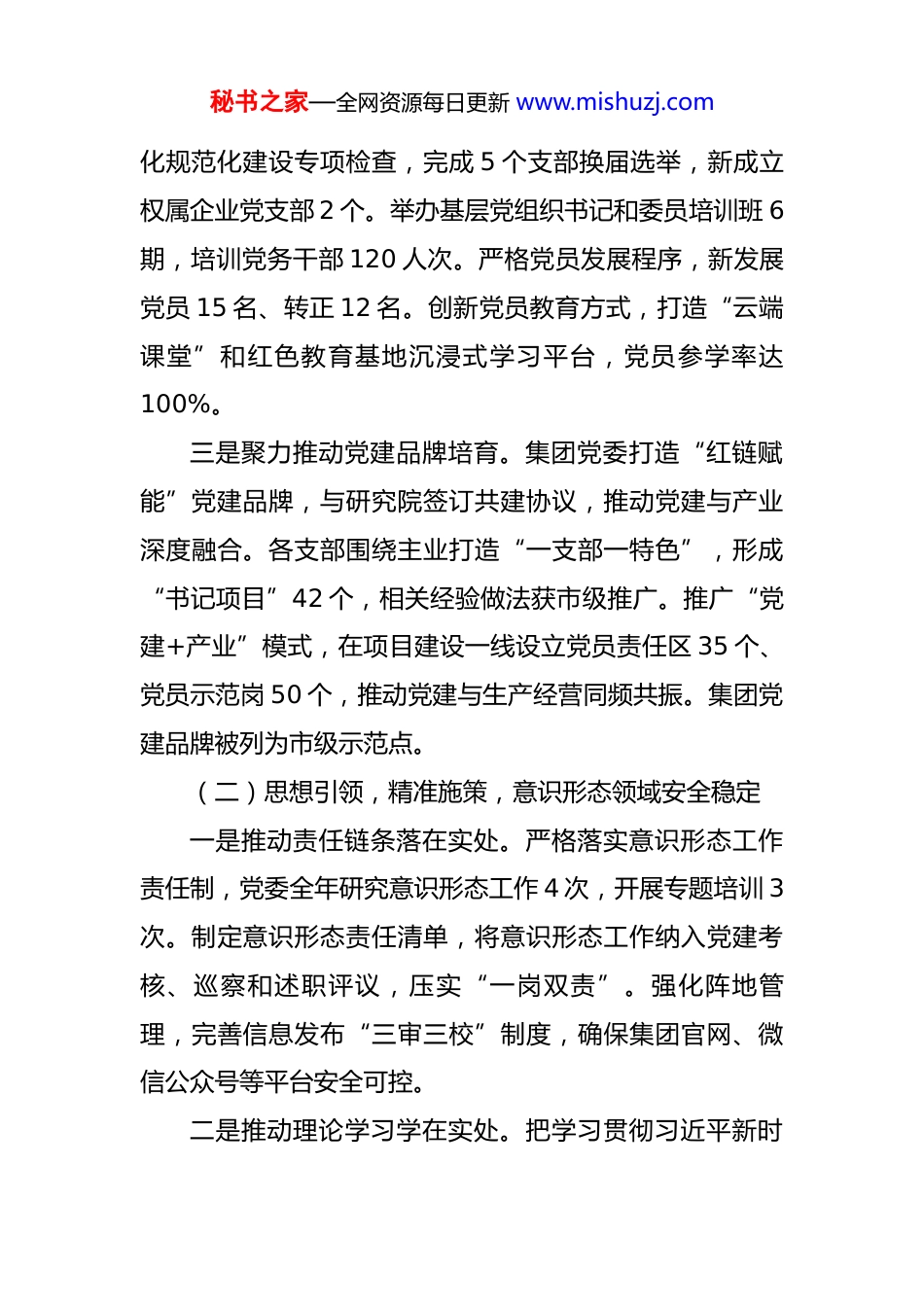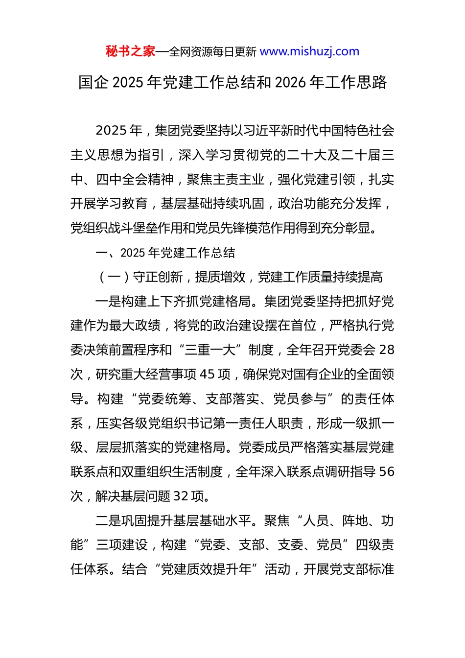 秘书之家—全网资源每日更新 www.mishuzj.com国企 2025 年党建工作总结和 2026 年工作思路 2025 年,集团党委坚持以习近平新时代中国特色社会主义思想为指引,深入学习贯彻党的二十大及二十届三中、四中全会精神,聚焦主责主业,强化党建引领,扎实开展学习教育,基层基础持续巩固,政治功能充分发挥,党组织战斗堡垒作用和党员先锋模范作用得到充分彰显。一、2025 年党建工作总结(一)守正创新,提质增效,党建工作质量持续提高一是构建上下齐抓党建格局。集团党委坚持把抓好党建作为最大政绩,将党的政治建设摆在首位,严格执行党委决策前置程序和“三重一大”制度,全年召开党委会 28次,研究重大经营事项 45 项,确保党对国有企业的全面领导。构建“党委统筹、支部落实、党员参与”的责任体系,压实各级党组织书记第一责任人职责,形成一级抓一级、层层抓落实的党建格局。党委成员严格落实基层党建联系点和双重组织生活制度,全年深入联系点调研指导 56次,解决基层问题 32 项。二是巩固提升基层基础水平。聚焦“人员、阵地、功能”三项建设,构建“党委、支部、支委、党员”四级责任体系。结合“党建质效提升年”活动,开展党支部标准秘书之家—全网资源每日更新 www.mishuzj.com化规范化建设专项检查,完成 5 个支部换届选举,新成立权属企业党支部 2 个。举办基层党组织书记和委员培训班 6期,培训党务干部 120 人次。严格党员发展程序,新发展党员 15 名、转正 12 名。创新党员教育方式,打造“云端课堂”和红色教育基地沉浸式学习平台,党员参学率达100%。三是聚力推动党建品牌培育。集团党委打造“红链赋能”党建品牌,与研究院签订共建协议,推动党建与产业深度融合。各支部围绕主业打造“一支部一特色”,形成“书记项目”42 个,相关经验做法获市级推广。推广“党建+产业”模式,在项目建设一线设立党员责任区 35 个、党员示范岗 50 个,推动党建与生产经营同频共振。集团党建品牌被列为市级示范点。(二)思想引领,精准施策,意识形态领域安全稳定一是推动责任链条落在实处。严格落实意识形态工作责任制,党委全年研究意识形态工作 4 次,开展专题培训 3次。制定意识形态责任清单,将意识形态工作纳入党建考核、巡察和述职评议,压实“一岗双责”。强化阵地管理,完善信息发布“三审三校”制度,确保集团官网、微信公众号等平台安全可控。二是推动理论学习学在实处。把学习贯彻习近平新时秘书之家—全网资源每日更新 www.mishuzj.com代中国特色社会主义思想作为主线,落实中心组学习研讨机制,全年召开党委中心组学习会 16 次,专题研讨 12次。坚持分层分类,针对在岗党员,采取集中学和自主学相结合的方式,针对离休党员,采取送学上门方式,让党员都动起来、学起来。基层党组织以“三会一课”为主抓手,用好“学习强国”学习平台、智慧党建平台、固定学习日、主题党日等载体,推动学习教育常态化制度化。三是推动意识形态严在实处。组织意识形态、网络意识形态分析研判,常态督导、动态排查,加强重要节点和敏感时期的舆论研判和监管。落实阵地管理备案制度,强化过程监督管理。严格规范程序,优化信息发布、审核、把关流程,把好集团网站、微信公众号等意识形态主阵地,做好信息平台日常监管。(三)多方联动,齐抓共管,全面从严治党纵深发展一是画好“同心圆”,践行国企担当。积极履行国企社会责任,围绕服务国家战略,集团承接重大基础设施项目,总投资额超百亿元。发挥产业优势,助力乡村振兴,投入帮扶资金 800 万元。打造“零碳服务区”,推广光伏清洁能源,服务生态文明建设。二是筑牢“压舱石”,强化监督执纪。推进政治监督具体化精准化常态化,持续开展优化营商环境、“靠企吃秘书之家—全网资源每日更新 www.mishuzj.com企”、债务化解等专项监督,推动产业抓主拓新、项目扩投增项、改革提质增效等发展战略落地落实,保障集团转型发展大局。扎实开展学习教育,深化“清廉国企”建设,开展“靠企吃企”专项整治,查处问题线索 15 件。创新“两牌一码”监督机制,推行阳光采购平台,实现穿透式监管。加强...