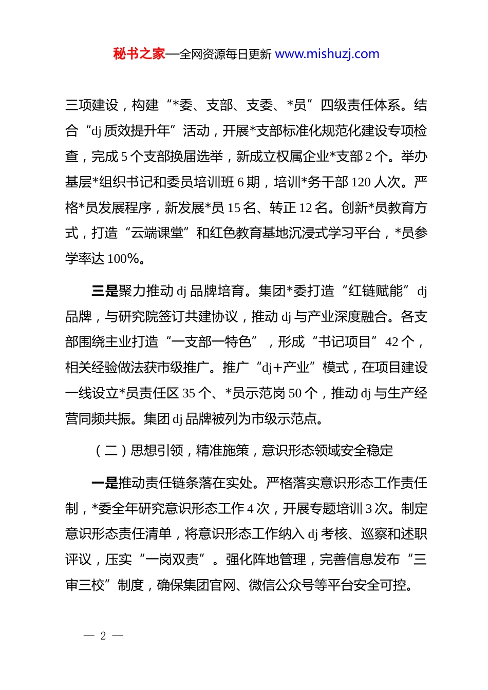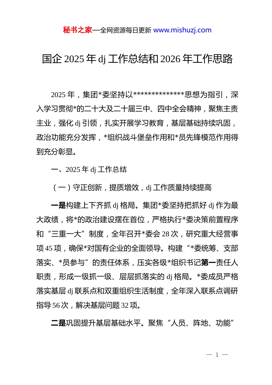 秘书之家—全网资源每日更新 www.mishuzj.com国企 2025 年 dj 工作总结和 2026 年工作思路2025 年,集团*委坚持以**************思想为指引,深入学习贯彻*的二十大及二十届三中、四中全会精神,聚焦主责主业,强化 dj 引领,扎实开展学习教育,基层基础持续巩固,政治功能充分发挥,*组织战斗堡垒作用和*员先锋模范作用得到充分彰显。一、2025 年 dj 工作总结(一)守正创新,提质增效,dj 工作质量持续提高一是构建上下齐抓 dj 格局。集团*委坚持把抓好 dj 作为最大政绩,将*的政治建设摆在首位,严格执行*委决策前置程序和“三重一大”制度,全年召开*委会 28 次,研究重大经营事项 45 项,确保*对国有企业的全面领导。构建“*委统筹、支部落实、*员参与”的责任体系,压实各级*组织书记第一责任人职责,形成一级抓一级、层层抓落实的 dj 格局。*委成员严格落实基层 dj 联系点和双重组织生活制度,全年深入联系点调研指导 56 次,解决基层问题 32 项。二是巩固提升基层基础水平。聚焦“人员、阵地、功能”— 1 —秘书之家—全网资源每日更新 www.mishuzj.com三项建设,构建“*委、支部、支委、*员”四级责任体系。结合“dj 质效提升年”活动,开展*支部标准化规范化建设专项检查,完成 5 个支部换届选举,新成立权属企业*支部 2 个。举办基层*组织书记和委员培训班 6 期,培训*务干部 120 人次。严格*员发展程序,新发展*员 15 名、转正 12 名。创新*员教育方式,打造“云端课堂”和红色教育基地沉浸式学习平台,*员参学率达 100%。三是聚力推动 dj 品牌培育。集团*委打造“红链赋能”dj品牌,与研究院签订共建协议,推动 dj 与产业深度融合。各支部围绕主业打造“一支部一特色”,形成“书记项目”42 个,相关经验做法获市级推广。推广“dj+产业”模式,在项目建设一线设立*员责任区 35 个、*员示范岗 50 个,推动 dj 与生产经营同频共振。集团 dj 品牌被列为市级示范点。(二)思想引领,精准施策,意识形态领域安全稳定一是推动责任链条落在实处。严格落实意识形态工作责任制,*委全年研究意识形态工作 4 次,开展专题培训 3 次。制定意识形态责任清单,将意识形态工作纳入 dj 考核、巡察和述职评议,压实“一岗双责”。强化阵地管理,完善信息发布“三审三校”制度,确保集团官网、微信公众号等平台安全可控。— 2 —秘书之家—全网资源每日更新 www.mishuzj.com二是推动理论学习学在实处。把学习贯彻**************思想作为主线,落实中心组学习研讨机制,全年召开*委中心组学习会 16 次,专题研讨 12 次。坚持分层分类,针对在岗*员,采取集中学和自主学相结合的方式,针对离休*员,采取送学上门方式,让*员都动起来、学起来。基层*组织以“三会一课”为主抓手,用好“学习强国”学习平台、智慧 dj 平台、固定学习日、主题*日等载体,推动学习教育常态化制度化。三是推动意识形态严在实处。组织意识形态、网络意识形态分析研判,常态督导、动态排查,加强重要节点和敏感时期的舆论研判和监管。落实阵地管理备案制度,强化过程监督管理。严格规范程序,优化信息发布、审核、把关流程,把好集团网站、微信公众号等意识形态主阵地,做好信息平台日常监管。(三)多方联动,齐抓共管,全面从严治*纵深发展一是画好“同心圆”,践行国企担当。积极履行国企社会责任,围绕服务国家战略,集团承接重大基础设施项目,总投资额超百亿元。发挥产业优势,助力乡村振兴,投入帮扶资金800 万元。打造“零碳服务区”,推广光伏清洁能源,服务生态文明建设。— 3 —秘书之家—全网资源每日更新 www.mishuzj.com二是筑牢“压舱石”,强化监督执纪。推进政治监督具体化精准化常态化,持续开展优化营商环境、“靠企吃企”、债务化解等专项监督,推动产业抓主拓新、项目扩投增项、改革提质增效等发展战略落地落实,保障集团转型发展大局。扎实开展学习教育,深化“清廉国企”建设,开展“靠企吃企”专项整治,查处问题线索 15 件。创新“两牌一码”监督机制,推行阳光采购平台,实现穿透式监管。加强廉洁...