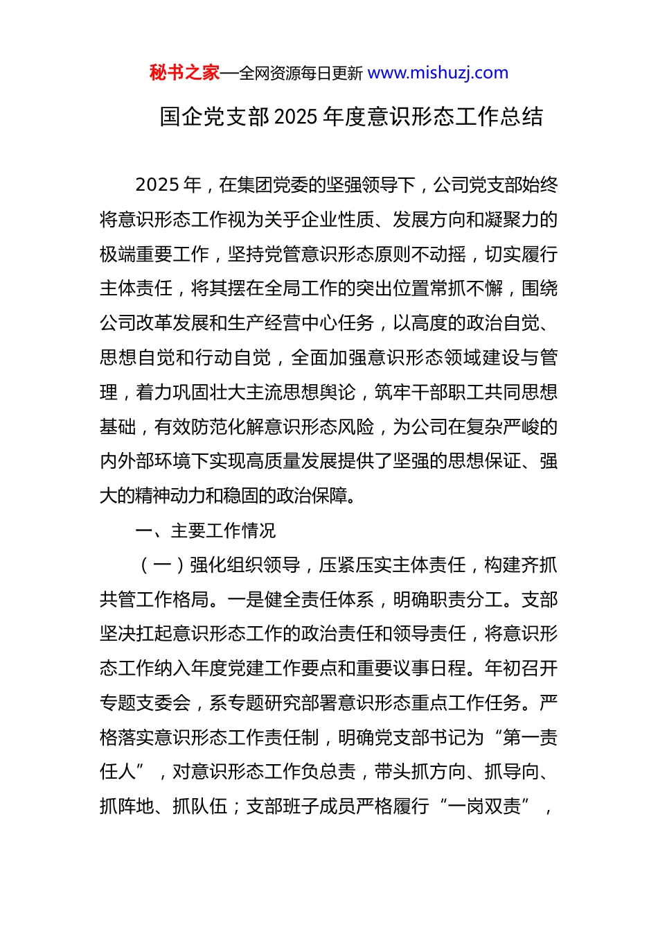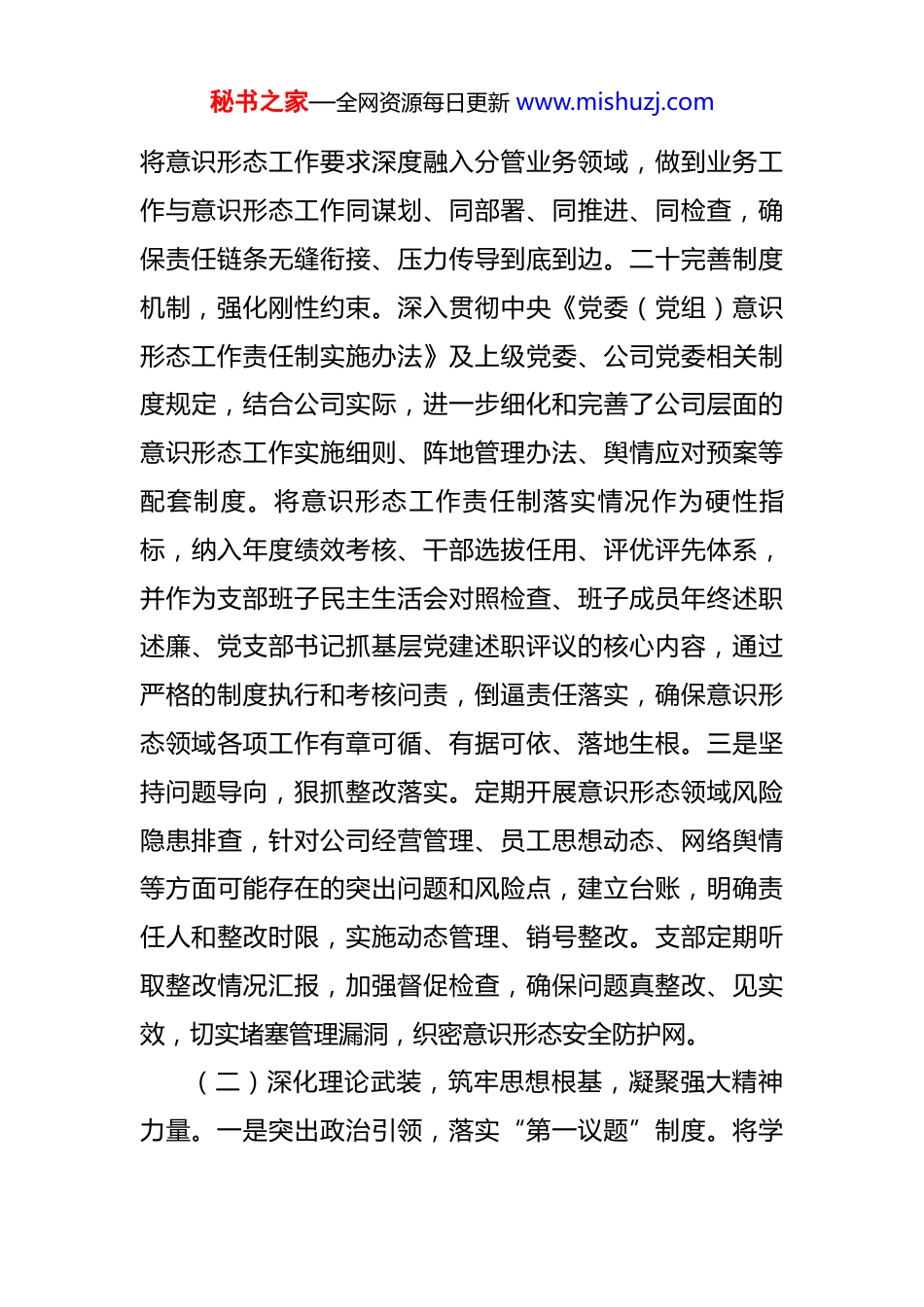 秘书之家—全网资源每日更新 www.mishuzj.com国企党支部 2025 年度意识形态工作总结 2025 年,在集团党委的坚强领导下,公司党支部始终将意识形态工作视为关乎企业性质、发展方向和凝聚力的极端重要工作,坚持党管意识形态原则不动摇,切实履行主体责任,将其摆在全局工作的突出位置常抓不懈,围绕公司改革发展和生产经营中心任务,以高度的政治自觉、思想自觉和行动自觉,全面加强意识形态领域建设与管理,着力巩固壮大主流思想舆论,筑牢干部职工共同思想基础,有效防范化解意识形态风险,为公司在复杂严峻的内外部环境下实现高质量发展提供了坚强的思想保证、强大的精神动力和稳固的政治保障。一、主要工作情况(一)强化组织领导,压紧压实主体责任,构建齐抓共管工作格局。一是健全责任体系,明确职责分工。支部坚决扛起意识形态工作的政治责任和领导责任,将意识形态工作纳入年度党建工作要点和重要议事日程。年初召开专题支委会,系专题研究部署意识形态重点工作任务。严格落实意识形态工作责任制,明确党支部书记为“第一责任人”,对意识形态工作负总责,带头抓方向、抓导向、抓阵地、抓队伍;支部班子成员严格履行“一岗双责”,秘书之家—全网资源每日更新 www.mishuzj.com将意识形态工作要求深度融入分管业务领域,做到业务工作与意识形态工作同谋划、同部署、同推进、同检查,确保责任链条无缝衔接、压力传导到底到边。二十完善制度机制,强化刚性约束。深入贯彻中央《党委(党组)意识形态工作责任制实施办法》及上级党委、公司党委相关制度规定,结合公司实际,进一步细化和完善了公司层面的意识形态工作实施细则、阵地管理办法、舆情应对预案等配套制度。将意识形态工作责任制落实情况作为硬性指标,纳入年度绩效考核、干部选拔任用、评优评先体系,并作为支部班子民主生活会对照检查、班子成员年终述职述廉、党支部书记抓基层党建述职评议的核心内容,通过严格的制度执行和考核问责,倒逼责任落实,确保意识形态领域各项工作有章可循、有据可依、落地生根。三是坚持问题导向,狠抓整改落实。定期开展意识形态领域风险隐患排查,针对公司经营管理、员工思想动态、网络舆情等方面可能存在的突出问题和风险点,建立台账,明确责任人和整改时限,实施动态管理、销号整改。支部定期听取整改情况汇报,加强督促检查,确保问题真整改、见实效,切实堵塞管理漏洞,织密意识形态安全防护网。(二)深化理论武装,筑牢思想根基,凝聚强大精神力量。一是突出政治引领,落实“第一议题”制度。将学秘书之家—全网资源每日更新 www.mishuzj.com习宣传贯彻党的二十大及二十届三中、四中精神和习近平总书记最新重要讲话、重要指示批示精神作为首要政治任务,严格落实“第一议题”学习制度。全年组织支委会、党员大会、党小组会“第一议题”学习*次,确保党的创新理论和中央重大决策部署第一时间传达学习、第一时间研究贯彻。通过系统学习,引导全体党员深刻领悟“两个确立”的决定性意义,不断增强“四个意识”、坚定“四个自信”、做到“两个维护”,始终在思想上政治上行动上同党中央保持高度一致。二是抓实理论学习,提升政治素养。精心制定并严格执行《公司党支部 2025 年度理论学习重点内容安排》,将习近平新时代中国特色社会主义思想作为核心内容,贯穿全年学习教育始终。严格落实“三会一课”制度,全年组织党员集中学习 12 次,其中围绕学习贯彻习近平新时代中国特色社会主义思想主题教育常态化长效化要求,开展专题集中学习研讨*次。创新学习形式,通过领导领学、专家导学、个人自学、专题研讨、撰写高质量心得体会、知识测试等多种方式,引导党员紧密联系国际国内形势、行业发展态势和自身岗位职责,深学细悟、融会贯通,切实将学习成果转化为提升党性修养、增强履职能力、改进工作作风、推动公司发展的实际成效。三是丰富教育载体,坚定理想信念。精心策划开展主题鲜秘书之家—全网资源每日更新 www.mishuzj.com明、内涵丰富的主题党日活动。年内,支部书记带头讲授专题党课*次,内容涵盖党的历史、形势政策、廉洁从业等;组织全体党员集中观看专题片、...