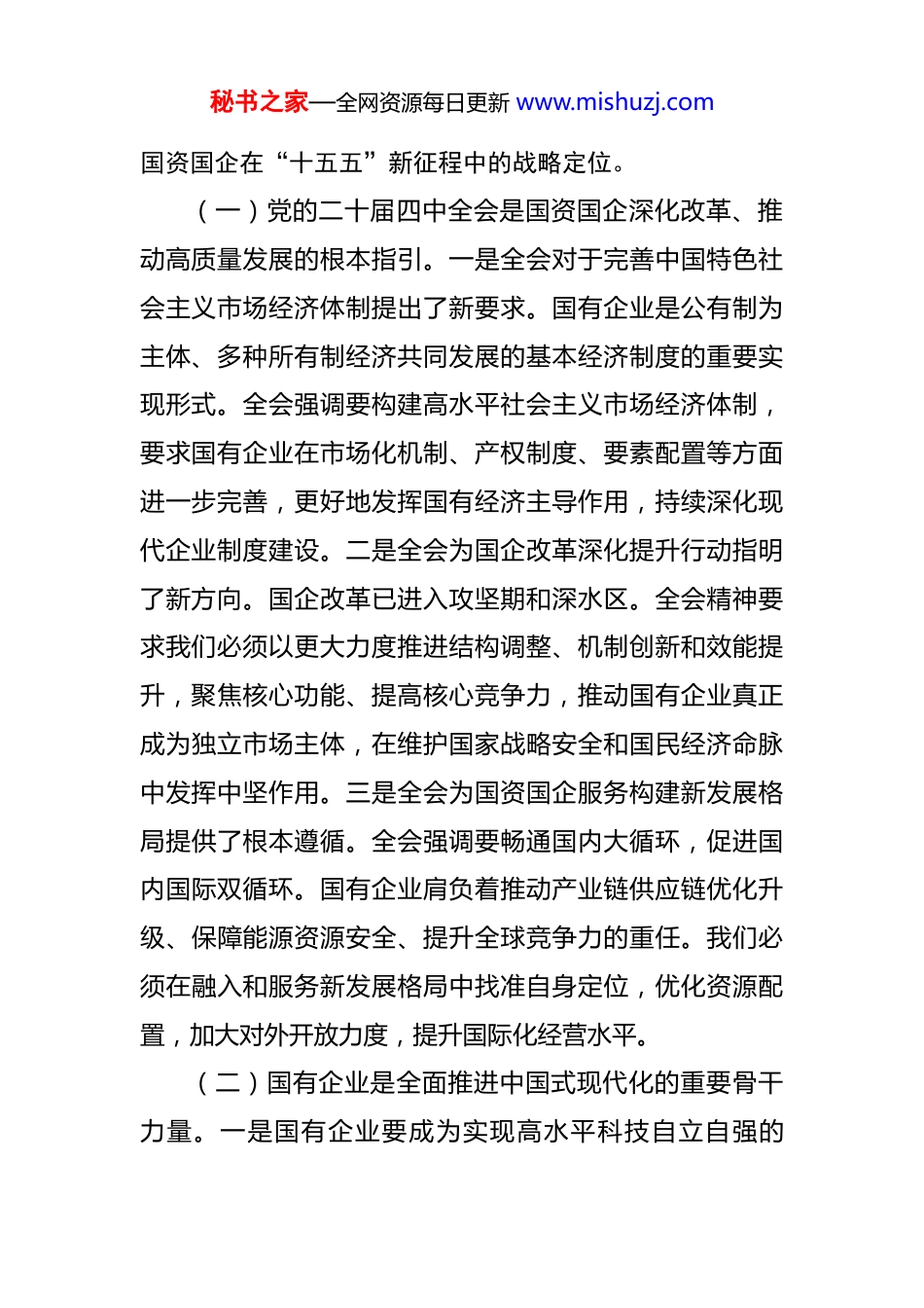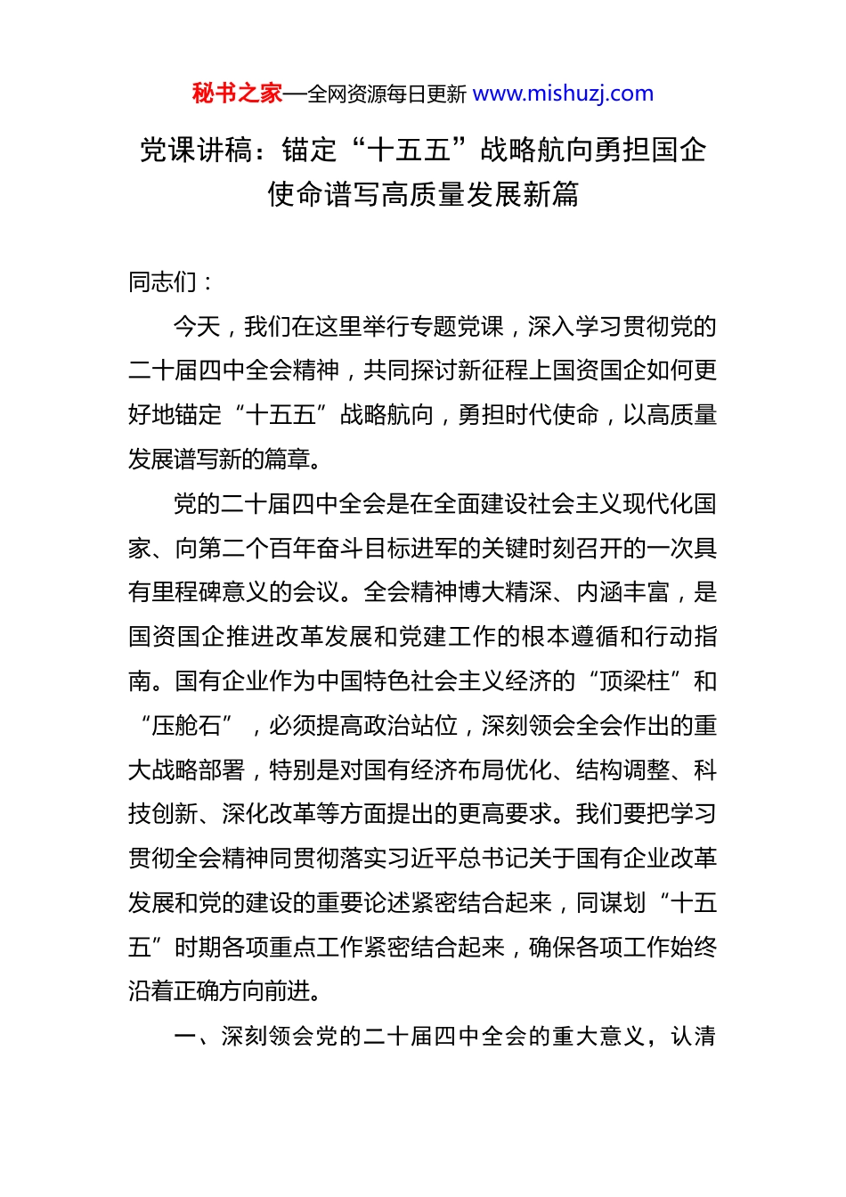秘书之家—全网资源每日更新 www.mishuzj.com党课讲稿:锚定“十五五”战略航向勇担国企使命谱写高质量发展新篇 同志们:今天,我们在这里举行专题党课,深入学习贯彻党的二十届四中全会精神,共同探讨新征程上国资国企如何更好地锚定“十五五”战略航向,勇担时代使命,以高质量发展谱写新的篇章。党的二十届四中全会是在全面建设社会主义现代化国家、向第二个百年奋斗目标进军的关键时刻召开的一次具有里程碑意义的会议。全会精神博大精深、内涵丰富,是国资国企推进改革发展和党建工作的根本遵循和行动指南。国有企业作为中国特色社会主义经济的“顶梁柱”和“压舱石”,必须提高政治站位,深刻领会全会作出的重大战略部署,特别是对国有经济布局优化、结构调整、科技创新、深化改革等方面提出的更高要求。我们要把学习贯彻全会精神同贯彻落实习近平总书记关于国有企业改革发展和党的建设的重要论述紧密结合起来,同谋划“十五五”时期各项重点工作紧密结合起来,确保各项工作始终沿着正确方向前进。一、深刻领会党的二十届四中全会的重大意义,认清秘书之家—全网资源每日更新 www.mishuzj.com国资国企在“十五五”新征程中的战略定位。(一)党的二十届四中全会是国资国企深化改革、推动高质量发展的根本指引。一是全会对于完善中国特色社会主义市场经济体制提出了新要求。国有企业是公有制为主体、多种所有制经济共同发展的基本经济制度的重要实现形式。全会强调要构建高水平社会主义市场经济体制,要求国有企业在市场化机制、产权制度、要素配置等方面进一步完善,更好地发挥国有经济主导作用,持续深化现代企业制度建设。二是全会为国企改革深化提升行动指明了新方向。国企改革已进入攻坚期和深水区。全会精神要求我们必须以更大力度推进结构调整、机制创新和效能提升,聚焦核心功能、提高核心竞争力,推动国有企业真正成为独立市场主体,在维护国家战略安全和国民经济命脉中发挥中坚作用。三是全会为国资国企服务构建新发展格局提供了根本遵循。全会强调要畅通国内大循环,促进国内国际双循环。国有企业肩负着推动产业链供应链优化升级、保障能源资源安全、提升全球竞争力的重任。我们必须在融入和服务新发展格局中找准自身定位,优化资源配置,加大对外开放力度,提升国际化经营水平。(二)国有企业是全面推进中国式现代化的重要骨干力量。一是国有企业要成为实现高水平科技自立自强的秘书之家—全网资源每日更新 www.mishuzj.com“国家队”。创新是引领发展的第一动力。中国式现代化是物质文明和精神文明相协调的现代化,关键在于发展新质生产力。国有企业必须坚定扛起创新大旗,加快构建以企业为主体、市场为导向、产学研深度融合的技术创新体系,集中力量攻克一批“卡脖子”的关键核心技术。我们在航天工程、高铁建设、核电技术等领域取得的成就,正是国有企业发挥新型举国体制优势的生动体现。二是国有企业要成为推动产业体系现代化和优化布局的“排头兵”。全会强调要建设现代化产业体系,要求国有资本在关系国家安全、国民经济命脉的重要行业和关键领域发挥主导作用。这要求我们必须深入实施国有经济布局优化和结构调整战略,坚决退出低效无效资产,加大对战略性新兴产业的投入,构建具有国际竞争力的现代产业集群,保障我国产业链供应链的韧性和安全。三是国有企业要成为提升社会福祉和维护民生稳定的“压舱石”。中国式现代化是全体人民共同富裕的现代化。国有企业在保障就业、提供公共服务、参与乡村振兴、应对突发事件等方面承担着重大社会责任。比如,在重大自然灾害面前,国有能源、通信、交通企业总是冲锋在前,保障了基本民生需求。我们必须将履行社会责任融入企业治理全过程,彰显国有企业的政治本色和为民情怀。秘书之家—全网资源每日更新 www.mishuzj.com二、聚焦“十五五”战略目标,以高质量发展构建国企新优势。(一)在培育发展新质生产力上迈出决定性步伐。一是将科技创新摆在更加突出的位置。要制定面向“十五五”的科技创新中长期规划,加大研发投入强度,尤其是基础研究和应用基础研究投入,确保投入占比持续高于行业平均水平。要鼓励企...