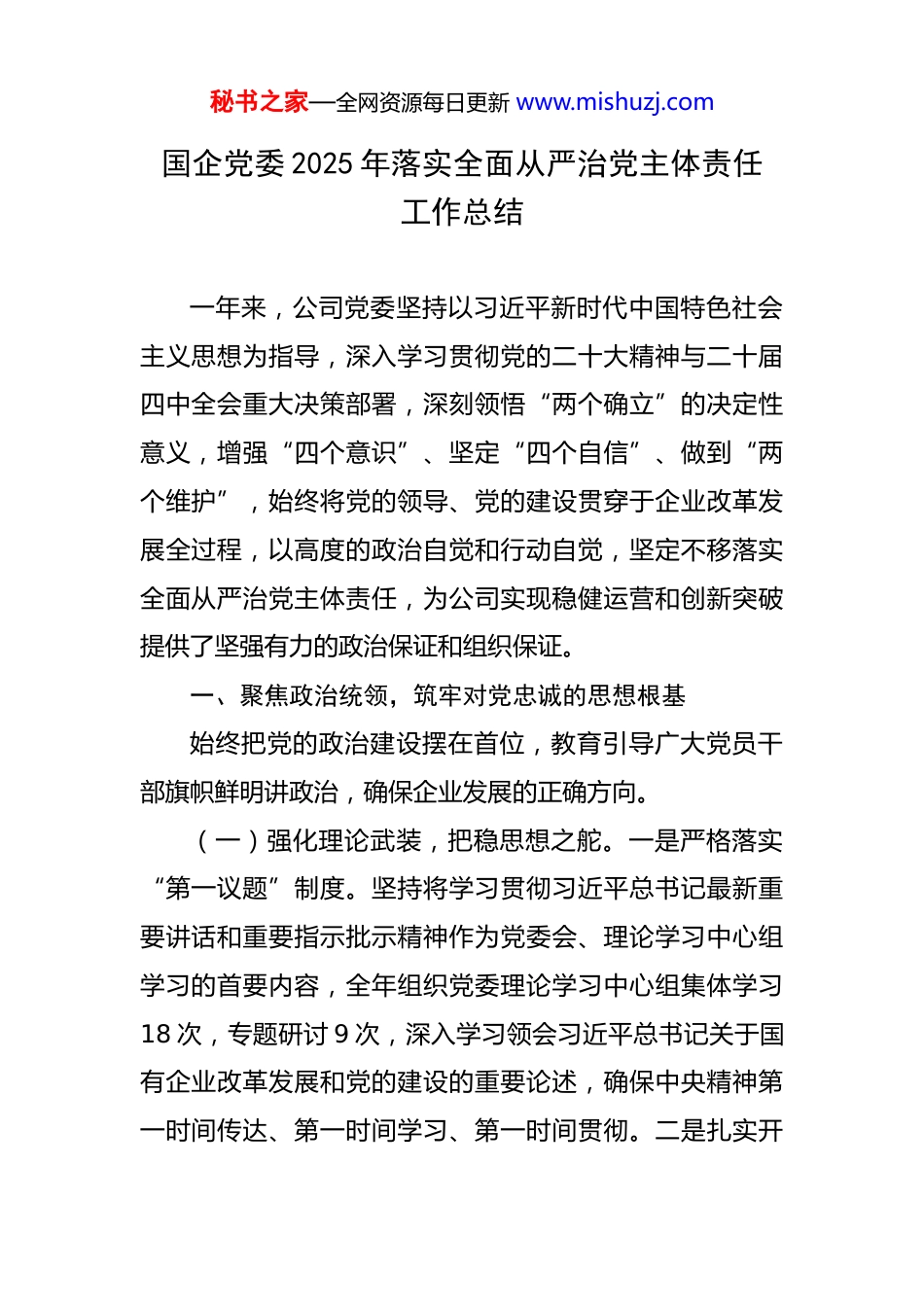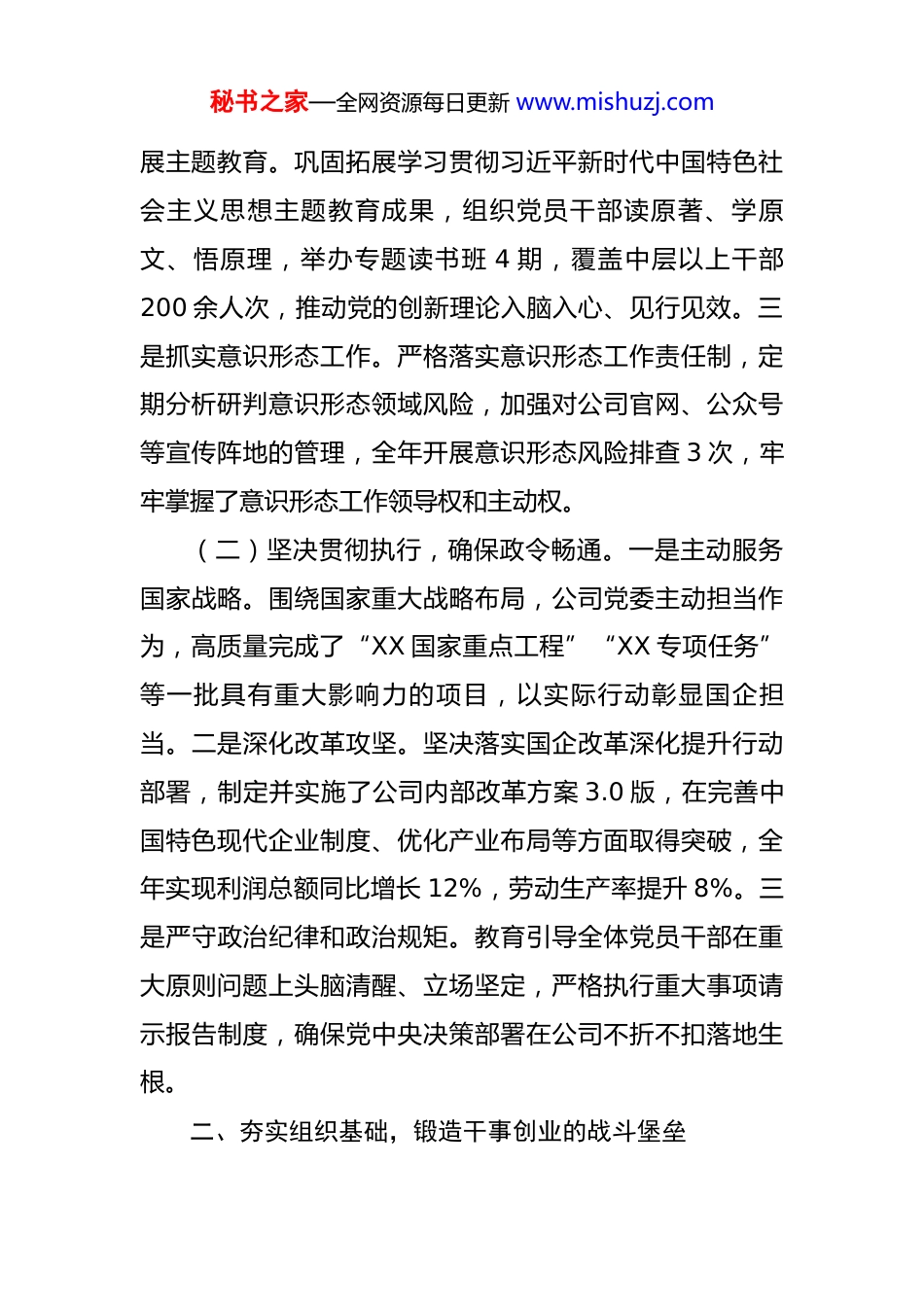 秘书之家—全网资源每日更新 www.mishuzj.com国企党委 2025 年落实全面从严治党主体责任工作总结 一年来,公司党委坚持以习近平新时代中国特色社会主义思想为指导,深入学习贯彻党的二十大精神与二十届四中全会重大决策部署,深刻领悟“两个确立”的决定性意义,增强“四个意识”、坚定“四个自信”、做到“两个维护”,始终将党的领导、党的建设贯穿于企业改革发展全过程,以高度的政治自觉和行动自觉,坚定不移落实全面从严治党主体责任,为公司实现稳健运营和创新突破提供了坚强有力的政治保证和组织保证。一、聚焦政治统领,筑牢对党忠诚的思想根基始终把党的政治建设摆在首位,教育引导广大党员干部旗帜鲜明讲政治,确保企业发展的正确方向。(一)强化理论武装,把稳思想之舵。一是严格落实“第一议题”制度。坚持将学习贯彻习近平总书记最新重要讲话和重要指示批示精神作为党委会、理论学习中心组学习的首要内容,全年组织党委理论学习中心组集体学习18 次,专题研讨 9 次,深入学习领会习近平总书记关于国有企业改革发展和党的建设的重要论述,确保中央精神第一时间传达、第一时间学习、第一时间贯彻。二是扎实开秘书之家—全网资源每日更新 www.mishuzj.com展主题教育。巩固拓展学习贯彻习近平新时代中国特色社会主义思想主题教育成果,组织党员干部读原著、学原文、悟原理,举办专题读书班 4 期,覆盖中层以上干部200 余人次,推动党的创新理论入脑入心、见行见效。三是抓实意识形态工作。严格落实意识形态工作责任制,定期分析研判意识形态领域风险,加强对公司官网、公众号等宣传阵地的管理,全年开展意识形态风险排查 3 次,牢牢掌握了意识形态工作领导权和主动权。(二)坚决贯彻执行,确保政令畅通。一是主动服务国家战略。围绕国家重大战略布局,公司党委主动担当作为,高质量完成了“XX 国家重点工程”“XX 专项任务”等一批具有重大影响力的项目,以实际行动彰显国企担当。二是深化改革攻坚。坚决落实国企改革深化提升行动部署,制定并实施了公司内部改革方案 3.0 版,在完善中国特色现代企业制度、优化产业布局等方面取得突破,全年实现利润总额同比增长 12%,劳动生产率提升 8%。三是严守政治纪律和政治规矩。教育引导全体党员干部在重大原则问题上头脑清醒、立场坚定,严格执行重大事项请示报告制度,确保党中央决策部署在公司不折不扣落地生根。二、夯实组织基础,锻造干事创业的战斗堡垒秘书之家—全网资源每日更新 www.mishuzj.com坚持大抓基层的鲜明导向,着力增强基层党组织政治功能和组织功能,为企业高质量发展提供坚实支撑。(一)建强基层战斗堡垒。一是推进党支部标准化规范化建设。全面开展“五星”党支部创评活动,对全公司45 个基层党支部进行“过筛子”式检查评估,整顿软弱涣散党支部 2 个,成功创建“五星”支部 15 个,基层党组织的战斗力、凝聚力显著增强。二是深化党建与业务融合。深入开展“党建引领+项目攻坚”活动,在重点项目、关键岗位成立党员突击队、设立党员示范岗,全年围绕技术创新、市场开拓等难题立项攻关 28 项,有效解决了“卡脖子”技术难题 3 项,创造直接经济效益超 5000 万元。(二)锻造过硬干部队伍。一是树立鲜明用人导向。坚持党管干部原则和新时代好干部标准,注重在重大斗争一线、艰苦复杂环境中考察识别干部,全年提拔使用了 8名在关键核心任务中表现突出的优秀年轻干部,干部队伍结构进一步优化。二是提升干部能力本领。实施“领航计划”,选派 30 名中青年骨干到上级单位、先进企业跟班学习,组织开展专业能力培训班 12 期,参训人员达 600 余人次,有效弥补了干部的知识弱项、能力短板和经验盲区。三是加强干部监督管理。坚持严管与厚爱相结合,对干部“八小时之外”的言行加强提醒监督,全年开展谈心秘书之家—全网资源每日更新 www.mishuzj.com谈话 300 余人次,对苗头性、倾向性问题早发现、早提醒,营造了风清气正的干事创业环境。三、坚持正风肃纪,营造风清气正的政治生态以钉钉子精神持之以恒加强作风建设,一体推进不敢腐、不能腐、不想腐,不断巩固和发展...