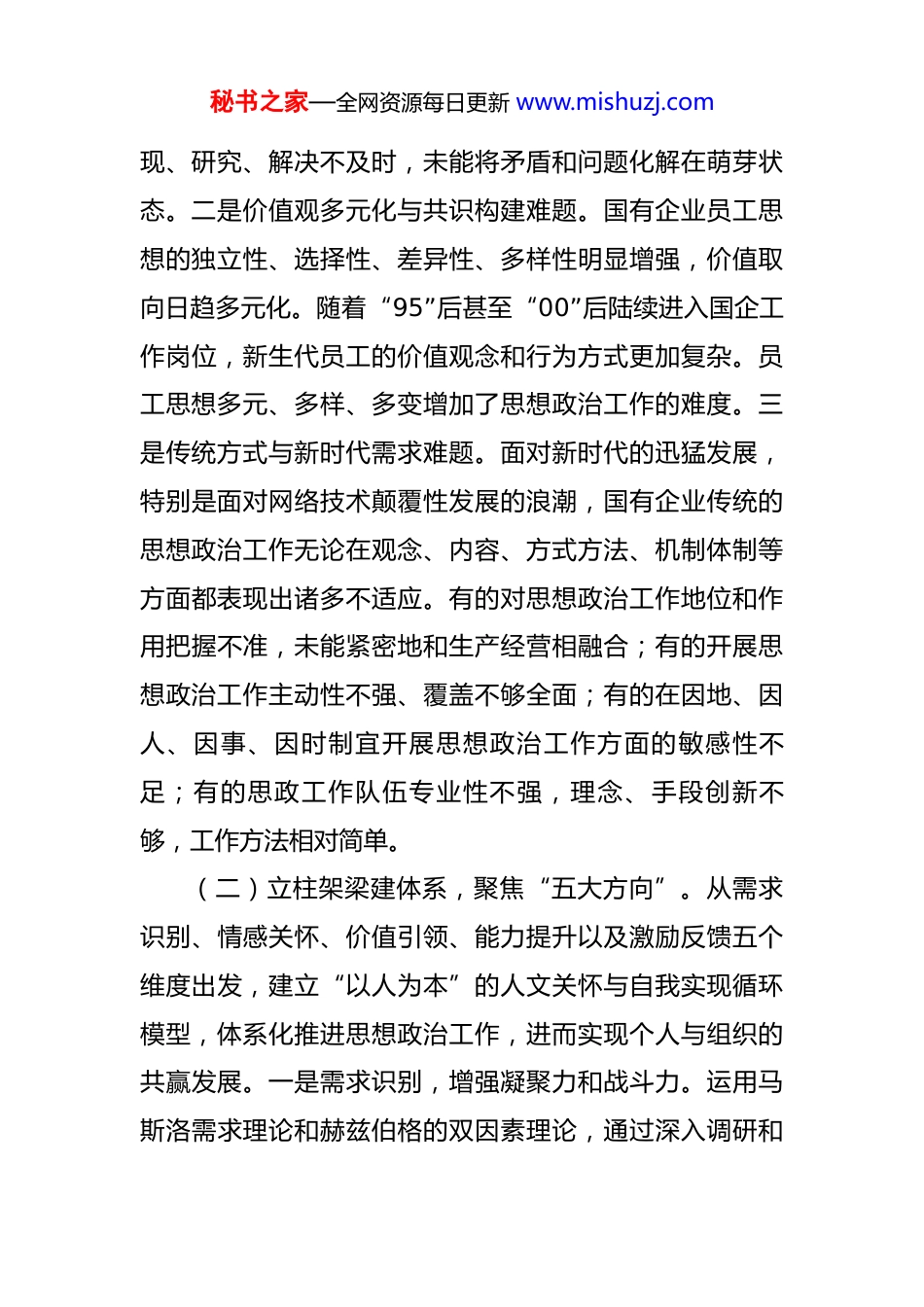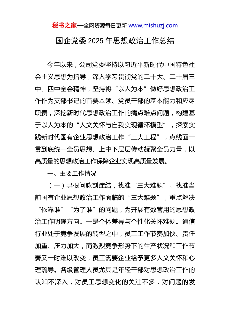 秘书之家—全网资源每日更新 www.mishuzj.com国企党委 2025 年思想政治工作总结 今年以来,公司党委坚持以习近平新时代中国特色社会主义思想为指导,深入学习贯彻党的二十大、二十届三中、四中全会精神,坚持将“以人为本”做好思想政治工作作为支部书记的首要本领、党员干部的基本能力和应尽职责,深挖新时代思想政治工作的痛点难点问题,构建基于以人为本的“人文关怀与自我实现循环模型”,探索实践新时代国有企业思想政治工作“三大工程”,点线面一贯到底统一全员思想、上中下层层传动凝聚全员力量,以高质量的思想政治工作保障企业实现高质量发展。一、主要工作情况(一)寻根问脉剖症结,找准“三大难题”。找准当前国有企业思想政治工作面临的“三大难题”,重点解决“依靠谁”“为了谁”的问题,为开展有效管用的思想政治工作明确方向。一是个体差异与个性化关怀难题。通信行业处于竞争发展的转型之中,员工工作节奏加快、责任加重、压力加大,而激烈竞争形势下的生产状况和工作节奏又一时难以改变,员工需要企业给予更多人文关怀和心理疏导。各级管理人员尤其是年轻干部对思想政治工作的认知不深入,对员工思想变化的关注不多,对问题的发秘书之家—全网资源每日更新 www.mishuzj.com现、研究、解决不及时,未能将矛盾和问题化解在萌芽状态。二是价值观多元化与共识构建难题。国有企业员工思想的独立性、选择性、差异性、多样性明显增强,价值取向日趋多元化。随着“95”后甚至“00”后陆续进入国企工作岗位,新生代员工的价值观念和行为方式更加复杂。员工思想多元、多样、多变增加了思想政治工作的难度。三是传统方式与新时代需求难题。面对新时代的迅猛发展,特别是面对网络技术颠覆性发展的浪潮,国有企业传统的思想政治工作无论在观念、内容、方式方法、机制体制等方面都表现出诸多不适应。有的对思想政治工作地位和作用把握不准,未能紧密地和生产经营相融合;有的开展思想政治工作主动性不强、覆盖不够全面;有的在因地、因人、因事、因时制宜开展思想政治工作方面的敏感性不足;有的思政工作队伍专业性不强,理念、手段创新不够,工作方法相对简单。(二)立柱架梁建体系,聚焦“五大方向”。从需求识别、情感关怀、价值引领、能力提升以及激励反馈五个维度出发,建立“以人为本”的人文关怀与自我实现循环模型,体系化推进思想政治工作,进而实现个人与组织的共赢发展。一是需求识别,增强凝聚力和战斗力。运用马斯洛需求理论和赫兹伯格的双因素理论,通过深入调研和秘书之家—全网资源每日更新 www.mishuzj.com访谈,从激励因素和保健因素两个维度出发,了解员工在生理、安全、社交、尊重和自我实现等方面的需求;针对不同层次需求设计并实施相应的满足策略,如薪酬福利、职业发展、良好环境等,进而增强组织凝聚力和战斗力。二是情感关怀,提升忠诚度和满意度。运用心理学中的情感管理理论,通过谈心谈话、鼓励肯定等方式关心员工的生活、工作、学习等方面情况,关注员工的心理健康和情感需求,提供必要的心理支持和关怀,营造温馨、和谐的工作氛围,提高员工对组织的忠诚度和满意度。三是价值引领,深化归属感和认同感。运用组织文化理论和自我实现理论,弘扬社会主旋律,构建积极向上的企业文化,设立明确的组织目标和愿景,通过宣传教育、实践活动等方式引导员工树立正确的世界观、人生观和价值观,增强员工的归属感和认同感,实现个人价值和社会价值的统一。四是能力提升,激发积极性和创造性。运用人才发展理论和自我决定理论,关注员工的能力提升和职业发展,通过提供培训、指导等支持帮助员工实现个人成长和职业发展目标;设立挑战性任务和项目,鼓励勇于创新、敢于作为,激发员工的工作积极性和创造性,提高组织的整体效能和竞争力。五是激励反馈,确保针对性和实效性。借鉴管理学中的激励理论和反馈机制,建立完善的激励机制和秘书之家—全网资源每日更新 www.mishuzj.com反馈机制,通过分享优秀案例增强自我实现感,定期收集员工对思想政治工作的意见建议并持续改进和优化,确保思想政治工作的针对性和实效性,不断提高工作质量和水平。(三...
