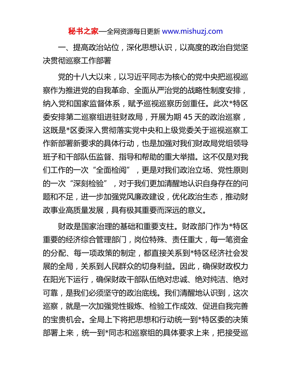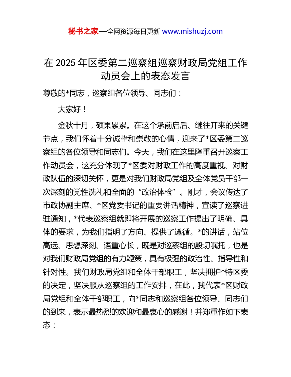 秘书之家—全网资源每日更新 www.mishuzj.com在 2025 年区委第二巡察组巡察财政局党组工作动员会上的表态发言尊敬的*同志,巡察组各位领导、同志们:大家好!金秋十月,硕果累累。在这个承前启后、继往开来的关键节点,我们怀着十分诚挚和崇敬的心情,迎来了*区委第二巡察组的各位领导和同志们。今天,我们在这里隆重召开巡察工作动员会,这充分体现了*区委对财政工作的高度重视、对财政队伍的深切关怀,更是对我们财政局党组及全体党员干部一次深刻的党性洗礼和全面的“政治体检”。刚才,会议传达了市政协副主席、*区党委书记的重要讲话精神,宣读了巡察进驻通知,*代表巡察组就即将开展的巡察工作提出了明确、具体的要求,为我们指明了方向、提供了遵循。*的讲话,站位高远、思想深刻、语重心长,既是对巡察组的殷切嘱托,也是对我们财政局党组的有力鞭策,具有极强的政治性、指导性和针对性。我们财政局党组和全体干部职工,坚决拥护*特区委的决定,坚决服从巡察组的工作安排,在此,我代表*区财政局党组和全体干部职工,向*同志和巡察组各位领导、同志们的到来,表示最热烈的欢迎和最衷心的感谢!并郑重作如下表态:秘书之家—全网资源每日更新 www.mishuzj.com一、提高政治站位,深化思想认识,以高度的政治自觉坚决贯彻巡察工作部署党的十八大以来,以习近平同志为核心的党中央把巡视巡察作为推进党的自我革命、全面从严治党的战略性制度安排,纳入党和国家监督体系,赋予巡视巡察历剑重任。此次*特区委安排第二巡察组进驻财政局,开展为期 45 天的政治巡察,这既是*区委深入贯彻落实党中央和上级党委关于巡视巡察工作新部署新要求的具体行动,也是加强对我们财政局党组领导班子和干部队伍监督、指导和帮助的重大举措。这不仅是对我们工作的一次“全面检阅”,更是对我们政治立场、党性原则的一次“深刻检验”,对于我们更加清醒地认识自身存在的问题和不足,进一步加强党风廉政建设,优化政治生态,推动财政事业高质量发展,具有极其重要而深远的意义。财政是国家治理的基础和重要支柱。财政部门作为*特区重要的经济综合管理部门,岗位特殊、责任重大,每一笔资金的分配、每一项政策的制定,都直接关系到*特区经济社会发展的全局,关系到人民群众的切身利益。因此,确保财政权力在阳光下运行,确保财政干部队伍绝对忠诚、绝对纯洁、绝对可靠,是我们必须坚守的政治底线。我们清醒地认识到,这次巡察,就是一次加强党性锻炼、检验工作成效、促进自我完善的宝贵机会。全局上下将把思想和行动统一到*特区委的决策部署上来,统一到*同志和巡察组的具体要求上来,把接受巡秘书之家—全网资源每日更新 www.mishuzj.com察监督作为当前和今后一个时期最重大政治任务,作为践行“两个维护”最直接、最现实的考验,切实增强接受巡察监督、支持巡察工作的思想自觉、政治自觉和行动自觉。我们将以对党的事业高度负责、对财政发展高度负责、对干部职工高度负责、对自己政治生命高度负责的态度,襟怀坦白、真心诚意地接受巡察组的监督检查,共同努力,圆满完成好这次巡察任务。二、严守纪律规矩,全力支持配合,以端正的行动自觉保障巡察工作顺利开展配合巡察组做好工作,是我们的政治责任和应尽义务。局党组和全体干部职工将严格按照巡察工作的要求和安排,以最坚决的态度、最优良的作风、最严明的纪律,全力支持、积极配合、主动服务,确保巡察工作有力、有序、有效进行。一是坚持实事求是,客观公正反映情况。我们将本着对党忠诚、对事业负责的态度,全面、真实、准确地向巡察组汇报工作。在巡察期间,我们将严格遵守巡察纪律,做到“三个决不”:决不干预巡察组的正常工作,决不向巡察组施加任何形式的压力,决不隐瞒、歪曲、捏造事实。对于巡察组需要调阅的各类文件资料、财务账目、会议记录等,我们将指定专人负责,确保在第一时间全面、准确、及时提供。对于巡察组要求的个别谈话,我们将引导相关同志如实反映情况、坦诚说明问题,让巡察组能够全面、深入、透彻地了解我局的真实情况。秘书之家—全网资源每日更新 www.mishuzj.com二是立足财政职责,主动接受政治检阅。过...
