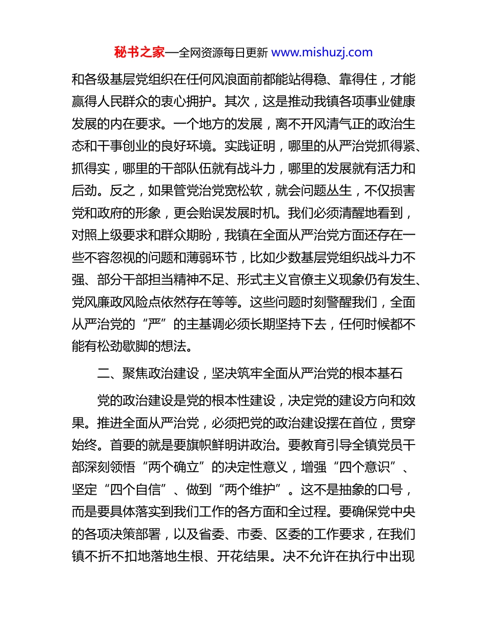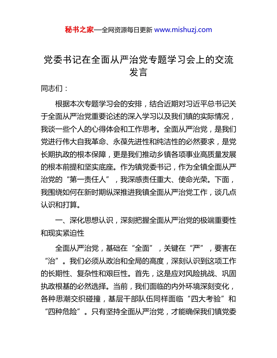秘书之家—全网资源每日更新 www.mishuzj.com党委书记在全面从严治党专题学习会上的交流发言同志们:根据本次专题学习会的安排,结合近期对习近平总书记关于全面从严治党重要论述的深入学习以及我们镇的实际情况,我谈一些个人的心得体会和工作思考。全面从严治党,是我们党进行伟大自我革命、永葆先进性和纯洁性的必然要求,是党长期执政的根本保障,更是我们推动乡镇各项事业高质量发展的根本前提和坚实底座。作为镇党委书记,作为全镇全面从严治党的“第一责任人”,我深感责任重大、使命光荣。下面,我围绕如何在新时期纵深推进我镇全面从严治党工作,谈几点认识和打算。一、深化思想认识,深刻把握全面从严治党的极端重要性和现实紧迫性全面从严治党,基础在“全面”,关键在“严”,要害在“治”。我们必须从政治和全局的高度,深刻认识到这项工作的长期性、复杂性和艰巨性。首先,这是应对风险挑战、巩固执政根基的必然选择。当前,我们面临的内外环境深刻变化,各种思潮交织碰撞,基层干部队伍同样面临“四大考验”和“四种危险”。只有坚持全面从严治党,才能确保我们镇党委秘书之家—全网资源每日更新 www.mishuzj.com和各级基层党组织在任何风浪面前都能站得稳、靠得住,才能赢得人民群众的衷心拥护。其次,这是推动我镇各项事业健康发展的内在要求。一个地方的发展,离不开风清气正的政治生态和干事创业的良好环境。实践证明,哪里的从严治党抓得紧、抓得实,哪里的干部队伍就有战斗力,哪里的发展就有活力和后劲。反之,如果管党治党宽松软,就会问题丛生,不仅损害党和政府的形象,更会贻误发展时机。我们必须清醒地看到,对照上级要求和群众期盼,我镇在全面从严治党方面还存在一些不容忽视的问题和薄弱环节,比如少数基层党组织战斗力不强、部分干部担当精神不足、形式主义官僚主义现象仍有发生、党风廉政风险点依然存在等等。这些问题时刻警醒我们,全面从严治党的“严”的主基调必须长期坚持下去,任何时候都不能有松劲歇脚的想法。二、聚焦政治建设,坚决筑牢全面从严治党的根本基石党的政治建设是党的根本性建设,决定党的建设方向和效果。推进全面从严治党,必须把党的政治建设摆在首位,贯穿始终。首要的就是要旗帜鲜明讲政治。要教育引导全镇党员干部深刻领悟“两个确立”的决定性意义,增强“四个意识”、坚定“四个自信”、做到“两个维护”。这不是抽象的口号,而是要具体落实到我们工作的各方面和全过程。要确保党中央的各项决策部署,以及省委、市委、区委的工作要求,在我们镇不折不扣地落地生根、开花结果。决不允许在执行中出现秘书之家—全网资源每日更新 www.mishuzj.com“温差”“落差”和“偏差”。要严明政治纪律和政治规矩。在重大原则问题上,必须头脑特别清醒、立场特别坚定。要严格执行《关于新形势下党内政治生活的若干准则》,着力增强党内政治生活的政治性、时代性、原则性、战斗性。要提高党员干部的政治能力,善于从政治上看问题,善于把握政治大局,不断提高政治判断力、政治领悟力、政治执行力。镇党委班子要率先垂范,带头维护党中央权威和集中统一领导,带头营造风清气正的政治生态,形成“头雁效应”。三、强化思想引领,持续夯实全面从严治党的思想根基思想是行动的先导。全面从严治党,必须坚持思想建党和制度治党同向发力。要持之以恒用党的创新理论武装头脑。把深入学习贯彻习近平新时代中国特色社会主义思想作为长期政治任务,完善党委理论学习中心组学习制度,带动各支部和全体党员读原著、学原文、悟原理,真正做到学思用贯通、知信行统一。要精心组织开展好各类主题教育活动,不仅要完成“规定动作”,更要结合我镇实际,设计“自选动作”,确保学习入脑入心、见行见效。要牢牢掌握意识形态工作领导权。严格落实意识形态工作责任制,守好各类阵地,特别是要管好用好网络平台,加强对社会思潮的辨析引导,敢于发声亮剑,坚决抵制各种错误言论。要加强理想信念教育和党性教育。充分挖掘和利用好本地的红色资源,讲好党的故事、革命的故事,秘书之家—全网资源每日更新 www.mishuzj.com引导党员干部传承红色基因,赓续...