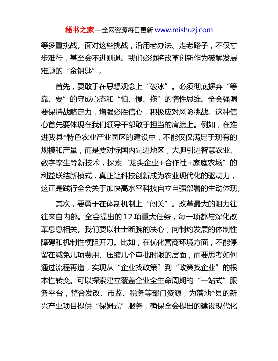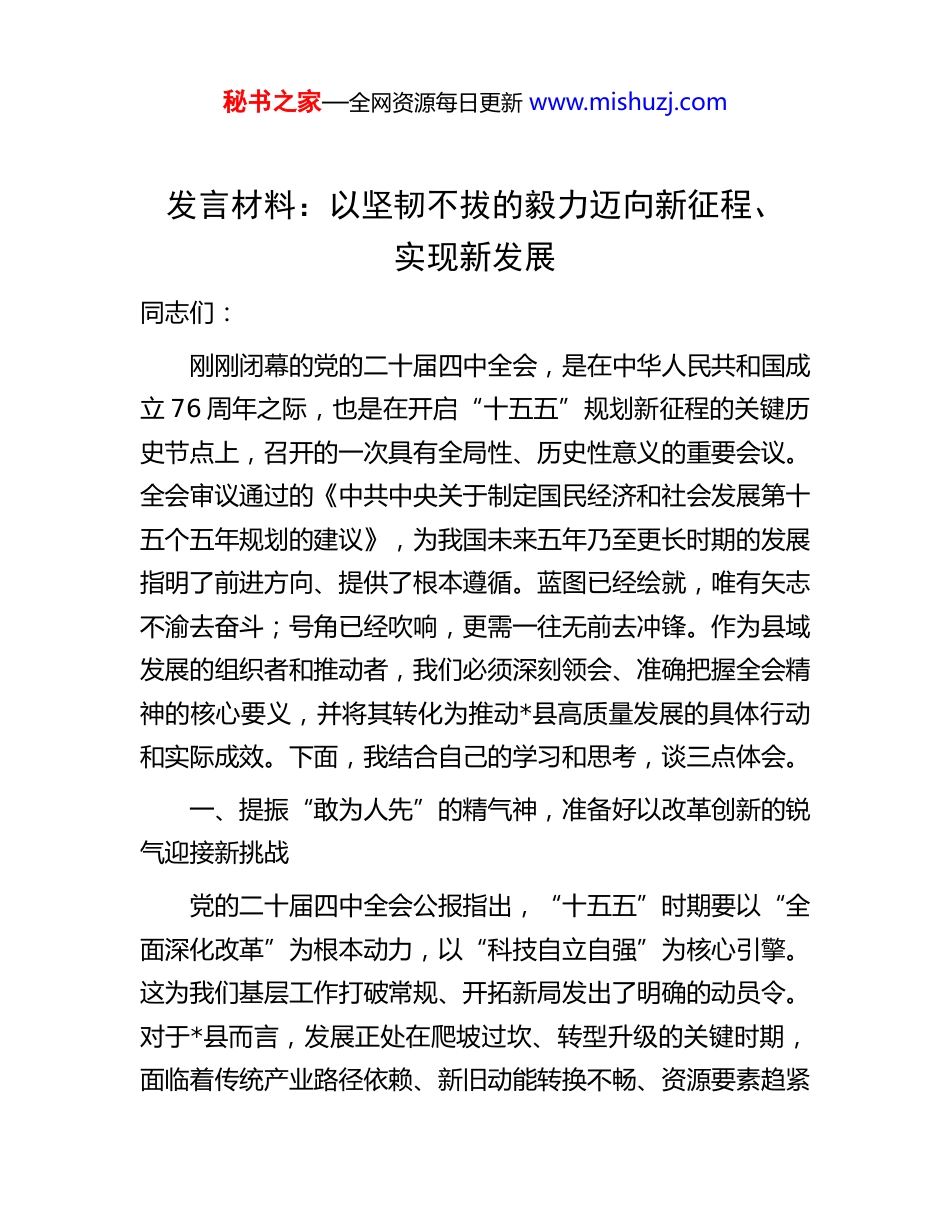 秘书之家—全网资源每日更新 www.mishuzj.com发言材料:以坚韧不拔的毅力迈向新征程、实现新发展同志们:刚刚闭幕的党的二十届四中全会,是在中华人民共和国成立 76 周年之际,也是在开启“十五五”规划新征程的关键历史节点上,召开的一次具有全局性、历史性意义的重要会议。全会审议通过的《中共中央关于制定国民经济和社会发展第十五个五年规划的建议》,为我国未来五年乃至更长时期的发展指明了前进方向、提供了根本遵循。蓝图已经绘就,唯有矢志不渝去奋斗;号角已经吹响,更需一往无前去冲锋。作为县域发展的组织者和推动者,我们必须深刻领会、准确把握全会精神的核心要义,并将其转化为推动*县高质量发展的具体行动和实际成效。下面,我结合自己的学习和思考,谈三点体会。一、提振“敢为人先”的精气神,准备好以改革创新的锐气迎接新挑战党的二十届四中全会公报指出,“十五五”时期要以“全面深化改革”为根本动力,以“科技自立自强”为核心引擎。这为我们基层工作打破常规、开拓新局发出了明确的动员令。对于*县而言,发展正处在爬坡过坎、转型升级的关键时期,面临着传统产业路径依赖、新旧动能转换不畅、资源要素趋紧秘书之家—全网资源每日更新 www.mishuzj.com等多重挑战。面对这些挑战,沿用老办法、走老路子,不仅寸步难行,甚至会不进则退。我们必须将改革创新作为破解发展难题的“金钥匙”。首先,要敢于在思想观念上“破冰”。必须彻底摒弃“等靠、要”的守成心态和“怕、慢、拖”的惰性思维。全会强调要保持战略定力,增强必胜信心,积极应对风险挑战。这种信心首先要体现在我们领导干部敢于担当的肩膀上。例如,在推进我县*特色农业产业园区的建设中,不能仅仅满足于现有的规模和产量,而是要对标国内先进地区,大胆引进智慧农业、数字孪生等新技术,探索“龙头企业+合作社+家庭农场”的利益联结新模式,真正让科技创新成为农业现代化的驱动力,这正是践行全会关于加快高水平科技自立自强部署的生动体现。其次,要勇于在体制机制上“闯关”。改革最大的阻力往往来自内部。全会提出的 12 项重大任务,每一项都与深化改革息息相关。我们要以壮士断腕的决心,向制约发展的体制性障碍和机制性梗阻开刀。比如,在优化营商环境方面,不能停留在减免几项费用、压缩几个审批时限的层面,而要思考如何通过流程再造,实现从“企业找政策”到“政策找企业”的根本性转变。可以探索建立覆盖企业全生命周期的“一站式”服务平台,整合发改、市监、税务等部门资源,为落地*县的新兴产业项目提供“保姆式”服务,确保全会提出的建设现代化秘书之家—全网资源每日更新 www.mishuzj.com产业体系的重大部署能够在我们县落地生根。这种敢为人先的锐气,是我们将中央宏伟蓝图转化为地方发展实景的第一步。再者,要乐于在实践探索中“领跑”。面对新形势新任务不能因循守旧、按部就班,而要主动作为、先行先试。在落实全会关于促进区域协调发展的要求时,我们县不能仅仅满足于跟上整体发展步伐,而要积极打造区域合作的新样板。可以加强与周边经济发达地区的产业对接,建立跨区域的产业合作园区,通过飞地经济、共建共享等模式,实现优势互补、互利共赢。同时,鼓励本地企业“走出去”,参与国内外市场竞争,在更广阔的舞台上展现我们县的实力和风采,以实际行动诠释“敢为人先”的精神内涵,为地方发展开辟新路径、创造新机遇。二、锤炼“善作善成”的真本领,准备好以科学务实的方法破解新难题学习贯彻全会精神,不能停留在口号上,关键在于落实。全会为“十五五”时期擘画了宏伟蓝图,涉及高质量发展、乡村振兴、绿色转型、民生保障等方方面面,每一项任务都是硬骨头,考验着我们的能力和水平。锤炼“善作善成”的真本领,就是要学会用科学的思维、务实的作风去分析问题、解决问题。第一,要坚持系统观念,下好“一盘棋”。全会强调了区域协调发展和城乡融合发展的重要性。*县的发展不能是单兵秘书之家—全网资源每日更新 www.mishuzj.com突进,必须统筹兼顾。在谋划我县的“十五五”规划时,必须将县城建设、乡镇发展和乡村振兴作为一个有机整体来考量。比如,在推...