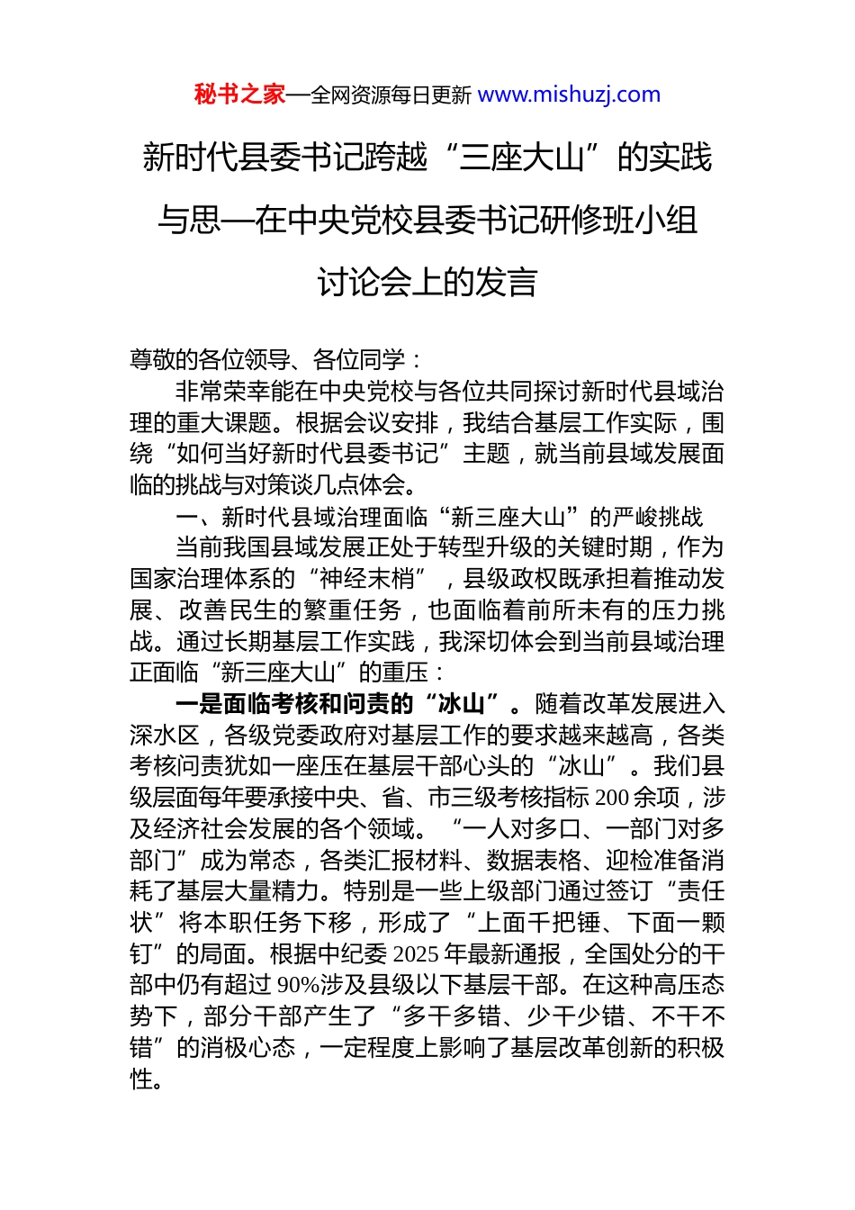 秘书之家—全网资源每日更新 www.mishuzj.com新时代县委书记跨越“三座大山”的实践与思—在中央党校县委书记研修班小组讨论会上的发言尊敬的各位领导、各位同学:非常荣幸能在中央党校与各位共同探讨新时代县域治理的重大课题。根据会议安排,我结合基层工作实际,围绕“如何当好新时代县委书记”主题,就当前县域发展面临的挑战与对策谈几点体会。一、新时代县域治理面临“新三座大山”的严峻挑战当前我国县域发展正处于转型升级的关键时期,作为国家治理体系的“神经末梢”,县级政权既承担着推动发展、改善民生的繁重任务,也面临着前所未有的压力挑战。通过长期基层工作实践,我深切体会到当前县域治理正面临“新三座大山”的重压:一是面临考核和问责的“冰山”。随着改革发展进入深水区,各级党委政府对基层工作的要求越来越高,各类考核问责犹如一座压在基层干部心头的“冰山”。我们县级层面每年要承接中央、省、市三级考核指标 200 余项,涉及经济社会发展的各个领域。“一人对多口、一部门对多部门”成为常态,各类汇报材料、数据表格、迎检准备消耗了基层大量精力。特别是一些上级部门通过签订“责任状”将本职任务下移,形成了“上面千把锤、下面一颗钉”的局面。根据中纪委 2025 年最新通报,全国处分的干部中仍有超过 90%涉及县级以下基层干部。在这种高压态势下,部分干部产生了“多干多错、少干少错、不干不错”的消极心态,一定程度上影响了基层改革创新的积极性。秘书之家—全网资源每日更新 www.mishuzj.com二是面临发展和债务的“高山”。县域经济作为国民经济的微观基础,在经济大循环中发挥着承上启下的重要作用。然而当前县级财政普遍面临收入增长乏力、收支矛盾突出、债务负担沉重等困境。以我们县为例,2025 年一般公共预算收入 XX 亿元,而刚性支出达 XX 亿元,收支缺口持续扩大。受产业基础薄弱制约,我县与全国大多数县域一样,经济发展长期依赖土地、资源、劳动力等要素投入,产业结构层次偏低,新兴产业培育缓慢。为保障民生支出和基础设施建设,近年来通过多种渠道融资发展,目前地方政府债务余额达 XX 亿元,债务率处于较高水平。这种发展模式不可持续,犹如一座难以逾越的“高山”,严重制约着县域经济高质量发展。三是面临安全和信访的“火山”。县域是社会治理的基础单元,担负着守护一方平安的重要职责。随着社会转型加速,各类安全隐患和信访矛盾交织叠加,随时可能爆发的“火山”成为影响社会稳定的重大风险源。在安全监管方面,我县应急管理专业队伍力量薄弱,技术装备水平滞后,难以适应新形势下危化品、燃气、消防等领域的安全监管要求。在信访维稳方面,“信访不信法”“信上不信下”等现象依然突出,2025 年上半年我县进京访、重复访同比上升 12.3%,基层耗费大量人力物力开展维稳工作。特别是一些历史遗留问题与新发展阶段矛盾相互交织,处置稍有不慎就可能引发连锁反应。二、当好新时代县委书记,奋力跨越“三座大山”面对新时代新征程的艰巨任务,县委书记作为“一线总指挥”,必须率先垂范、勇于担当,团结带领广大干部群众攻坚克难。我认为关键要扮演好三个角色:一是当好"破冰前行"的指挥员,激发基层干事活力。针对考核问责带来的"寒蝉效应",县委书记必须发挥好"头雁"作用,为基层干部撑腰鼓劲。要敢于为担当者担当,建立容错纠错机制,让干部在改革创新中轻装上阵。要善于秘书之家—全网资源每日更新 www.mishuzj.com做减法,主动整合压减各类考核检查,把基层干部从文山会海中解放出来。要勇于向上级反映基层实际困难,对不合理的考核指标和"责任状"敢于说不,真正把基层减负落到实处。更重要的是,县委书记要带头深入一线、靠前指挥,用实际行动感召干部、凝聚人心,营造敢闯敢试、干事创业的浓厚氛围。二是当好"攀山越岭"的运动员,推动县域经济发展。面对发展和债务的双重压力,县委书记不能只当"指挥员",更要当"运动员",亲力亲为推动高质量发展。要树立正确的政绩观,摒弃"铺摊子、上项目"的粗放增长思维,把心思用在培育符合本地实际的主导产业上,一张蓝图绘到底。要创新招商引资方式,主动走出去...
