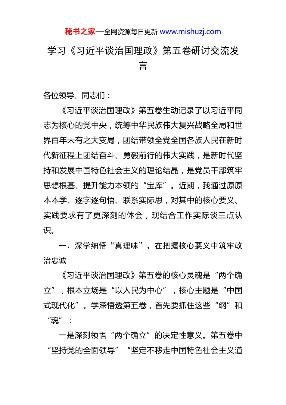 秘书之家—全网资源每日更新 www.mishuzj.com学习《习近平谈治国理政》第五卷研讨交流发言 各位领导、同志们:《习近平谈治国理政》第五卷生动记录了以习近平同志为核心的党中央,统筹中华民族伟大复兴战略全局和世界百年未有之大变局,团结带领全党全国各族人民在新时代新征程上团结奋斗、勇毅前行的伟大实践,是新时代坚持和发展中国特色社会主义的理论结晶,是党员干部筑牢思想根基、提升能力本领的“宝库”。近期,我通过原原本本学、逐字逐句悟、联系实际思,对其中的核心要义、实践要求有了更深刻的体会,现结合工作实际谈三点认识。一、深学细悟“真理味”,在把握核心要义中筑牢政治忠诚《习近平谈治国理政》第五卷的核心灵魂是“两个确立”,根本立场是“以人民为中心”,核心主题是“中国式现代化”。学深悟透第五卷,首先要抓住这些“纲”和“魂”:一是深刻领悟“两个确立”的决定性意义。第五卷中“坚持党的全面领导”“坚定不移走中国特色社会主义道秘书之家—全网资源每日更新 www.mishuzj.com路”等专题,深刻阐明了党中央集中统一领导是党和国家事业发展的根本保证。比如书中提到“党中央是大脑和中枢,党中央必须有定于一尊、一锤定音的权威”,让我更加清醒认识到,忠诚拥护“两个确立”、坚决做到“两个维护”是党员干部的根本政治原则,必须融入血脉、见诸行动。二是精准把握中国式现代化的科学内涵。第五卷围绕“中国式现代化是全体人民共同富裕的现代化”“中国式现代化是人与自然和谐共生的现代化”等重大命题,作出系统阐述。比如“促进共同富裕要把握好尽力而为、量力而行的关系”“生态是最大的民生”等论述,既回答了“是什么”,又指明了“怎么干”,为我们推动高质量发展提供了根本遵循。三是始终坚持以人民为中心的发展思想。第五卷中“江山就是人民,人民就是江山”的论述贯穿始终,从“解决好人民群众急难愁盼问题”到“扎实推动共同富裕”,从“疫情防控中的人民至上、生命至上”到“乡村振兴中的群众主体地位”,每一个专题都体现着总书记对人民的深厚情怀。这让我深刻认识到,无论做什么工作,都要把群众的“表情包”作为工作的“风向标”,把群众的“操心事”变成“放心事”。秘书之家—全网资源每日更新 www.mishuzj.com二、细照笃行“实践味”,在转化学习成果中推动事业发展学习的目的全在于运用。第五卷的理论观点不是“空中楼阁”,而是扎根实践的“鲜活指南”,必须把学习成果转化为推动工作的具体行动:一是在推动高质量发展中践行。比如第五卷强调“新发展理念是指挥棒、红绿灯”,结合我所在的产业园区工作实际,我们要把“创新驱动”作为核心抓手,聚焦高端制造、数字经济等新兴产业,引进一批科技型企业,推动传统产业转型升级,真正把“创新”从理论要求变成发展实效。二是在深化基层治理中落实。第五卷提到“基层治理是国家治理的基石”,作为基层干部,我们要把“共建共治共享”理念融入社区治理,比如针对老旧小区改造中的“众口难调”问题,通过“居民议事会”“现场办公会”等方式,让群众参与决策、监督落实,确保改造工程真正符合群众需求。三是在防范化解风险中体现。第五卷强调“统筹发展和安全”,结合当前疫情防控、安全生产等工作,我们要树立“底线思维”,比如在企业安全生产监管中,不仅要查隐患、堵漏洞,更要开展“安全知识进企业”活动,增秘书之家—全网资源每日更新 www.mishuzj.com强企业员工的安全意识,从源头上防范事故发生。三、常学常新“奋斗味”,在提升能力本领中展现担当作为第五卷既是“理论宝库”,也是“能力字典”,学好用好第五卷,关键要提升“三种能力”:一是提升理论学习的“深度”。制定“每天 1 小时”学习计划,不仅要学原文、读原著,还要参加“专题研讨班”“理论宣讲会”,结合“学习强国”“干部网络学院”等平台,做到原原本本学、逐字逐句悟,不断加深对党的创新理论的理解。二是提升调查研究的“实度”。第五卷中“调查研究是谋事之基、成事之道”的论述,让我深刻认识到,没有调查就没有发言权。比如在乡村振兴工作中,要深入农户家中、田间地头,了解群众的“急难愁...