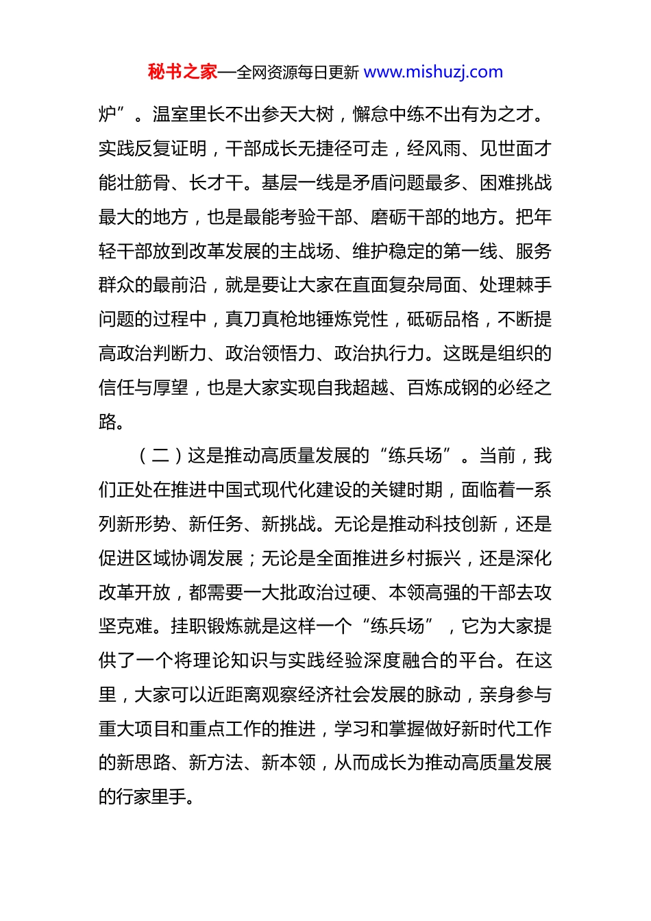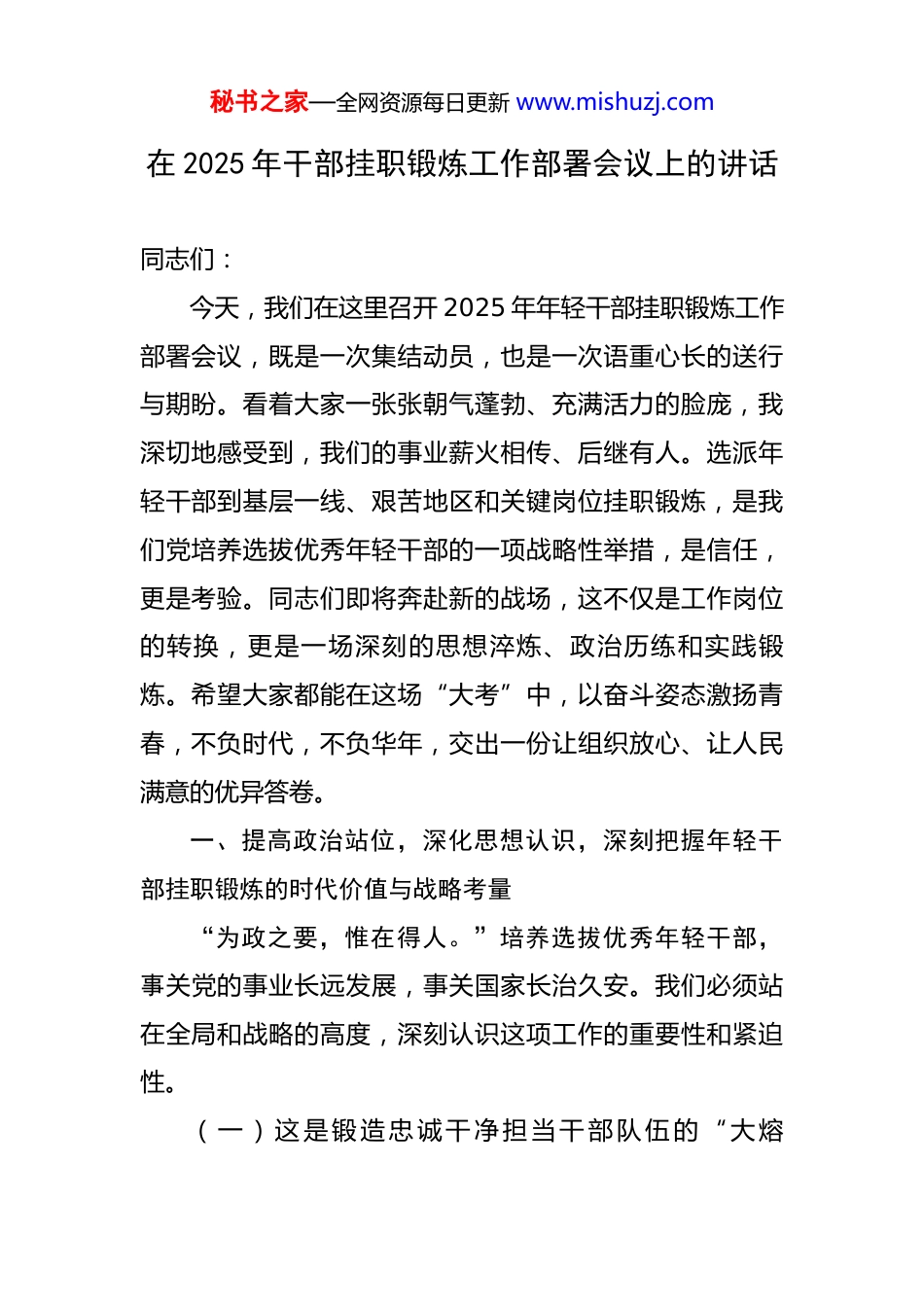 秘书之家—全网资源每日更新 www.mishuzj.com在 2025 年干部挂职锻炼工作部署会议上的讲话 同志们:今天,我们在这里召开 2025 年年轻干部挂职锻炼工作部署会议,既是一次集结动员,也是一次语重心长的送行与期盼。看着大家一张张朝气蓬勃、充满活力的脸庞,我深切地感受到,我们的事业薪火相传、后继有人。选派年轻干部到基层一线、艰苦地区和关键岗位挂职锻炼,是我们党培养选拔优秀年轻干部的一项战略性举措,是信任,更是考验。同志们即将奔赴新的战场,这不仅是工作岗位的转换,更是一场深刻的思想淬炼、政治历练和实践锻炼。希望大家都能在这场“大考”中,以奋斗姿态激扬青春,不负时代,不负华年,交出一份让组织放心、让人民满意的优异答卷。一、提高政治站位,深化思想认识,深刻把握年轻干部挂职锻炼的时代价值与战略考量“为政之要,惟在得人。”培养选拔优秀年轻干部,事关党的事业长远发展,事关国家长治久安。我们必须站在全局和战略的高度,深刻认识这项工作的重要性和紧迫性。(一)这是锻造忠诚干净担当干部队伍的“大熔秘书之家—全网资源每日更新 www.mishuzj.com炉”。温室里长不出参天大树,懈怠中练不出有为之才。实践反复证明,干部成长无捷径可走,经风雨、见世面才能壮筋骨、长才干。基层一线是矛盾问题最多、困难挑战最大的地方,也是最能考验干部、磨砺干部的地方。把年轻干部放到改革发展的主战场、维护稳定的第一线、服务群众的最前沿,就是要让大家在直面复杂局面、处理棘手问题的过程中,真刀真枪地锤炼党性,砥砺品格,不断提高政治判断力、政治领悟力、政治执行力。这既是组织的信任与厚望,也是大家实现自我超越、百炼成钢的必经之路。(二)这是推动高质量发展的“练兵场”。当前,我们正处在推进中国式现代化建设的关键时期,面临着一系列新形势、新任务、新挑战。无论是推动科技创新,还是促进区域协调发展;无论是全面推进乡村振兴,还是深化改革开放,都需要一大批政治过硬、本领高强的干部去攻坚克难。挂职锻炼就是这样一个“练兵场”,它为大家提供了一个将理论知识与实践经验深度融合的平台。在这里,大家可以近距离观察经济社会发展的脉动,亲身参与重大项目和重点工作的推进,学习和掌握做好新时代工作的新思路、新方法、新本领,从而成长为推动高质量发展的行家里手。秘书之家—全网资源每日更新 www.mishuzj.com(三)这是密切党同人民 群众血肉联系 的“连心桥”。“知屋漏者在宇下,知政失者在草野。”人民群众是我们的力量之源,也是我们工作的最高评判者。年轻干部长期在机关工作,容易对基层情况、群众疾苦了解不深、感受不真。通过挂职锻炼,大家能够真正沉下去,与群众同坐一条板凳,同吃一锅饭,听一听群众的家长里短,看一看群众的急难愁盼。这种“零距离”的接触,不仅能够帮助大家增进对人民群众的深厚感情,树立正确的群众观,更能让大家在为民解忧、为民造福的实践中,深刻理解“江山就是人民,人民就是江山”的千钧分量,从而使我们的各项决策和工作更接地气、更富民心。二、珍惜宝贵机遇,主动躬身入局,在基层一线和吃劲岗位上练就担当作为的过硬本领挂职锻炼的时光是短暂而宝贵的,如何让这段经历成为人生中浓墨重彩的一笔,关键在于同志们自身的努力和付出。希望大家都能以“主人翁”的姿态,而非“局外人”的眼光,全身心投入到新的工作和生活中去。(一)要在“信念之根”上深扎,做政治上的“明白人”。心中有信仰,脚下有力量。年轻干部第一位的要求就是政治上可靠。一是理论学习要“深”。要坚持把学习贯彻习近平新时代中国特色社会主义思想作为首要政治任秘书之家—全网资源每日更新 www.mishuzj.com务,读原著、学原文、悟原理,真正做到学思用贯通、知信行统一,不断筑牢信仰之基、补足精神之钙、把稳思想之舵。二是政治忠诚要“纯”。要深刻领悟“两个确立”的决定性意义,增强“四个意识”、坚定“四个自信”、做到“两个维护”,始终在思想上政治上行动上同以习近平同志为核心的党中央保持高度一致,确保在任何时候、任何情况下都经得起考验。(二)要在“能力之基”上夯实,做干事创业的...