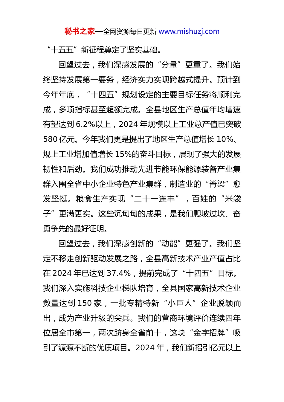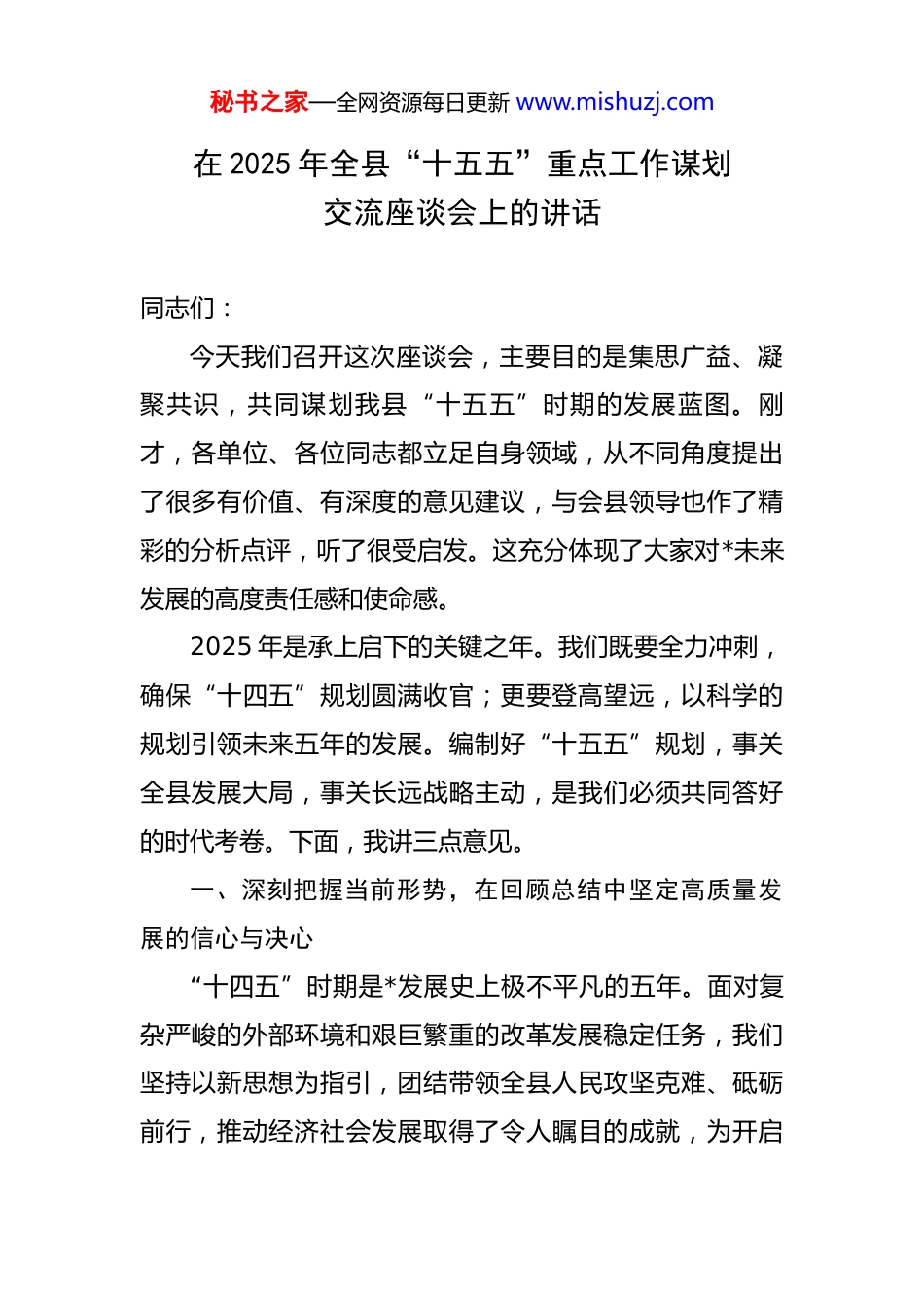 秘书之家—全网资源每日更新 www.mishuzj.com在 2025 年全县“十五五”重点工作谋划交流座谈会上的讲话 同志们:今天我们召开这次座谈会,主要目的是集思广益、凝聚共识,共同谋划我县“十五五”时期的发展蓝图。刚才,各单位、各位同志都立足自身领域,从不同角度提出了很多有价值、有深度的意见建议,与会县领导也作了精彩的分析点评,听了很受启发。这充分体现了大家对*未来发展的高度责任感和使命感。2025 年是承上启下的关键之年。我们既要全力冲刺,确保“十四五”规划圆满收官;更要登高望远,以科学的规划引领未来五年的发展。编制好“十五五”规划,事关全县发展大局,事关长远战略主动,是我们必须共同答好的时代考卷。下面,我讲三点意见。一、深刻把握当前形势,在回顾总结中坚定高质量发展的信心与决心“十四五”时期是*发展史上极不平凡的五年。面对复杂严峻的外部环境和艰巨繁重的改革发展稳定任务,我们坚持以新思想为指引,团结带领全县人民攻坚克难、砥砺前行,推动经济社会发展取得了令人瞩目的成就,为开启秘书之家—全网资源每日更新 www.mishuzj.com“十五五”新征程奠定了坚实基础。回望过去,我们深感发展的“分量”更重了。我们始终坚持发展第一要务,经济实力实现跨越式提升。预计到今年年底,“十四五”规划设定的主要目标任务将顺利完成,多项指标甚至超额完成。全县地区生产总值年均增速有望达到 6.2%以上,2024 年规模以上工业总产值已突破580 亿元。今年我们更是提出了地区生产总值增长 10%、规上工业增加值增长 15%的奋斗目标,展现了强大的发展韧性和后劲。我们成功推动先进节能环保能源装备产业集群入围全省中小企业特色产业集群,制造业的“脊梁”愈发坚挺。粮食生产实现“二十一连丰”,百姓的“米袋子”更满更实。这些沉甸甸的成果,是我们爬坡过坎、奋勇争先的最好证明。回望过去,我们深感创新的“动能”更强了。我们坚定不移走创新驱动发展之路,全县高新技术产业产值占比在 2024 年已达到 37.4%,提前完成了“十四五”目标。我们深入实施科技企业梯队培育,全县国家高新技术企业数量达到 150 家,一批专精特新“小巨人”企业脱颖而出,成为产业升级的尖兵。我们的营商环境评价连续四年位居全市第一,两次跻身全省前十,这块“金字招牌”吸引了源源不断的优质项目。2024 年,我们新招引亿元以上秘书之家—全网资源每日更新 www.mishuzj.com项目 123 个,其中 10 亿元以上项目达到 9 个,项目建设连续四年领跑全市,为未来发展积蓄了磅礴力量。回望过去,我们深感民生的“温度”更暖了。我们始终坚持以人民为中心,发展成果更多更公平惠及全体人民。城乡居民人均可支配收入增幅与经济增长基本同步,2024 年农村居民收入增速更是快于城镇居民,城乡差距持续缩小。累计 32 件 100 项民生实事全面落地,覆盖了教育、医疗、养老、交通等方方面面。我们以前所未有的力度推进生态文明建设,完成了开发区污水分质处理、实施了“三湖”水生态环境综合治理等系列工程,天更蓝、水更清、地更绿的生态画卷正在*大地徐徐展开。在肯定成绩的同时,我们必须清醒地认识到前进道路上的挑战和自身存在的不足。对标高质量发展的要求,我们的问题依然突出:一是产业结构仍需优化。工业主导产业链条还不够长,先进制造业的增量支撑尚显不足,产业集群的协同效应有待进一步发挥。二是创新转化仍有瓶颈。科技成果向新质生产力转化的通道还不够顺畅,部分环节存在堵点卡点。三是现代服务业仍是短板。软件信息、科技服务等生产性服务业发展不快,对经济的贡献度偏弱。四是资源优势转化不充分。生态、文化等独特资源优势,还未完全转化为实实在在的发展优势和竞争优势。秘书之家—全网资源每日更新 www.mishuzj.com这些问题,既是我们面临的挑战,更是我们“十五五”期间必须集中力量攻克的重点。二、精准锚定主攻方向,在战略谋划中擘画高质量发展的宏伟蓝图谋划“十五五”,必须胸怀“国之大者”,准确把握新发展阶段,深入贯彻新发展理念,主动融入新发展格局。我们要把*的发展放到全国、全省、全市的大棋局中去考量,确保我们的规...