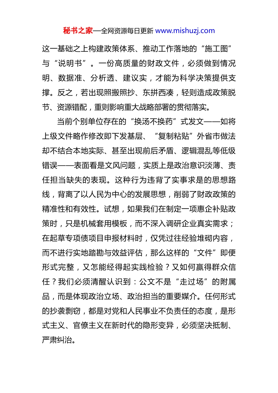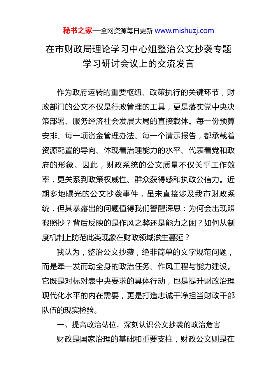 秘书之家—全网资源每日更新 www.mishuzj.com在市财政局理论学习中心组整治公文抄袭专题学习研讨会议上的交流发言 作为政府运转的重要枢纽、政策执行的关键环节,财政部门的公文不仅是行政管理的工具,更是落实党中央决策部署、服务经济社会发展大局的直接载体。每一份预算安排、每一项资金管理办法、每一个请示报告,都承载着资源配置的导向、体现着治理能力的水平、代表着党和政府的形象。因此,财政系统的公文质量不仅关乎工作效率,更关系到政策权威性、群众获得感和执政公信力。近期多地曝光的公文抄袭事件,虽未直接涉及我市财政系统,但其暴露出的问题值得我们警醒深思:为何会出现照搬照抄?背后反映的是作风之弊还是能力之困?如何从制度机制上防范此类现象在财政领域滋生蔓延?我认为,整治公文抄袭,绝非简单的文字规范问题,而是牵一发而动全身的政治任务、作风工程与能力建设。它既是对标对表中央要求的具体行动,也是提升财政治理现代化水平的内在需要,更是打造忠诚干净担当财政干部队伍的现实检验。一、提高政治站位,深刻认识公文抄袭的政治危害财政是国家治理的基础和重要支柱,财政公文则是在秘书之家—全网资源每日更新 www.mishuzj.com这一基础之上构建政策体系、推动工作落地的“施工图”与“说明书”。一份高质量的财政文件,必须做到情况明、数据准、分析透、建议实,才能为科学决策提供支撑。反之,若出现照搬照抄、东拼西凑,轻则造成政策脱节、资源错配,重则影响重大战略部署的贯彻落实。当前个别单位存在的“换汤不换药”式发文——如将上级文件略作修改即下发基层、“复制粘贴”外省市做法却不结合本地实际、甚至出现前后矛盾、逻辑混乱等低级错误——表面看是文风问题,实质上是政治意识淡薄、责任担当缺失的表现。这种行为违背了实事求是的思想路线,背离了以人民为中心的发展思想,削弱了财政政策的精准性和有效性。试想,如果我们在制定一项惠企补贴政策时,只是机械套用模板,而不深入调研企业真实需求;在起草专项债项目申报材料时,仅凭过往经验堆砌内容,而不进行实地踏勘与效益评估,那么这样的“文件”即便形式完整,又怎能经得起实践检验?又如何赢得群众信任?我们必须清醒认识到:公文不是“走过场”的附属品,而是体现政治立场、政治担当的重要媒介。任何形式的抄袭剽窃,都是对党和人民事业不负责任的态度,是形式主义、官僚主义在新时代的隐形变异,必须坚决抵制、严肃纠治。秘书之家—全网资源每日更新 www.mishuzj.com二、坚持问题导向,全面排查财政系统公文风险隐患近年来,我局持续推进规范化建设,在文件审核、流程管理等方面建立了较为完善的制度体系。但从日常督查和内部审计反馈来看,仍存在一些苗头性、倾向性问题值得关注:一是部分科室存在“以转代办”现象。接到上级通知后,未经充分研究转化,便直接转发或稍作调整即印发,缺乏针对本市财政运行特点的个性化设计与操作路径,导致政策落地“水土不服”。二是部分规范性文件论证不足。在出台新的专项资金管理办法、绩效评价指标体系时,未能广泛征求相关单位、专家和公众意见,也未开展必要的风险评估与合规审查,存在照搬省级或其他城市模式的现象,缺乏创新性和适配性。三是部分汇报材料空话套话多。在向上级报送工作总结、专题报告时,习惯使用泛化表述、堆砌术语,缺少具体数据支撑和典型案例佐证,难以真实反映工作成效与存在问题。四是少数干部写作能力薄弱。面对繁重工作任务,个别同志产生畏难情绪,依赖网络搜索、模板套用完成材料撰写,久而久之形成惰性思维,丧失独立思考与表达能力。这些问题虽未构成典型意义上的“抄袭”,但已显现出文风浮躁、作风漂浮的端倪。我们必须引以为戒,把整治公文质量问题作为加强机关作风建设的重要抓手,聚焦秘书之家—全网资源每日更新 www.mishuzj.com重点领域、关键环节,开展一次全方位“体检”,建立问题台账,明确整改时限,实行闭环管理。三、强化制度约束,健全公文全链条管理机制根治公文抄袭顽疾,不能仅靠一时整治,更要靠长效机制保障。建议从以下四个方面发力:一是严把“源头关”,压实起草责任。明确各...