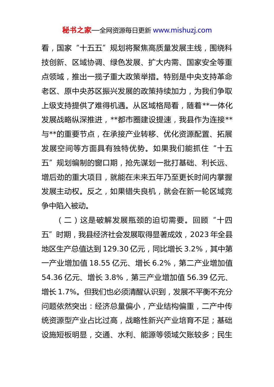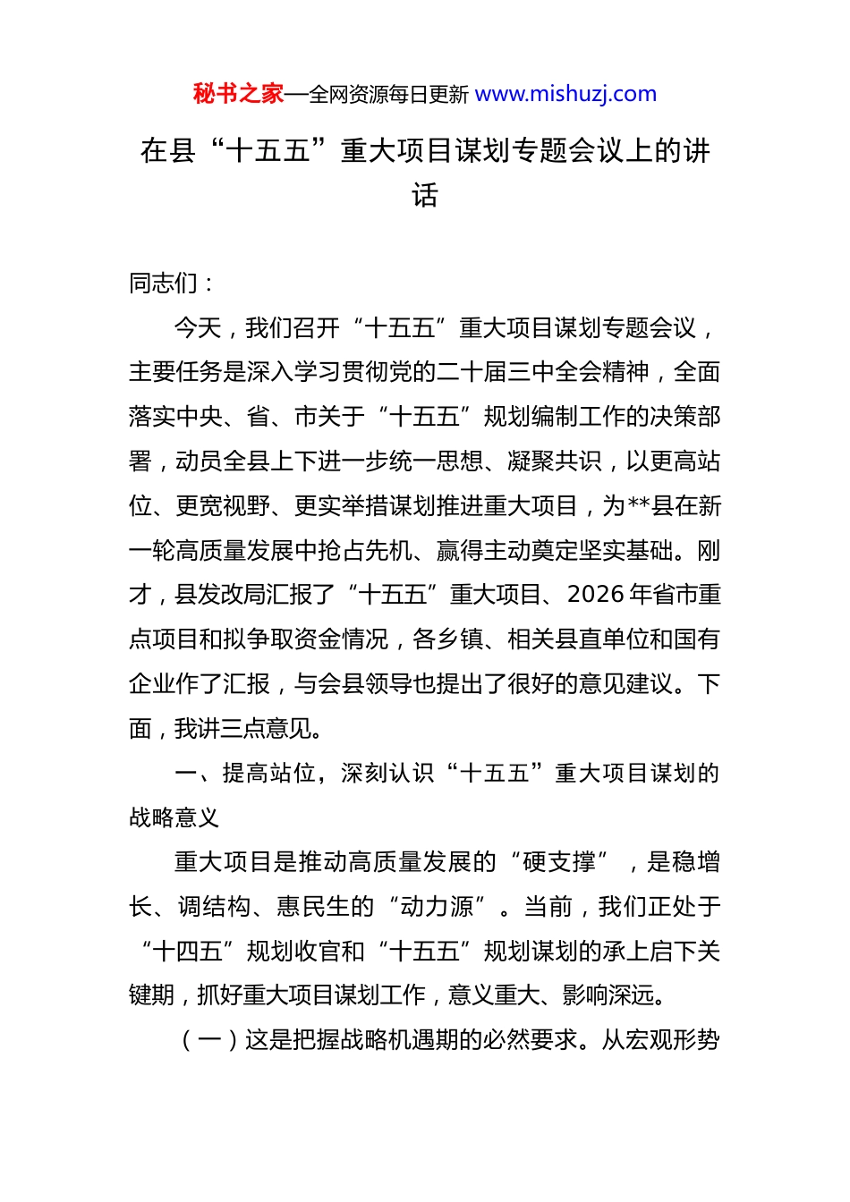 秘书之家—全网资源每日更新 www.mishuzj.com在县“十五五”重大项目谋划专题会议上的讲话 同志们:今天,我们召开“十五五”重大项目谋划专题会议,主要任务是深入学习贯彻党的二十届三中全会精神,全面落实中央、省、市关于“十五五”规划编制工作的决策部署,动员全县上下进一步统一思想、凝聚共识,以更高站位、更宽视野、更实举措谋划推进重大项目,为**县在新一轮高质量发展中抢占先机、赢得主动奠定坚实基础。刚才,县发改局汇报了“十五五”重大项目、2026 年省市重点项目和拟争取资金情况,各乡镇、相关县直单位和国有企业作了汇报,与会县领导也提出了很好的意见建议。下面,我讲三点意见。一、提高站位,深刻认识“十五五”重大项目谋划的战略意义重大项目是推动高质量发展的“硬支撑”,是稳增长、调结构、惠民生的“动力源”。当前,我们正处于“十四五”规划收官和“十五五”规划谋划的承上启下关键期,抓好重大项目谋划工作,意义重大、影响深远。(一)这是把握战略机遇期的必然要求。从宏观形势秘书之家—全网资源每日更新 www.mishuzj.com看,国家“十五五”规划将聚焦高质量发展主线,围绕科技创新、区域协调、绿色发展、扩大内需、国家安全等重点领域,推出一揽子重大政策举措。特别是中央支持革命老区、原中央苏区振兴发展的政策持续加力,为我们争取上级支持提供了难得机遇。从区域格局看,随着**一体化发展战略纵深推进,**都市圈建设提速,我县作为连接**与**的重要节点,在承接产业转移、优化资源配置、拓展发展空间等方面具有独特优势。如果我们能抓住“十五五”规划编制的窗口期,抢先谋划一批打基础、利长远、增后劲的重大项目,就能在未来五年乃至更长时间内掌握发展主动权。反之,如果错失良机,就会在新一轮区域竞争中陷入被动。(二)这是破解发展瓶颈的迫切需要。回顾“十四五”时期,我县经济社会发展取得显著成效,2023 年全县地区生产总值达到 129.30 亿元,同比增长 3.2%,其中第一产业增加值 18.55 亿元、增长 6.2%,第二产业增加值54.36 亿元、增长 3.8%,第三产业增加值 56.39 亿元、增长 1.7%。但我们也必须清醒认识到,发展不平衡不充分问题依然突出:经济总量偏小,产业结构偏重,二产中传统资源型产业占比过高,战略性新兴产业培育不足;基础设施短板明显,交通、水利、能源等领域欠账较多;民生秘书之家—全网资源每日更新 www.mishuzj.com保障水平与群众期盼仍有差距,教育、医疗、养老等公共服务供给不足;要素保障能力较弱,土地、资金、人才等制约因素依然突出。这些问题,都要靠项目来破解、靠投资来拉动、靠发展来解决。谋划好“十五五”重大项目,就是为我们破解发展瓶颈、补齐短板弱项提供“金钥匙”。(三)这是赢得未来发展优势的制胜之举。当前,区域竞争说到底就是项目竞争,特别是重大产业项目、重大基础设施项目的竞争。周边各县市都在抢抓机遇、大干快上,呈现出千帆竞发、百舸争流的激烈态势。如果我们不超前谋划、不主动发力,就会在区域发展中掉队落伍。必须树牢“项目为王”理念,以项目看实绩、以项目比高下、以项目论英雄,通过谋划实施一批投资规模大、科技含量高、带动能力强的重大项目,构筑起支撑高质量发展的“四梁八柱”,为**县未来发展抢占制高点、赢得新优势。二、聚焦重点,准确把握项目谋划的主攻方向做好“十五五”重大项目谋划,必须坚持系统思维、战略思维,紧扣国家大政方针,立足**县情实际,突出“四个聚焦”:(一)聚焦政策导向,在精准对接上下功夫。中央秘书之家—全网资源每日更新 www.mishuzj.com“十五五”规划建议明确提出要构建现代化基础设施体系、建设现代化产业体系、推动区域协调发展、推进绿色低碳发展等重点任务。这是我们谋划项目的“指南针”和“导航仪”。一要深入研究政策。县发改局要牵头组织专班,系统梳理国家、省、市“十五五”规划思路,建立政策清单、项目清单、责任清单,精准把握投资方向和支持重点。特别是要盯紧盯牢科技创新、产业升级、基础设施、生态环保、社会民生、安全保障六大领域,做到政策通、方向明、路子对。二要积极对接上级。各...