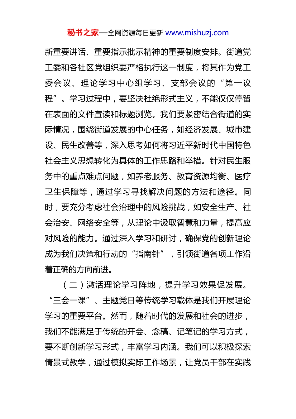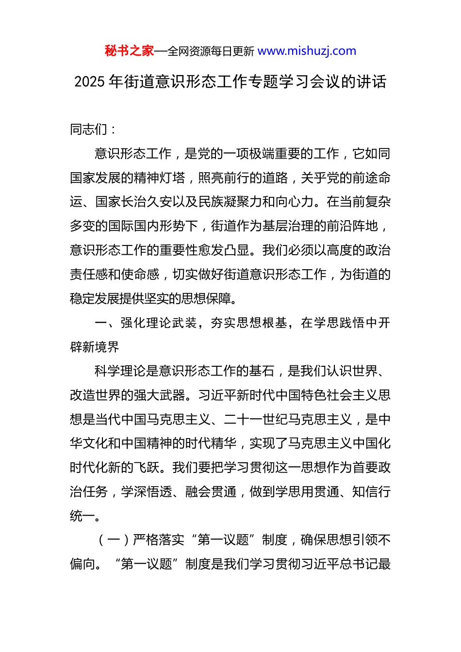 秘书之家—全网资源每日更新 www.mishuzj.com2025 年街道意识形态工作专题学习会议的讲话 同志们:意识形态工作,是党的一项极端重要的工作,它如同国家发展的精神灯塔,照亮前行的道路,关乎党的前途命运、国家长治久安以及民族凝聚力和向心力。在当前复杂多变的国际国内形势下,街道作为基层治理的前沿阵地,意识形态工作的重要性愈发凸显。我们必须以高度的政治责任感和使命感,切实做好街道意识形态工作,为街道的稳定发展提供坚实的思想保障。一、强化理论武装,夯实思想根基,在学思践悟中开辟新境界科学理论是意识形态工作的基石,是我们认识世界、改造世界的强大武器。习近平新时代中国特色社会主义思想是当代中国马克思主义、二十一世纪马克思主义,是中华文化和中国精神的时代精华,实现了马克思主义中国化时代化新的飞跃。我们要把学习贯彻这一思想作为首要政治任务,学深悟透、融会贯通,做到学思用贯通、知信行统一。(一)严格落实“第一议题”制度,确保思想引领不偏向。“第一议题”制度是我们学习贯彻习近平总书记最秘书之家—全网资源每日更新 www.mishuzj.com新重要讲话、重要指示批示精神的重要制度安排。街道党工委和各社区党组织要严格执行这一制度,将其作为党工委会议、理论学习中心组学习、支部会议的“第一议程”。学习过程中,要坚决杜绝形式主义,不能仅仅停留在表面的文件宣读和标题浏览。我们要紧密结合街道的实际情况,围绕街道发展的中心任务,如经济发展、城市建设、民生改善等,深入思考如何将习近平新时代中国特色社会主义思想转化为具体的工作思路和举措。针对民生服务中的重点难点问题,如养老服务、教育资源均衡、医疗卫生保障等,通过学习寻找解决问题的方法和途径。同时,要充分考虑社会治理中的风险挑战,如安全生产、社会治安、网络安全等,从理论中汲取智慧和力量,提高应对风险的能力。通过深入学习和研讨,确保党的创新理论成为我们决策和行动的“指南针”,引领街道各项工作沿着正确的方向前进。(二)激活理论学习阵地,提升学习效果促发展。“三会一课”、主题党日等传统学习载体是我们开展理论学习的重要平台。然而,随着时代的发展和社会的进步,我们不能满足于传统的开会、念稿、记笔记的学习方式,要不断创新学习形式,丰富学习内涵。我们可以积极探索情景式教学,通过模拟实际工作场景,让党员干部在实践秘书之家—全网资源每日更新 www.mishuzj.com中体验和理解理论知识。例如,在社区治理中,模拟矛盾纠纷调解场景,让党员干部运用所学的群众工作方法和理论知识进行处理,提高他们的实际工作能力。案例式分析也是一种有效的学习方法,我们可以选取街道或其他地区的典型案例,组织党员干部进行深入分析,从中总结经验教训,提升解决实际问题的能力。互动式研讨则可以激发党员干部的学习积极性和主动性,让他们在交流和讨论中相互启发,深化对理论知识的理解。为了确保学习效果,我们要加强对学习效果的检验。可以定期组织知识竞赛,检验党员干部对理论知识的掌握程度。开展心得交流活动,让党员干部分享学习心得和体会,促进共同提高。同时,通过实践成果展示,将学习成果转化为实际工作成效,如展示社区环境改善、民生项目推进等方面的成果,让党员干部看到学习带来的实际效果,从而激发他们的学习热情和工作动力。(三)推动理论宣讲普及,让党的声音传遍大街小巷。理论的价值在于指导实践,而要让理论发挥作用,就必须让广大群众了解和掌握。我们要持续推动理论宣讲的分众化、精准化、通俗化,让党的理论政策“飞入寻常百姓家”。首先,要组建一支多元化的宣讲队伍。这支队伍可以由领导干部、社区书记、先进典型、退休老党员等组秘书之家—全网资源每日更新 www.mishuzj.com成。领导干部具有较高的理论水平和政策解读能力,能够为群众准确传达党的方针政策;社区书记熟悉社区情况,了解群众需求,能够用通俗易懂的语言将理论知识与社区实际相结合;先进典型具有榜样示范作用,他们的亲身经历和事迹能够更生动地诠释理论内涵;退休老党员具有丰富的人生阅历和群众基础,能够与群众建立良好的沟通和互动。针对不同群...
