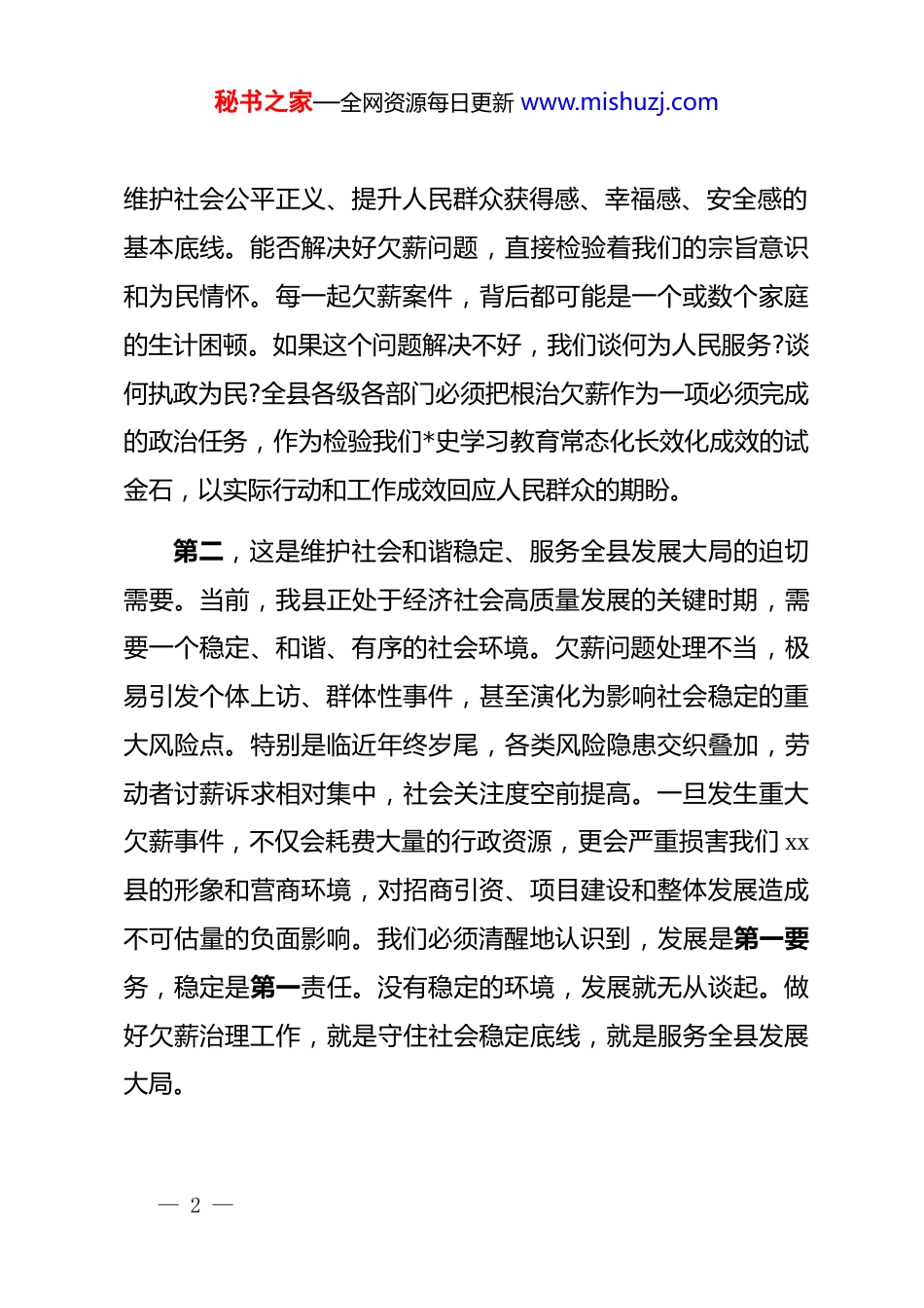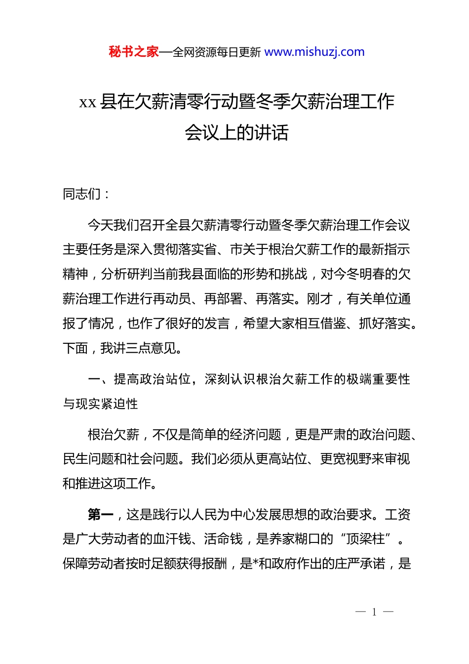 秘书之家—全网资源每日更新 www.mishuzj.comxx 县在欠薪清零行动暨冬季欠薪治理工作会议上的讲话同志们:今天我们召开全县欠薪清零行动暨冬季欠薪治理工作会议主要任务是深入贯彻落实省、市关于根治欠薪工作的最新指示精神,分析研判当前我县面临的形势和挑战,对今冬明春的欠薪治理工作进行再动员、再部署、再落实。刚才,有关单位通报了情况,也作了很好的发言,希望大家相互借鉴、抓好落实。下面,我讲三点意见。一、提高政治站位,深刻认识根治欠薪工作的极端重要性与现实紧迫性根治欠薪,不仅是简单的经济问题,更是严肃的政治问题、民生问题和社会问题。我们必须从更高站位、更宽视野来审视和推进这项工作。第一,这是践行以人民为中心发展思想的政治要求。工资是广大劳动者的血汗钱、活命钱,是养家糊口的“顶梁柱”。保障劳动者按时足额获得报酬,是*和政府作出的庄严承诺,是— 1 —秘书之家—全网资源每日更新 www.mishuzj.com维护社会公平正义、提升人民群众获得感、幸福感、安全感的基本底线。能否解决好欠薪问题,直接检验着我们的宗旨意识和为民情怀。每一起欠薪案件,背后都可能是一个或数个家庭的生计困顿。如果这个问题解决不好,我们谈何为人民服务?谈何执政为民?全县各级各部门必须把根治欠薪作为一项必须完成的政治任务,作为检验我们*史学习教育常态化长效化成效的试金石,以实际行动和工作成效回应人民群众的期盼。第二,这是维护社会和谐稳定、服务全县发展大局的迫切需要。当前,我县正处于经济社会高质量发展的关键时期,需要一个稳定、和谐、有序的社会环境。欠薪问题处理不当,极易引发个体上访、群体性事件,甚至演化为影响社会稳定的重大风险点。特别是临近年终岁尾,各类风险隐患交织叠加,劳动者讨薪诉求相对集中,社会关注度空前提高。一旦发生重大欠薪事件,不仅会耗费大量的行政资源,更会严重损害我们 xx县的形象和营商环境,对招商引资、项目建设和整体发展造成不可估量的负面影响。我们必须清醒地认识到,发展是第一要务,稳定是第一责任。没有稳定的环境,发展就无从谈起。做好欠薪治理工作,就是守住社会稳定底线,就是服务全县发展大局。— 2 —秘书之家—全网资源每日更新 www.mishuzj.com第三,这是推进治理体系和治理能力现代化的必然选择。欠薪问题成因复杂,涉及领域广,利益链条长,仅靠单一部门、传统手段难以根治。这要求我们必须运用系统思维,坚持标本兼治,在制度建设、协同机制、技术赋能、信用约束等方面综合施策。近年来,国家相继出台《保障农民工工资支付条例》等一系列法律法规,为我们提供了坚实的法律武器。我们要以此为契机,全面规范企业劳动用工管理,完善工资支付保障制度,健全欠薪预警监控机制,强化失信联合惩戒,推动欠薪治理从“事后处置”向“事前预防、事中监管、事后惩戒”全链条转变,不断提升我县社会治理的现代化水平。二、正视问题挑战,准确把握当前欠薪治理工作的严峻形势与薄弱环节过去一年,在县委、县政府的坚强领导下,在各乡镇、各部门的共同努力下,我县根治欠薪工作取得了一定成效。我们累计为 2000 余名劳动者追回工资待遇超过 3000 万元,全县欠薪案件数量、涉及人数和金额同比分别下降了 15%、20%和18%,未发生重大群体性事件和极端个人事件,成绩值得肯定。但是,我们绝不能有丝毫的松懈和麻痹,必须清醒地看到,当前我县欠薪治理工作面临的形势依然严峻,存在的短板和问题— 3 —秘书之家—全网资源每日更新 www.mishuzj.com依然突出。一是存量风险尚未清仓见底,部分案件化解难度大。虽然整体案件数量在下降,但一些历史遗留问题、积案难案尚未得到根本解决。特别是涉及工程款拨付不到位、企业破产、层层转包、包工头失联等复杂因素的欠薪案件,协调处理难度极大,周期很长。一些项目资金链紧张,支付能力不足,导致工资支付风险始终存在,随时可能爆发。二是重点行业领域监管仍有盲区,制度执行不够到位。工程建设领域仍然是欠薪问题的“重灾区”。尽管我们大力推行实名制管理、工资专用账户、总包代发工资等制度,但在实际执行中,一些项目存在“假实名、真空转”...